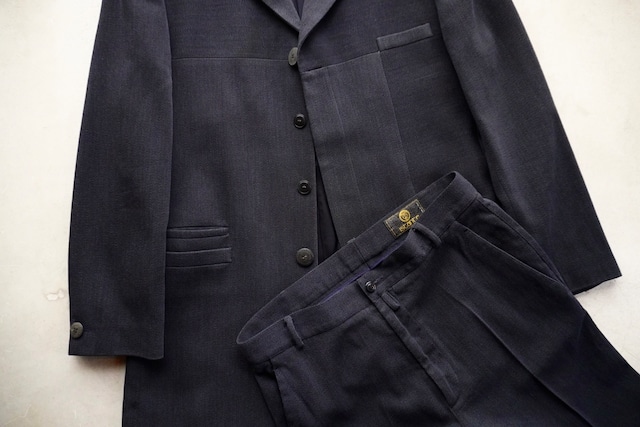 1990年代 本国イタリア製のistante 滑らかな手触りの上質なピュアウールボディ。 黒にも近いチャコールベースに赤のステッチが乗せられた、静かな主張のあるファブリックデザイン。 トップボタン/裾ボタンが露出した、独特な仕様の比翼の前立て。 縦横の生地使いによる、左右非対称の生地継ぎデザイン。 適度な余白を持たせつつもやや細身な、メリハリのある綺麗なシルエットバランス。 クラシカルなドレスウェアにおいての、遊びの効いたディテール達。 デザイナーGIANNI VERSACEの影響を強く感じられる、 街着としても活躍するセットアップスーツです。 Product descriptions are also available in English, so if there's anything you're interested in, please feel free to contact us! If you send us a DM on Instagram, we'll respond as soon as possible:) 〔measurement〕 length (着丈):79cm shoulder width (肩幅):50.5cm pit to pit (身幅):59cm sleeve length (袖丈):57.5cm waist(ウエスト):85cm rise(股上):29.5cm inseam(股下):77cm out seam(アウトシーム全長):103.5cm thigh width(渡幅):32.5cm leg opening(裾幅):18.5cm 〔condition〕 8/10 ライニングに画像の様な小傷、ボトムスのフロントジップに少しの歪みがございますが問題なく機能します。 いずれも着用時に目立つ物ではございませんが、神経質な方はよくご検討くださいませ。 There is a small scratch on the lining as shown in the image, and the front zip of the bottoms is slightly distorted, but it functions without any problems.