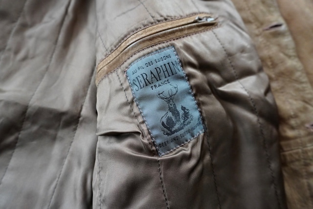 1990年代のSERAPHIN カーキのリブニットに革生地が重なる、小ぶりで特殊な形状の襟。 ステッチが映える胸ポケットに、裾は小さなマチが付くパッチポケットの仕様。 両腰は共生地のベルトアジャスター。 細かな3本のダーツで少しずつ窄められた、丸みを帯びたワイドスリーブ。 当店では初の入荷となるこのラベル。 普段意識して探している訳ではなく、こちらはデザインに惹かれてピックするとまさかのこのラベルでした。 ネームは気持ち程度しか乗せていない、お得感のあるプライスで紹介できると思いますので、この機会にぜひご検討くださいませ:) Product descriptions are also available in English, so if there's anything you're interested in, please feel free to contact us! If you send us a DM on Instagram, we'll respond as soon as possible:) 〔measurement〕 length (着丈):78.5cm shoulder width (肩幅):61cm pit to pit (身幅):61cm sleeve length (袖丈):51.5cm sleeve length (裄丈):85cm (↑from the center of the neck) 〔condition〕 7/10 画像の様な小傷、少しの薄汚れがございます。 いずれも着用時に目立つ物ではございませんが、神経質な方はよくご検討くださいませ。 There are small scratches and light stains as shown in the images.