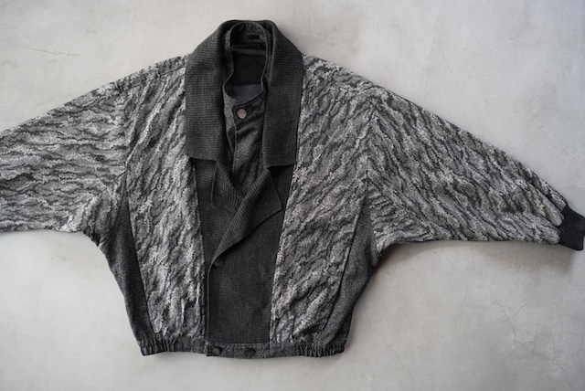 1990年代頃のマイナーレーベルの物。 タグが外され国籍等の詳細は不明ですが、生地感やデザインから恐らくイタリア辺りのユーロ物ではないかと推測します。 動きのあるモノトーンのジャガード生地に、 色調の合わされた柔らかなニット生地の切り替え。 身幅/アーム幅共に大きく取られた丸みを帯びたワイドシルエット。 比翼のカラーレス×ニットラペルのダブルブレストのレイヤードデザイン。 ボディは恐らくピュアウール、もしくは少量の化繊混じりのウール生地だと推測します。 デザイン性、クオリティ共に素晴らしいお気に入りの一着です。 Product descriptions are also available in English, so if there's anything you're interested in, please feel free to contact us! If you send us a DM on Instagram, we'll respond as soon as possible:) 〔measurement〕 length (着丈):68cm shoulder width (肩幅):60cm pit to pit (身幅):65cm sleeve length (袖丈):55.5cm sleeve length (裄丈):88.5cm (↑from the center of the neck) 〔condition〕 8/10 画像の様な小傷、少しの薄汚れがございます。 いずれも着用時に目立つ物ではございませんが、神経質な方はよくご検討くださいませ。 There are small scratches and light stains as shown in the images.