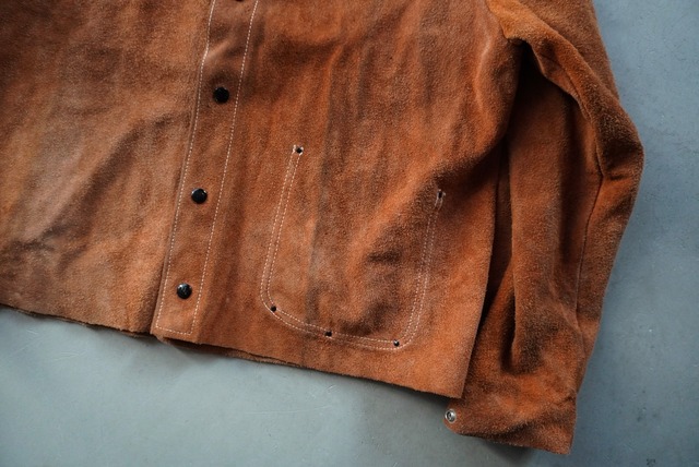 1990-2000年代頃のアメリカのウェルダージャケット。 たっぷり肉厚なスウェードレザーの一枚地。 ブラックカラーのスナップ/リベットが映える、むらのあるブラウンカラー。 このアイテムでは珍しいレギュラーカラー。 シェルにステッチのみが露出する、左前裾のみの内ポケット。 身幅≒着丈の実寸XL程のワイドシルエット(着丈65.5cm/身幅62cm) 色やサイズ、ディテールまで素晴らしい、しっかりファッションが出来る個体。 この生地ならではの迫力は、街着として作られた洋服とは全くの別物です。 Product descriptions are also available in English, so if there's anything you're interested in, please feel free to contact us! If you send us a DM on Instagram, we'll respond as soon as possible:) 〔measurement〕 length (着丈):65.5cm shoulder width (肩幅):50.5cm pit to pit (身幅):63cm sleeve length (袖丈):63.5cm 〔condition〕 6/10 画像の様な小傷や少しの薄汚れ、レザー生地特有の少しの歪みがございます。 いずれも着用時に目立つ物ではございませんが、神経質な方はよくご検討くださいませ。 There are small scratches, light stains and distortion of fabric unique to leather fabric as shown in the images.