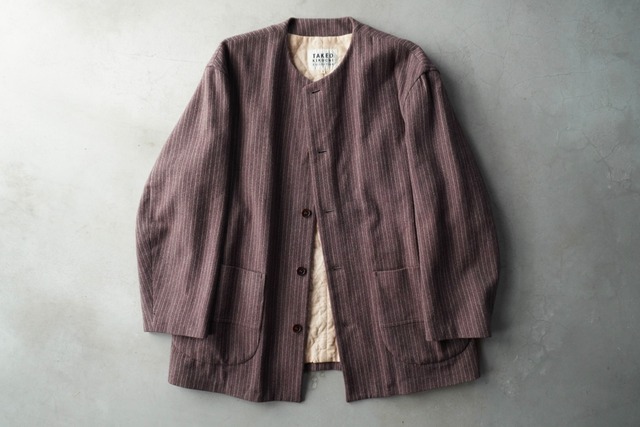 1990年代のTAKEO KIKUCHI このラベルの古い個体の中でも特に良いと思えるデザイン性、 シェイプがかからないワイドシルエットのテーラードカバーオールスタイルが気に入り、当店では初めて買い付けました。 赤みのあるブラウンのウールシェルに、薄い中綿入りの柔らかなコットンのキルトライニング。 形の良いカラーレスデザイン、丸みを帯びたフロントポケット。 袖裏はキュプラで切り替えられたドレスな仕様。 身幅/アーム幅共に大きく取られた余白のあるリラックスシルエット。 適当に羽織っても様になるこのラベルのトップピースです。 Product descriptions are also available in English, so if there's anything you're interested in, please feel free to contact us! If you send us a DM on Instagram, we'll respond as soon as possible:) 〔measurement〕 length (着丈):78cm shoulder width (肩幅):52cm pit to pit (身幅):61.5cm sleeve length (袖丈):57.5cm 〔condition〕 7/10 画像の様な小傷や少しの薄汚れ、小さな補修跡がございます。 いずれも着用時に目立つ物ではございませんが、神経質な方はよくご検討くださいませ。 There are small scratches, light stains and natural repair marks as shown in the images.