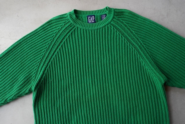 1990年代のGAP 柔らかな手触りのたっぷり肉厚なコットンニットによる、発色の良いグリーンのボディカラー。 凹凸のあるリブ編み、形の良いラグランスリーブ仕様。 通常この編み方ではシルエットが縦長になる印象ですが、こちらは丸みを帯びたXL表記のワイドシルエット。 さらっと一枚でも、インナー使いでも様になる一枚。 探して見つからない所だと思います。 Product descriptions are also available in English, so if there's anything you're interested in, please feel free to contact us! If you send us a DM on Instagram, we'll respond as soon as possible:) 〔measurement〕 length (着丈):74cm pit to pit (身幅):60.5cm sleeve length (裄丈):90.5cm (↑from the center of the neck) 〔condition〕 8/10 画像の様な小傷、少しの薄汚れがございます。 いずれも着用時に目立つ物ではございませんが、神経質な方はよくご検討くださいませ。 There are small scratches and light stains as shown in the images.