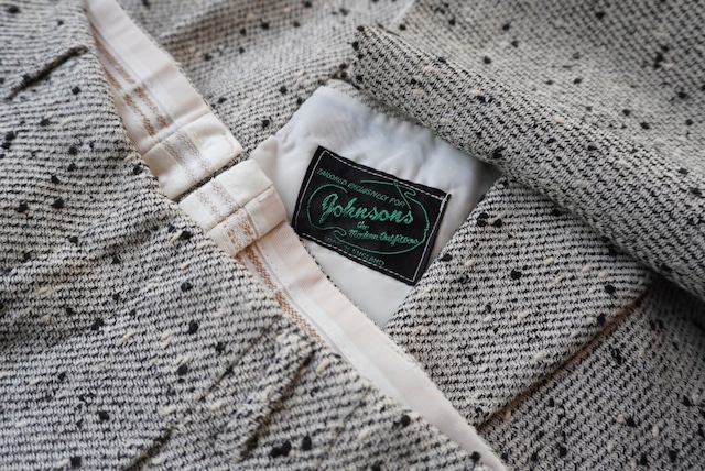 1980年代、本国イングランド製のJohnsons このラベルが大好きなイギリスの友人から譲り受けました。 イギリスの国内外問わず、古い物は市場に殆ど現れず、 ディーラー/コレクター等の個人からでないと中々出会えないラベルだそうです。 ライトグレーベースに黒/アイボリーのネップが飛んだ素晴らしい表情。 ずっしり高密度に織られた、柔らかくも少しの弾みのあるウールボディ。 ジャケットはダブルブレスト。 深めの股上/広い渡りから絞りがかかる、形の良いワイドテーパードシルエット。 男性的かつ優美なモノトーンのネップ生地。 このラベルらしい、50sロカビリーテイストな生地/シルエットバランス。 物としても非常に珍しい、スペシャルピースです。 Product descriptions are also available in English, so if there's anything you're interested in, please feel free to contact us! If you send us a DM on Instagram, we'll respond as soon as possible:) 〔measurement〕 length (着丈):79cm shoulder width (肩幅):47.5cm pit to pit (身幅):54.5cm sleeve length (袖丈):65cm waist(ウエスト):82cm rise(股上):37cm inseam(股下):78cm out seam(アウトシーム全長):110cm thigh width(渡幅):36cm leg opening(裾幅):23cm 〔condition〕 8/10 画像の様な小傷、少しの薄汚れがございます。 いずれも着用時に目立つ物ではございませんが、神経質な方はよくご検討くださいませ。 There are small scratches and light stains as shown in the images.