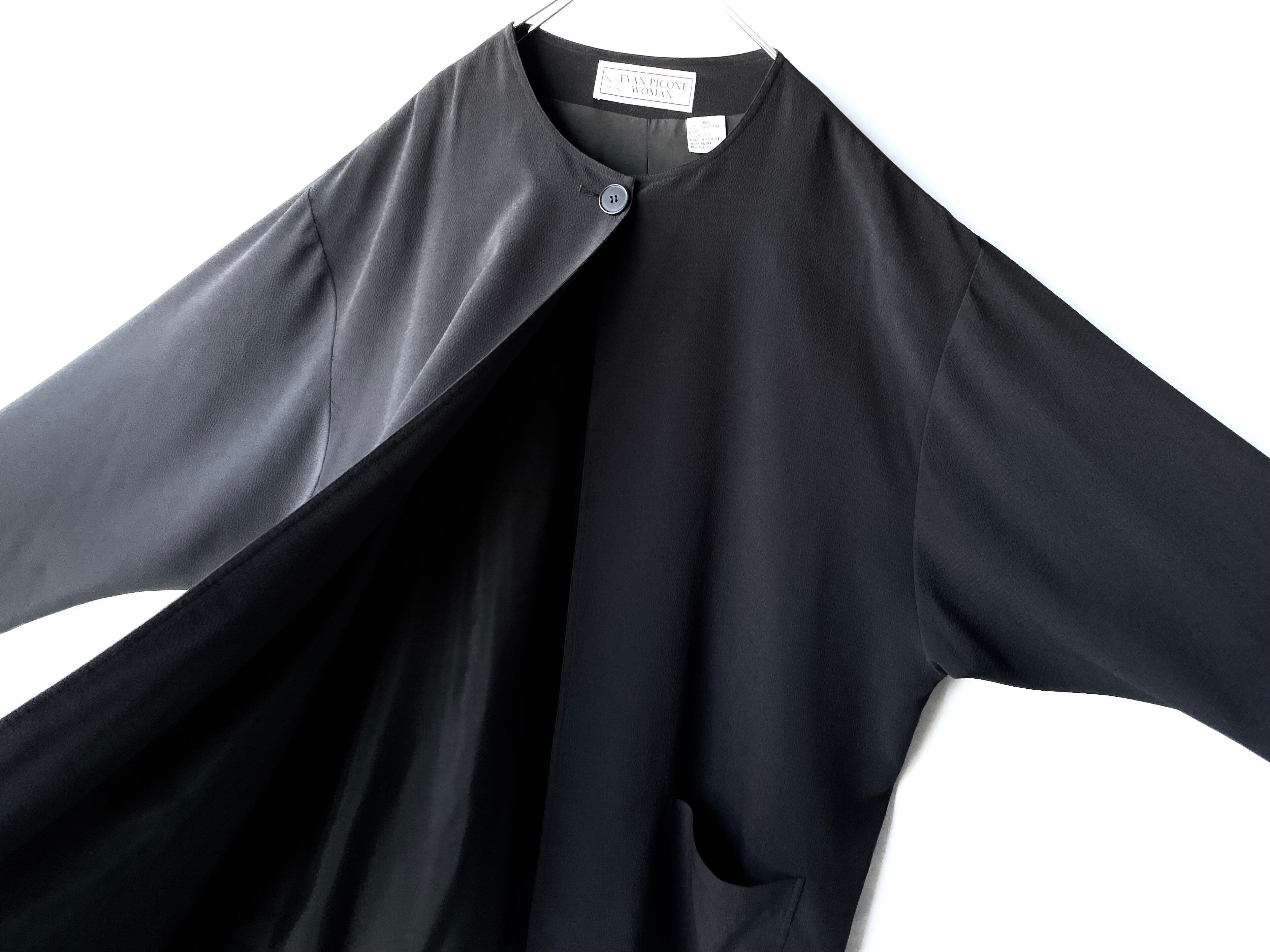 トップボタンのみで留まる、カラーレスの羽織りコート。