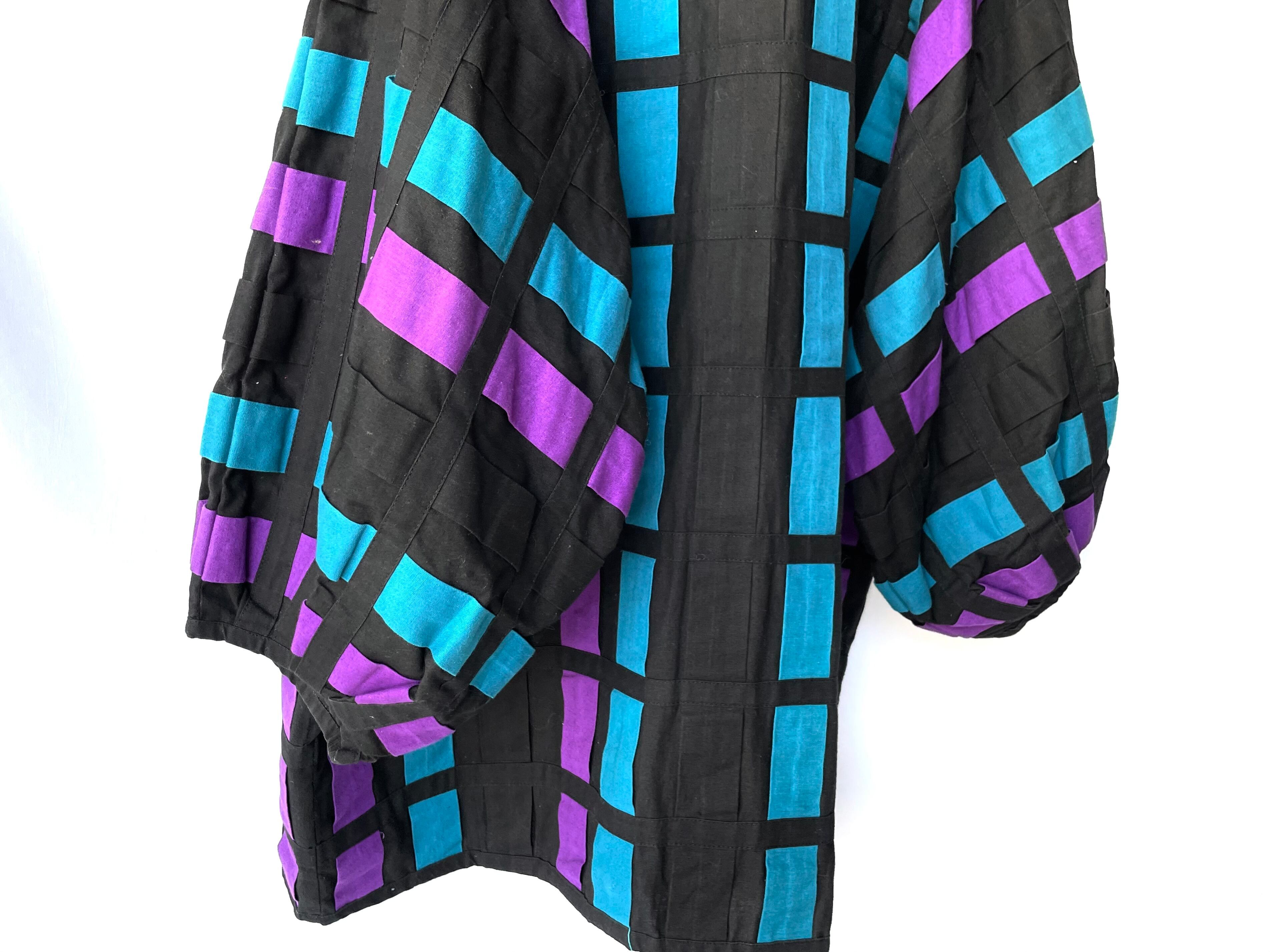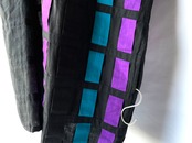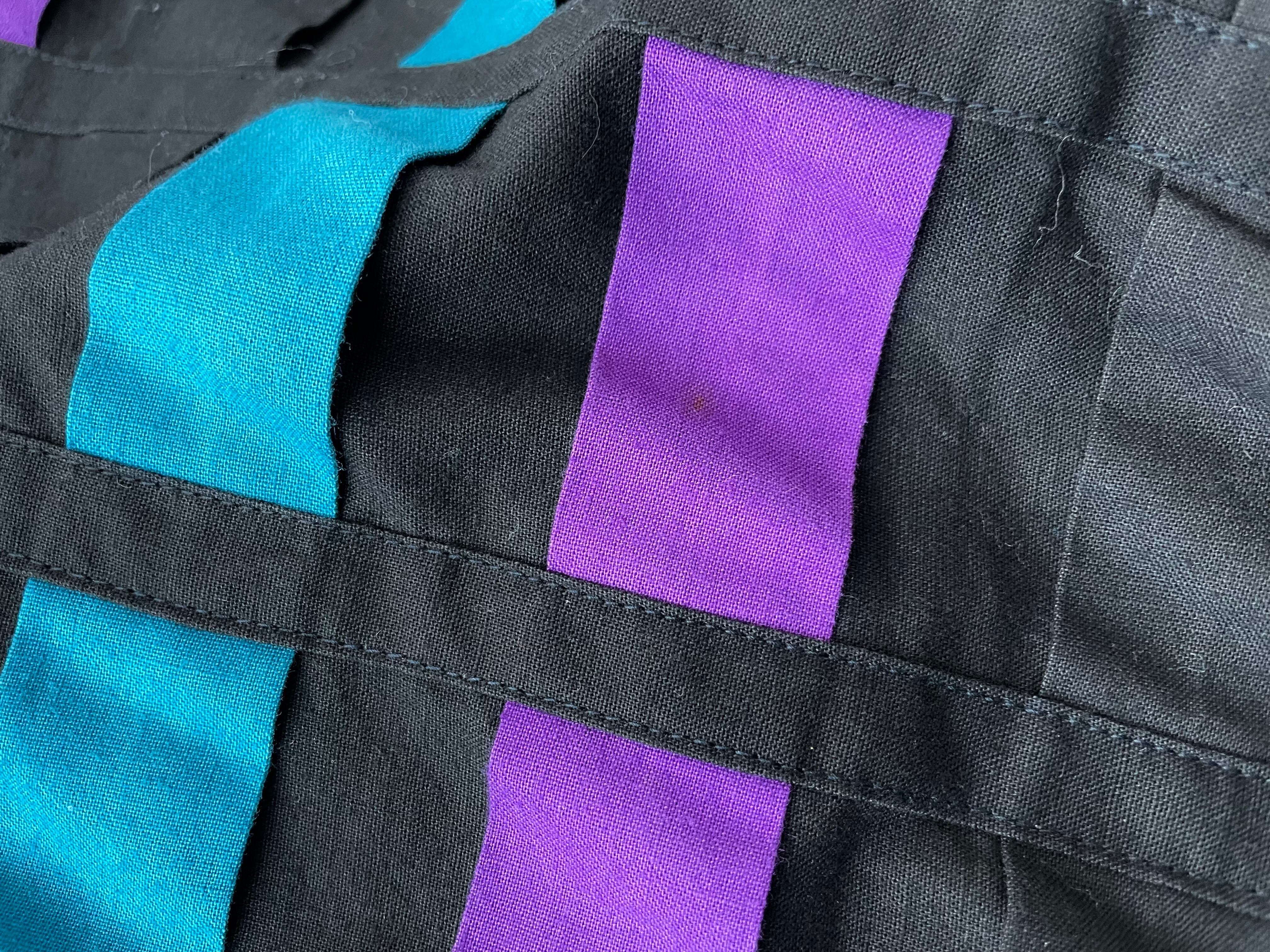 This piece has a unique fabric design with uneven purple/light blue vertical stripes covered by black tape fabric.