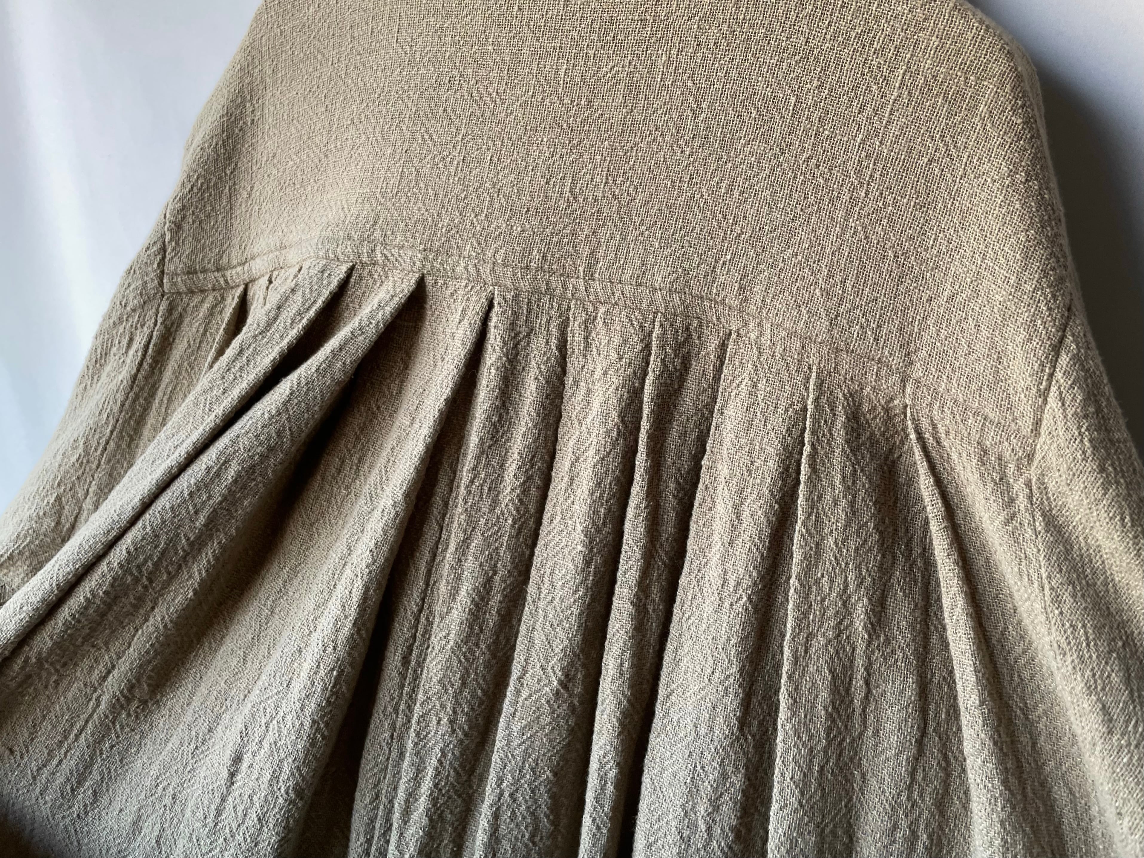The huge amount of fabric, approximately 129 x 2 cm in width at the hem, is held together by the waistband on the back and countless tucks.