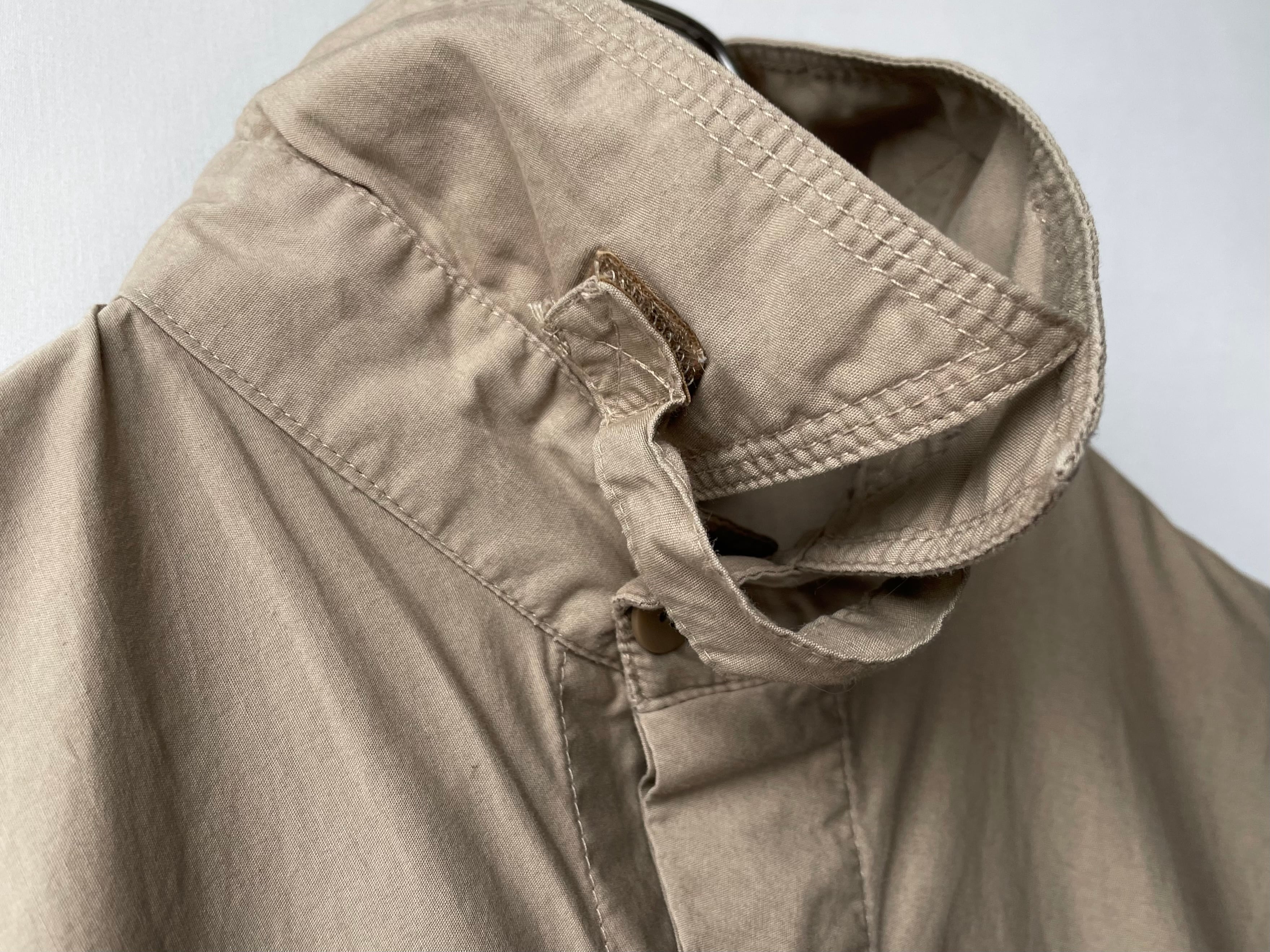左右非対称のチェストポケット、ベルクロ留めのチンストラップ。