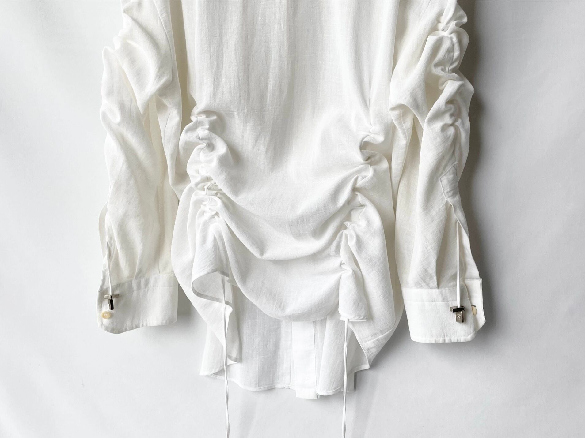 4 drawcords at the seams of both sleeves and from the center of the back to the hem.
