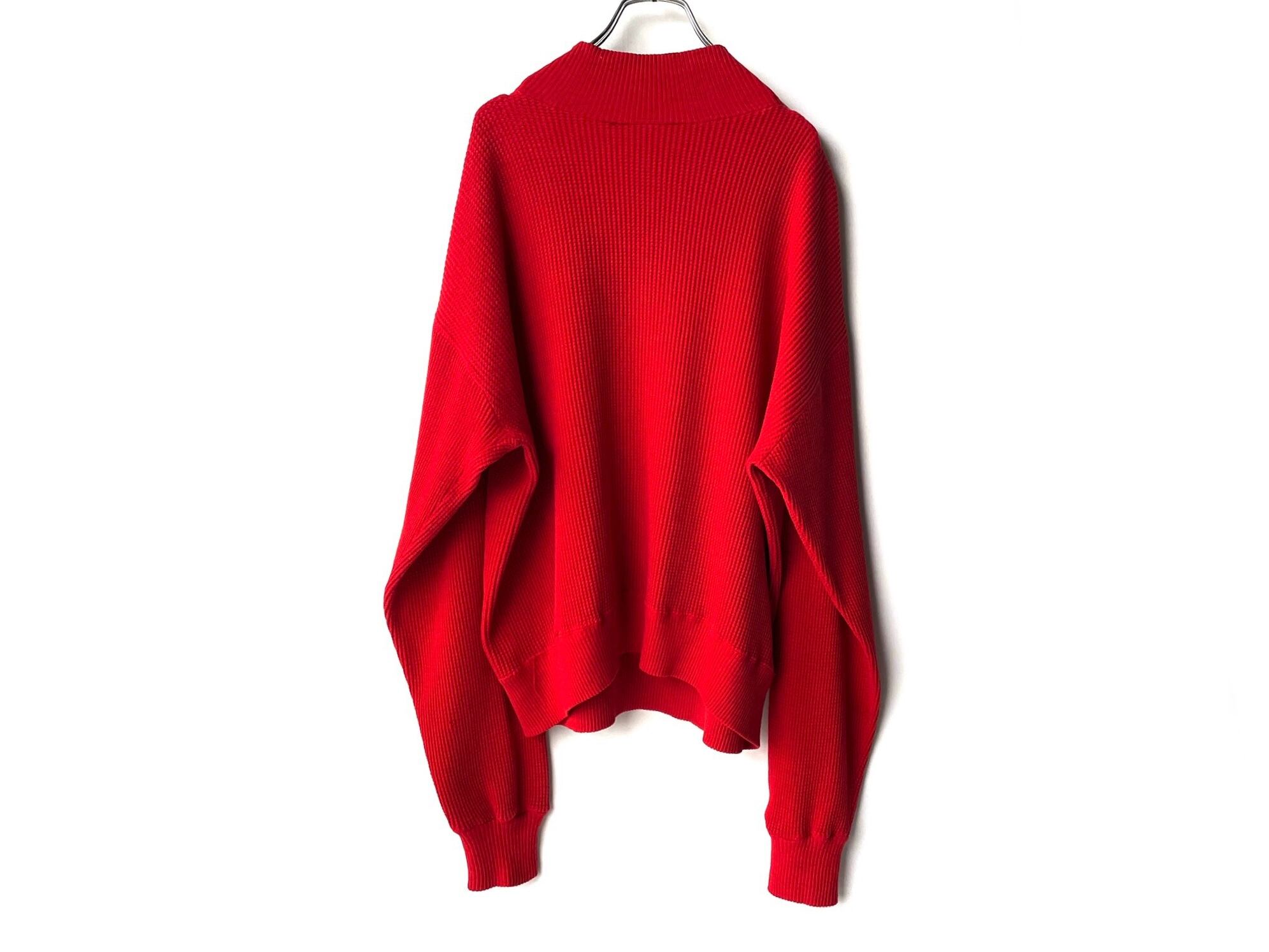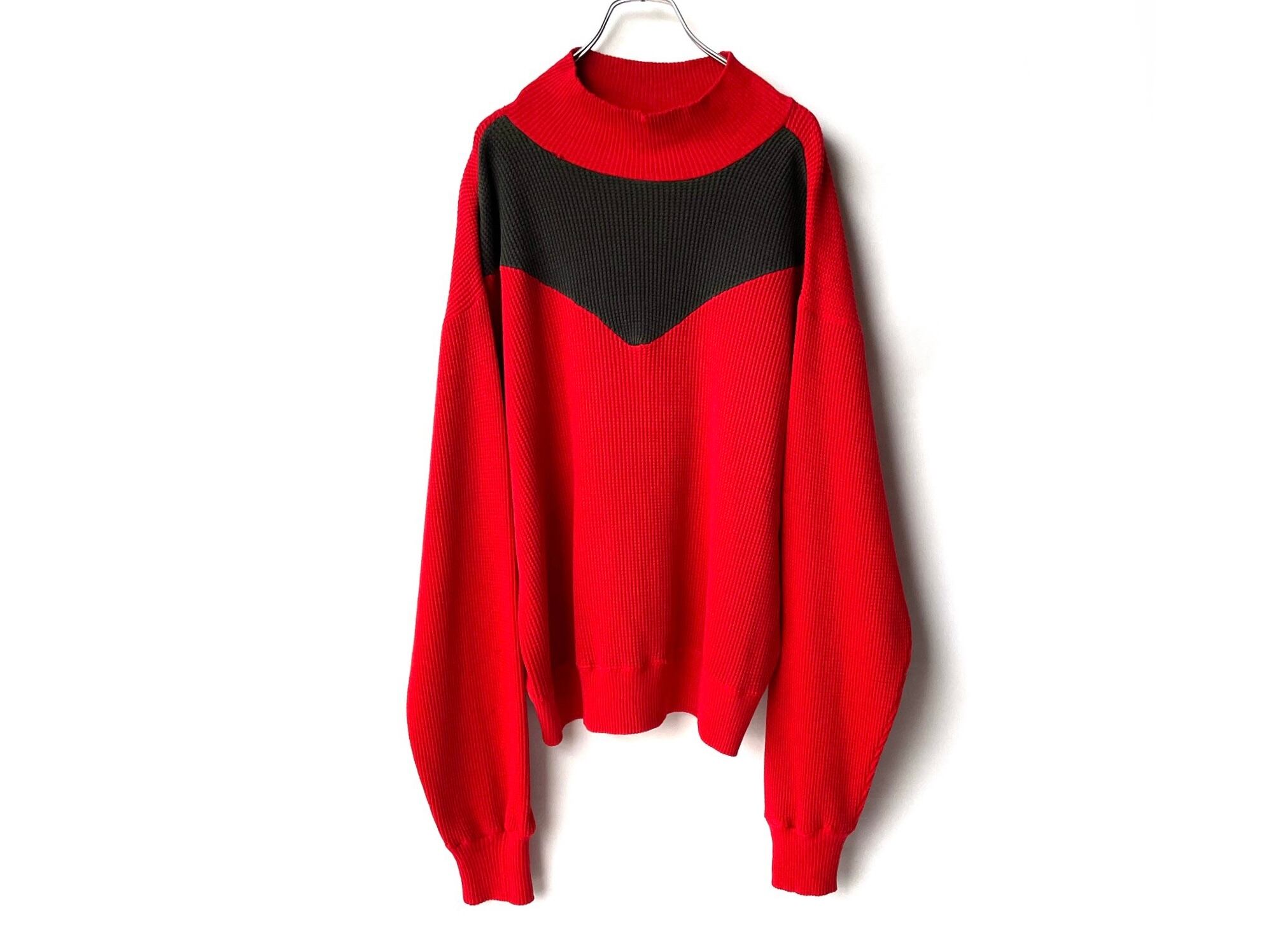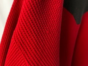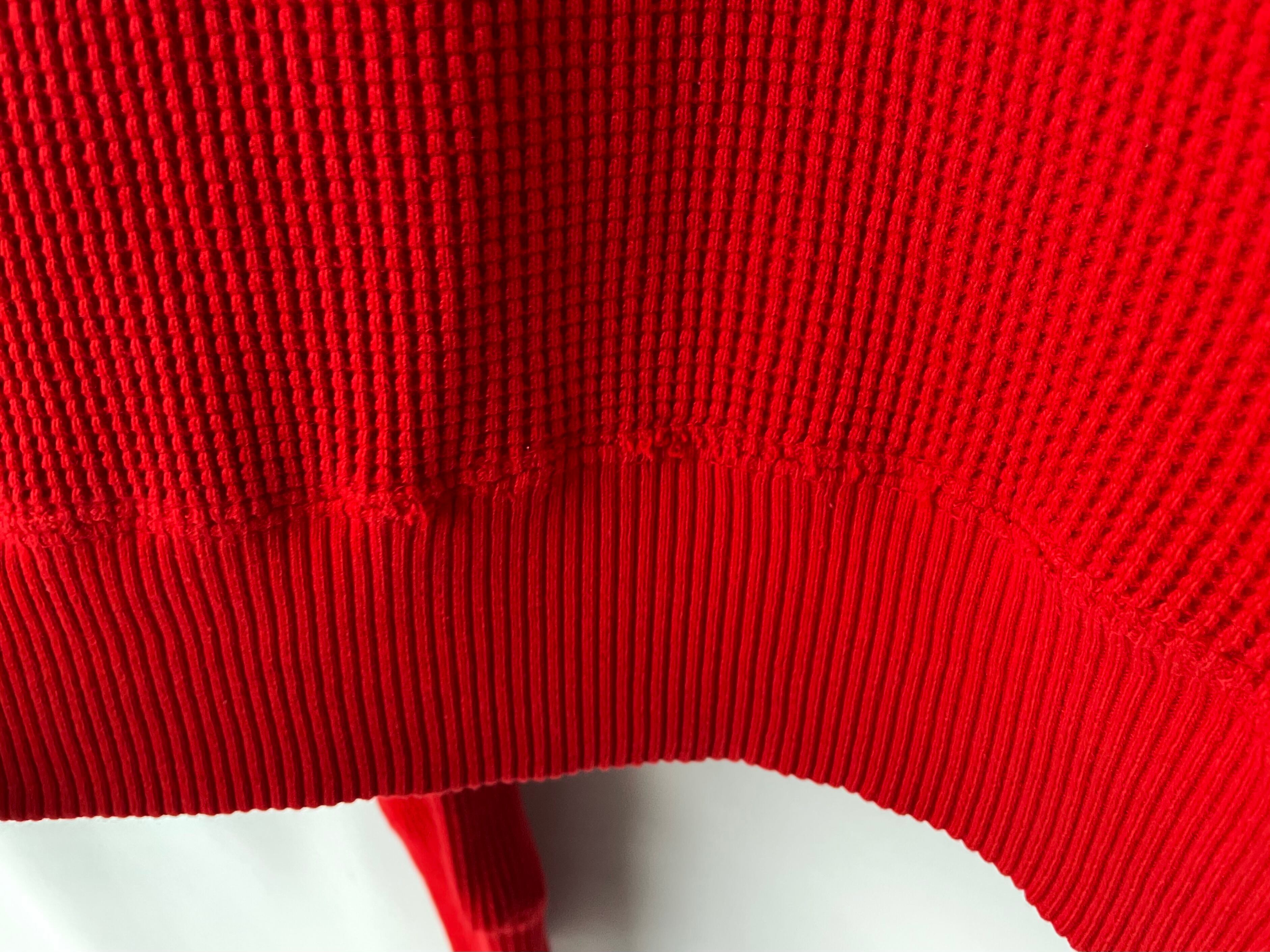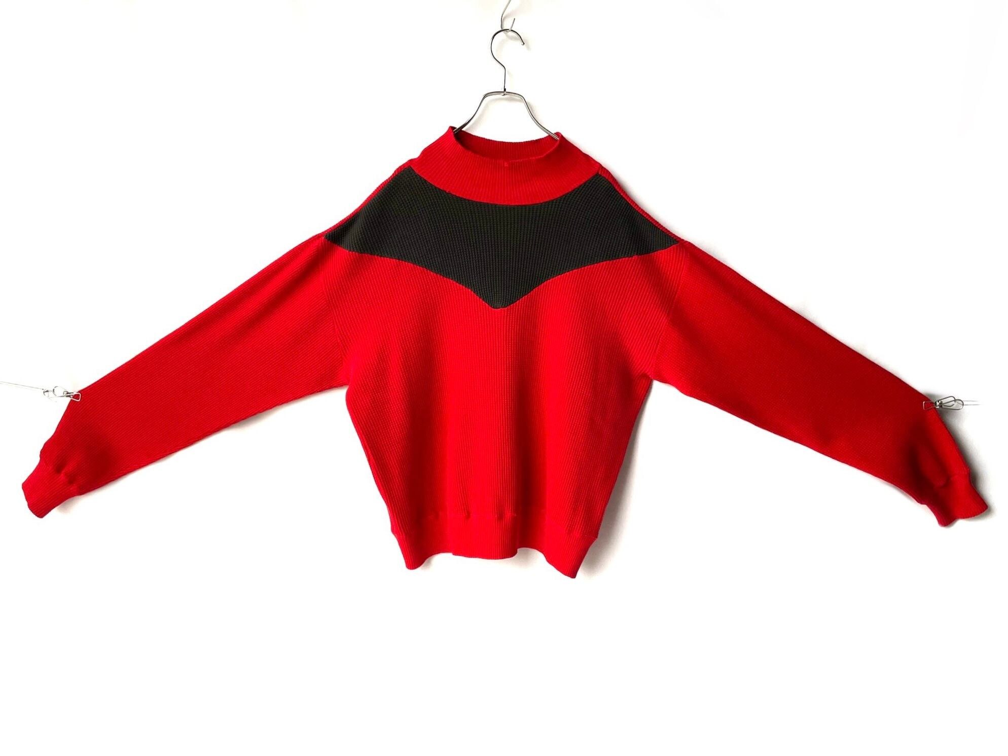 幅広のリブネック、柔らかな発色の赤ベースに胸周りは墨黒の切り替え。