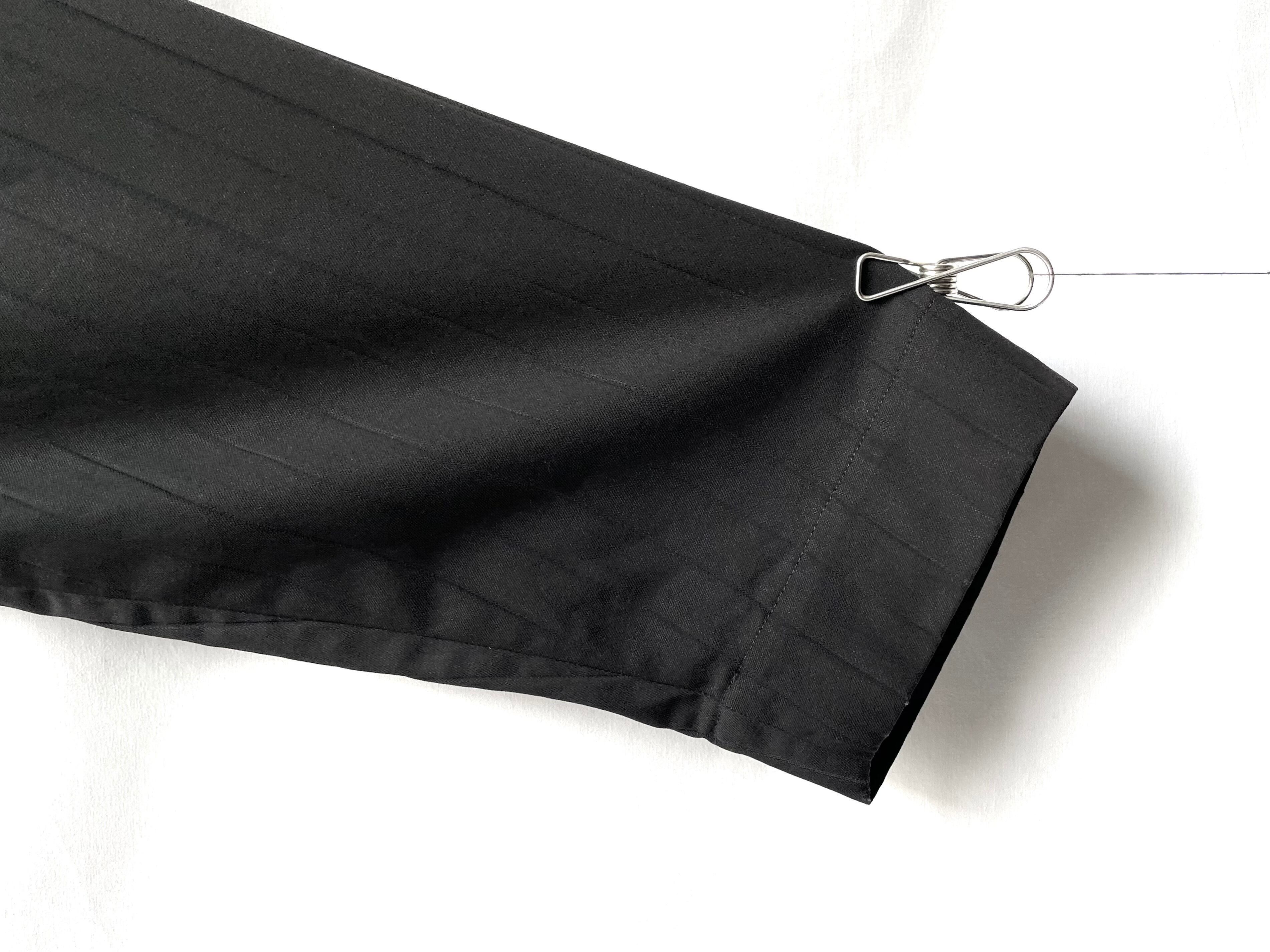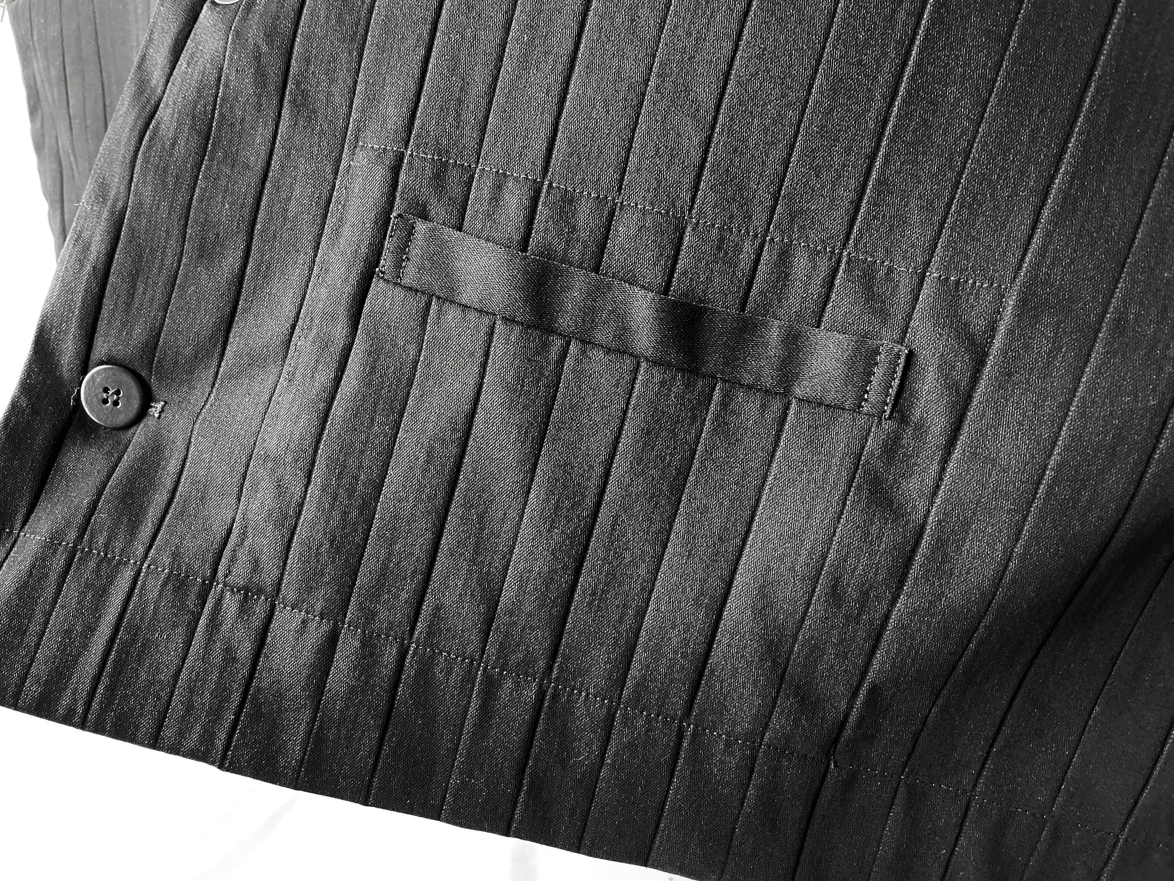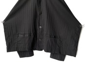 ボタンを含めたフルブラックに、第二ボタンホールのみに白糸が使用された静かなディテール。