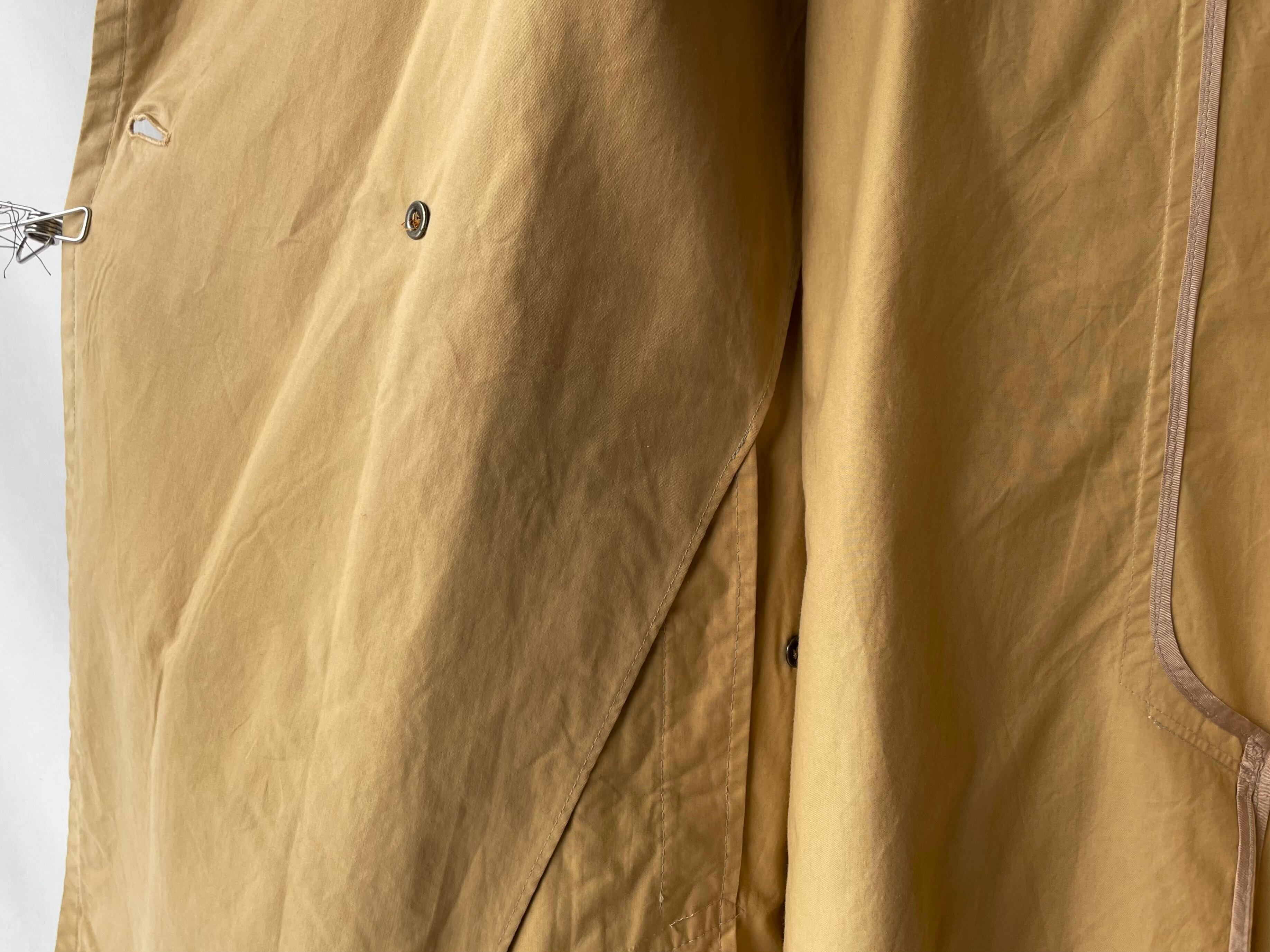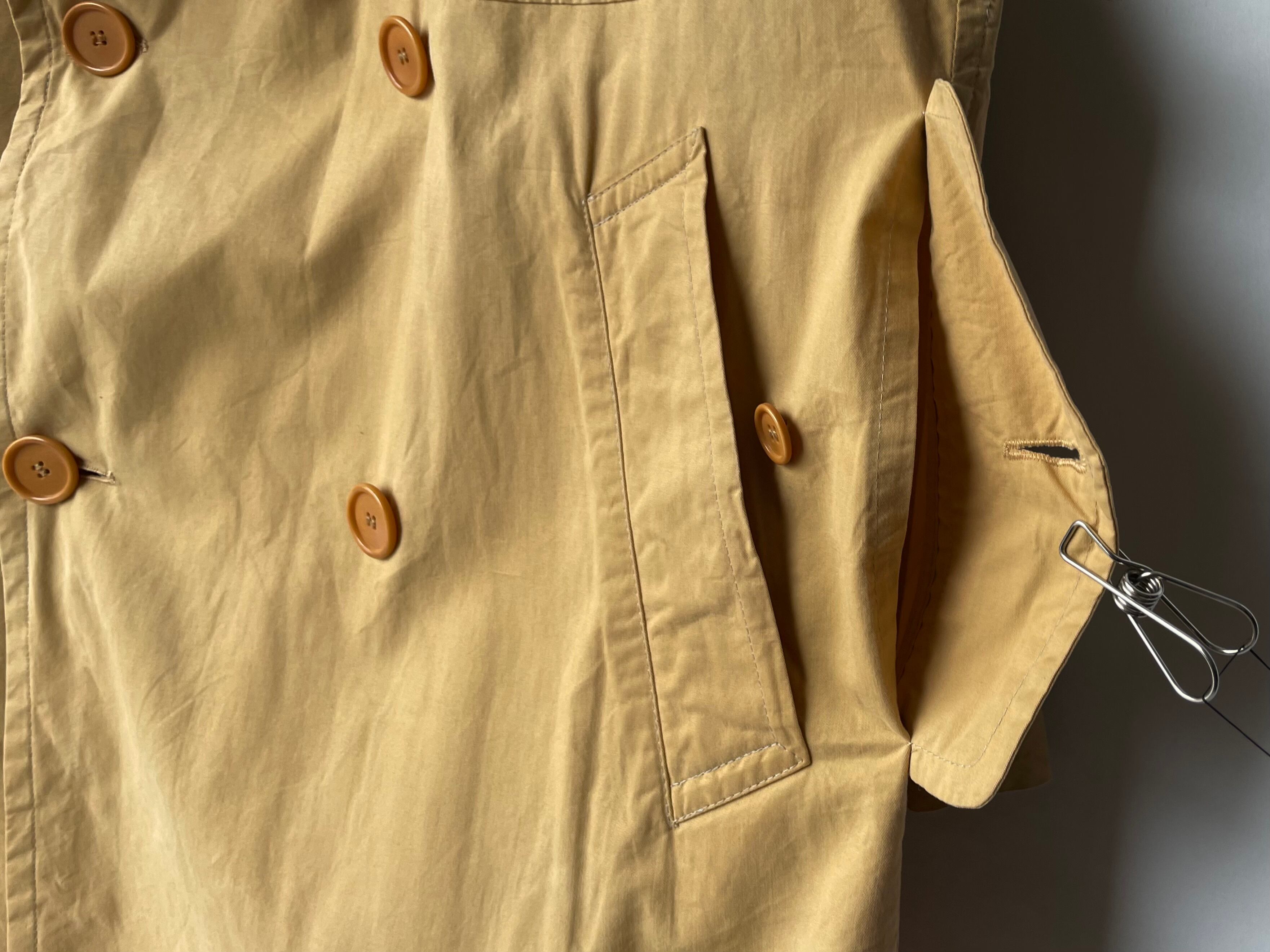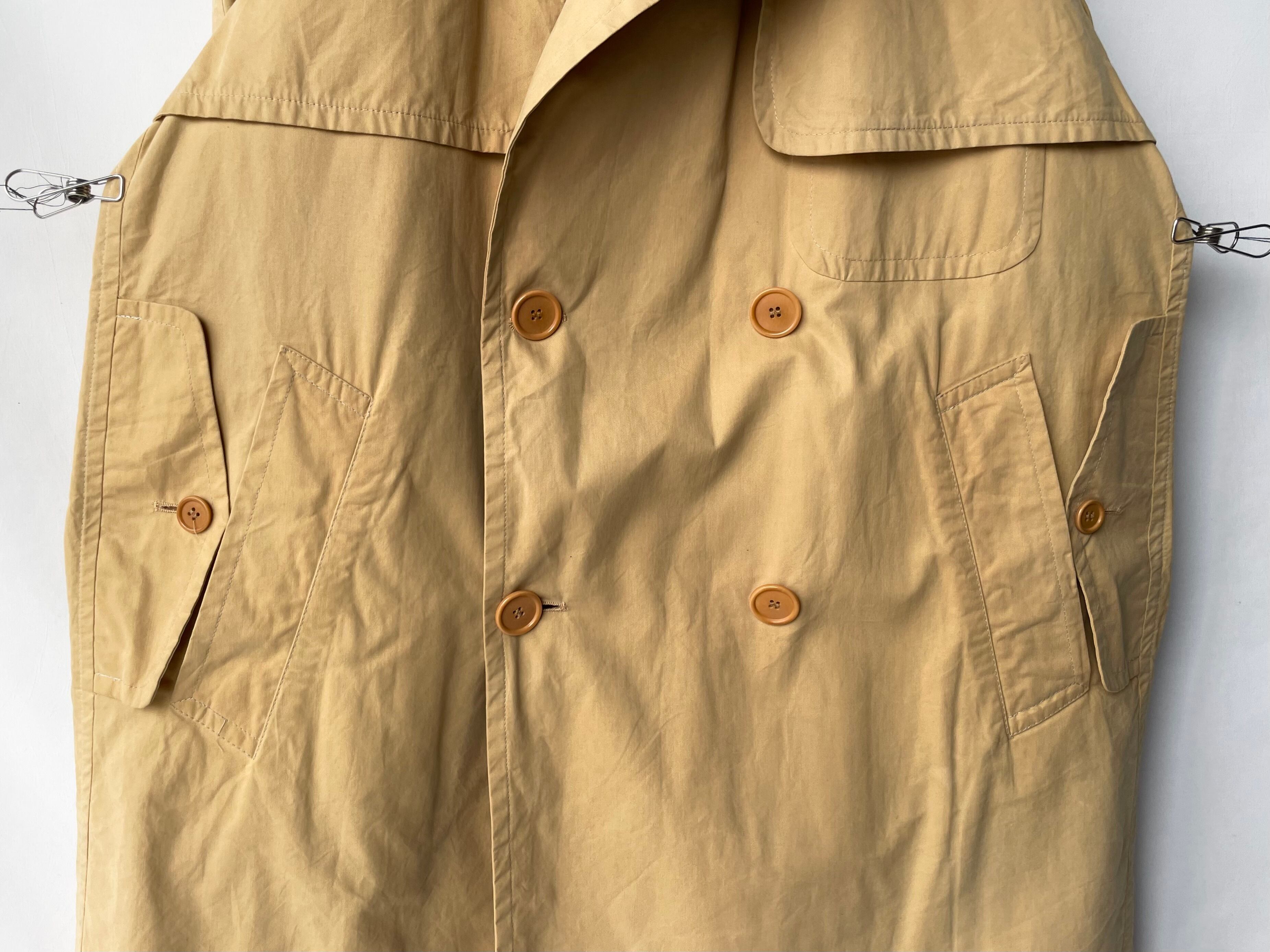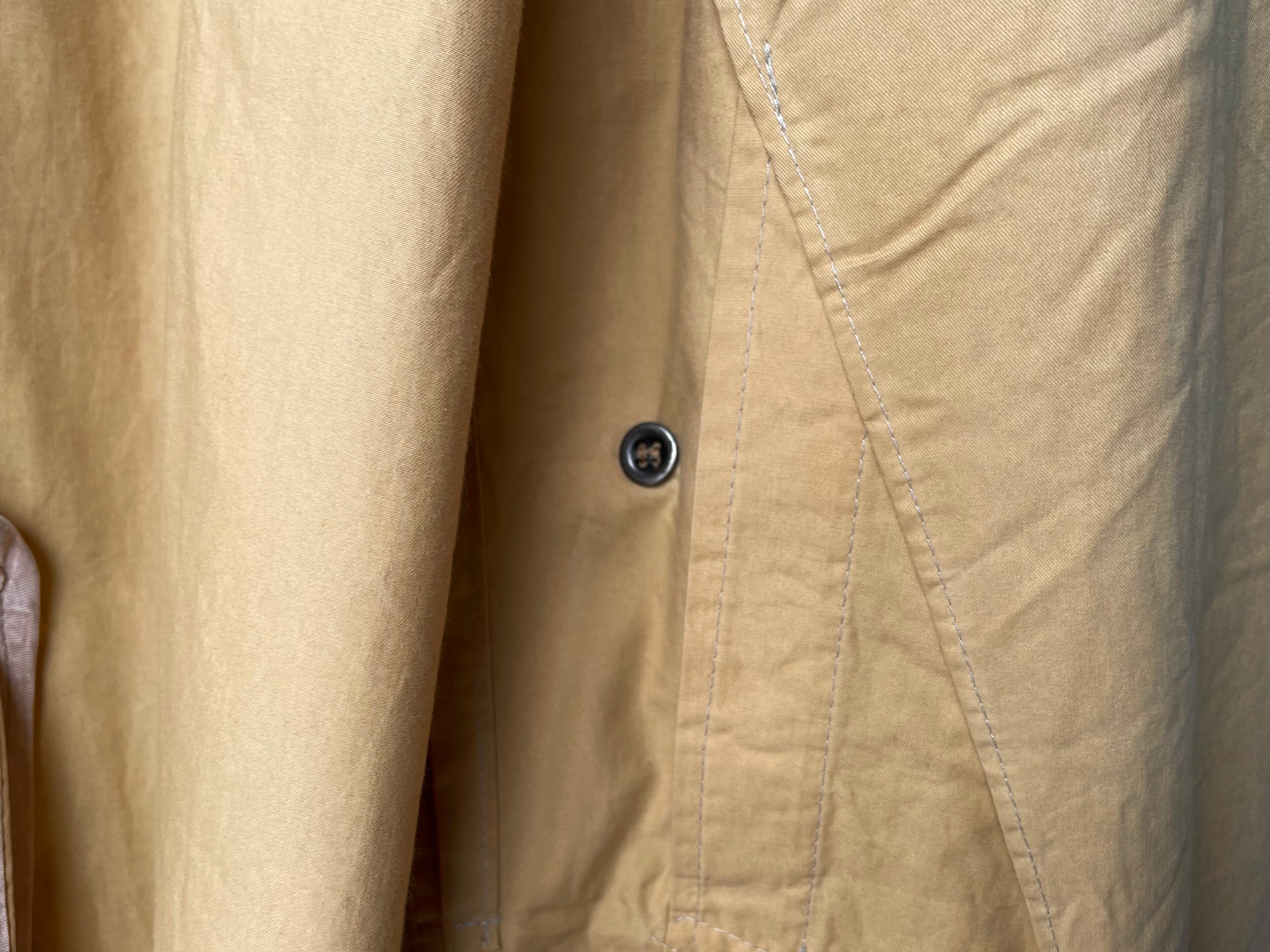 フロントポケット両脇のボタンフラップが貫通式の、オーバーコートのディテール。
