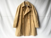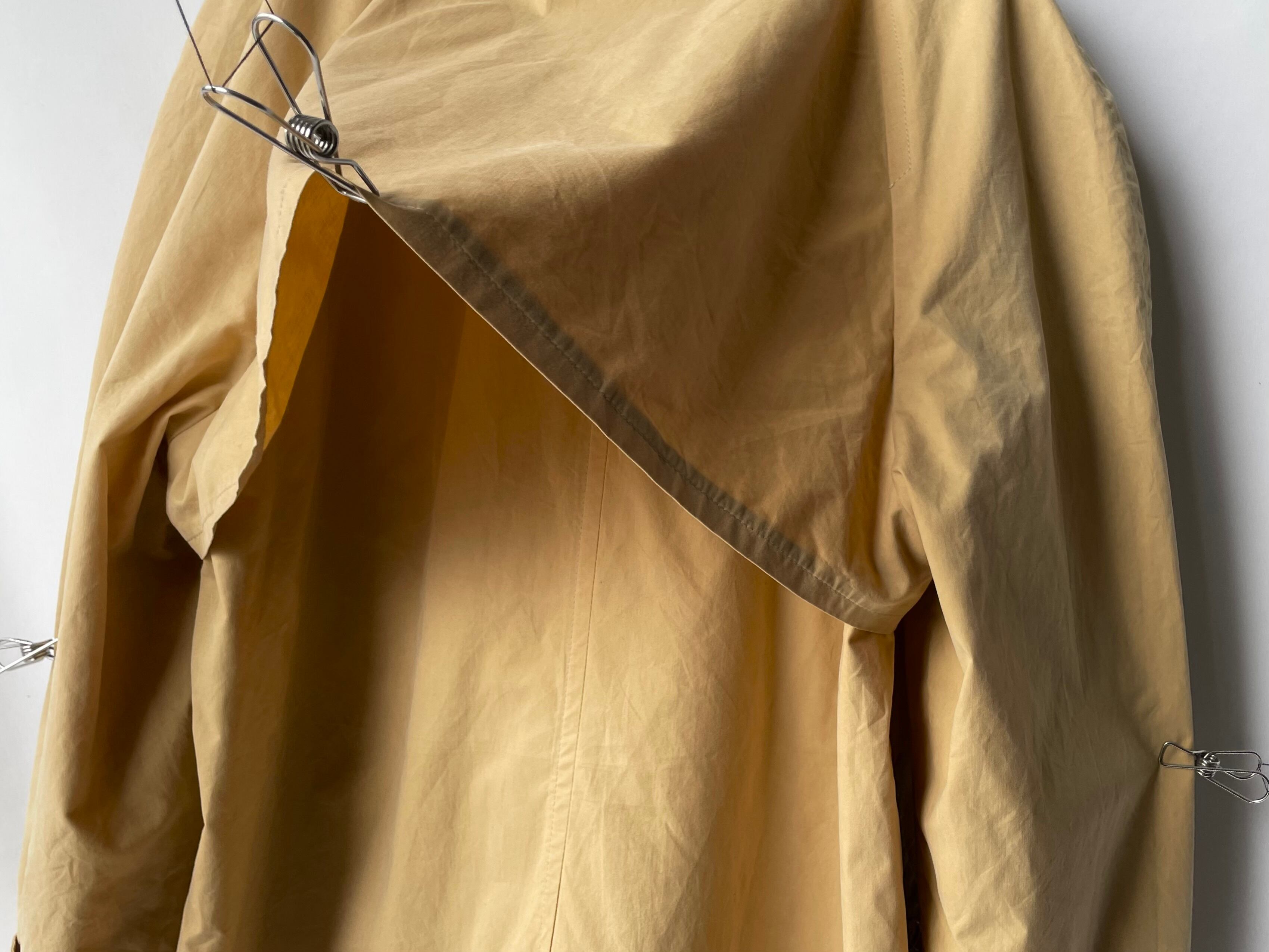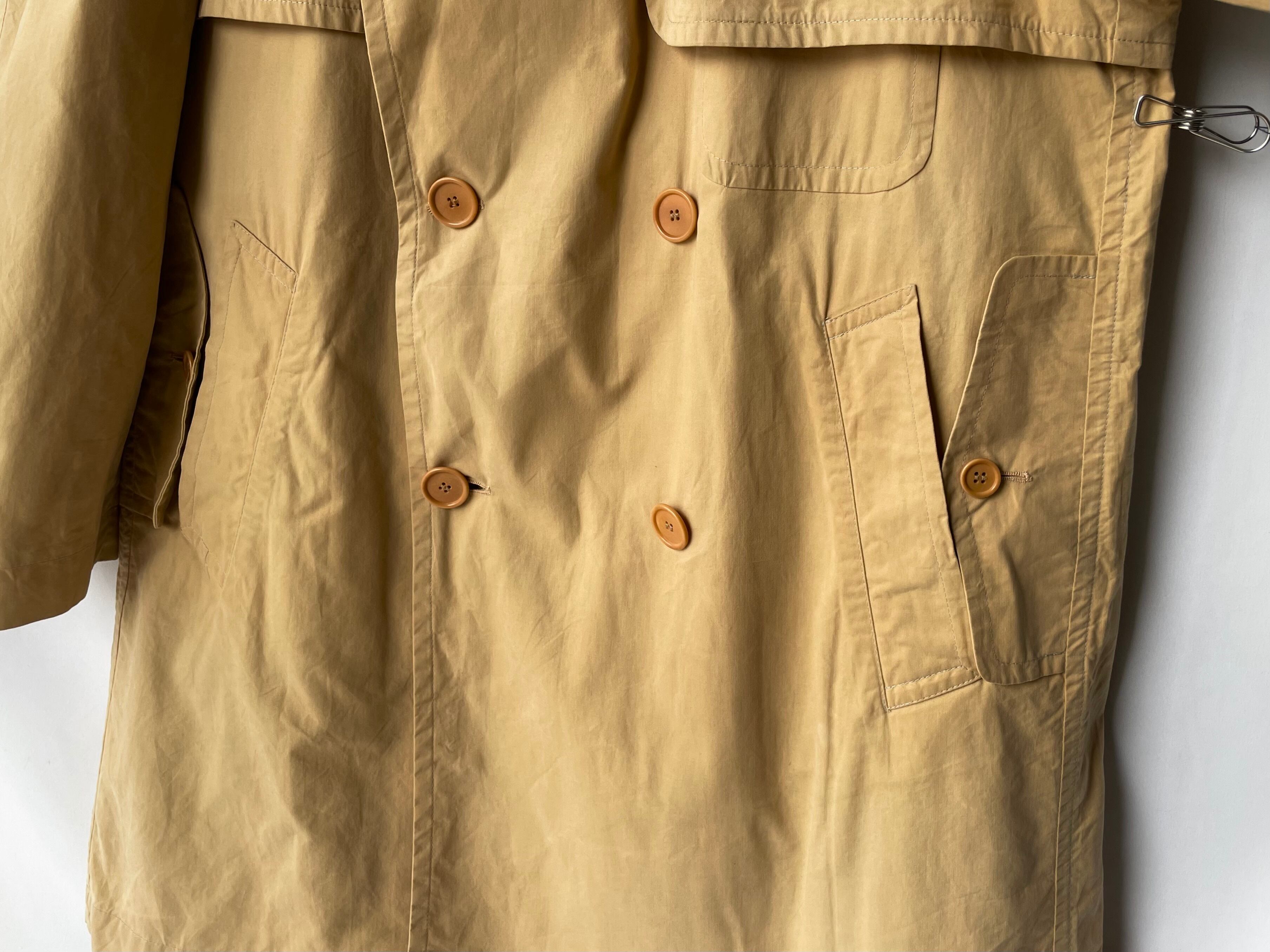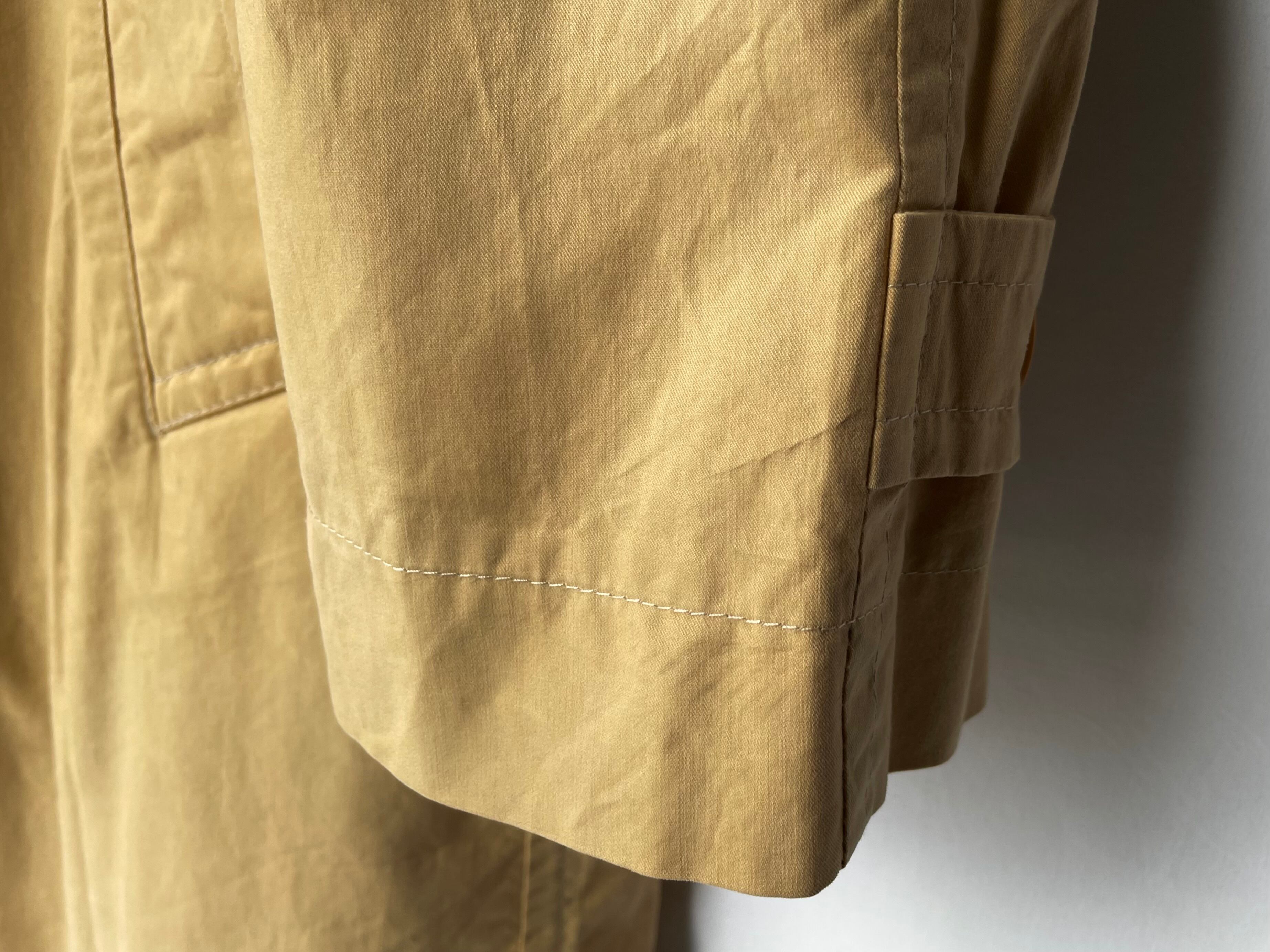 フロントポケット両脇のボタンフラップが貫通式の、オーバーコートのディテール。