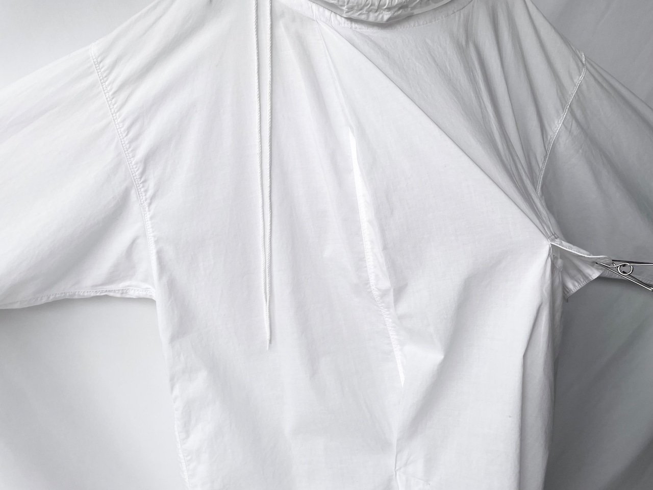 広くえぐれた丸首に、ドローコードが通る共生地パーツが足された特殊なネックデザイン。