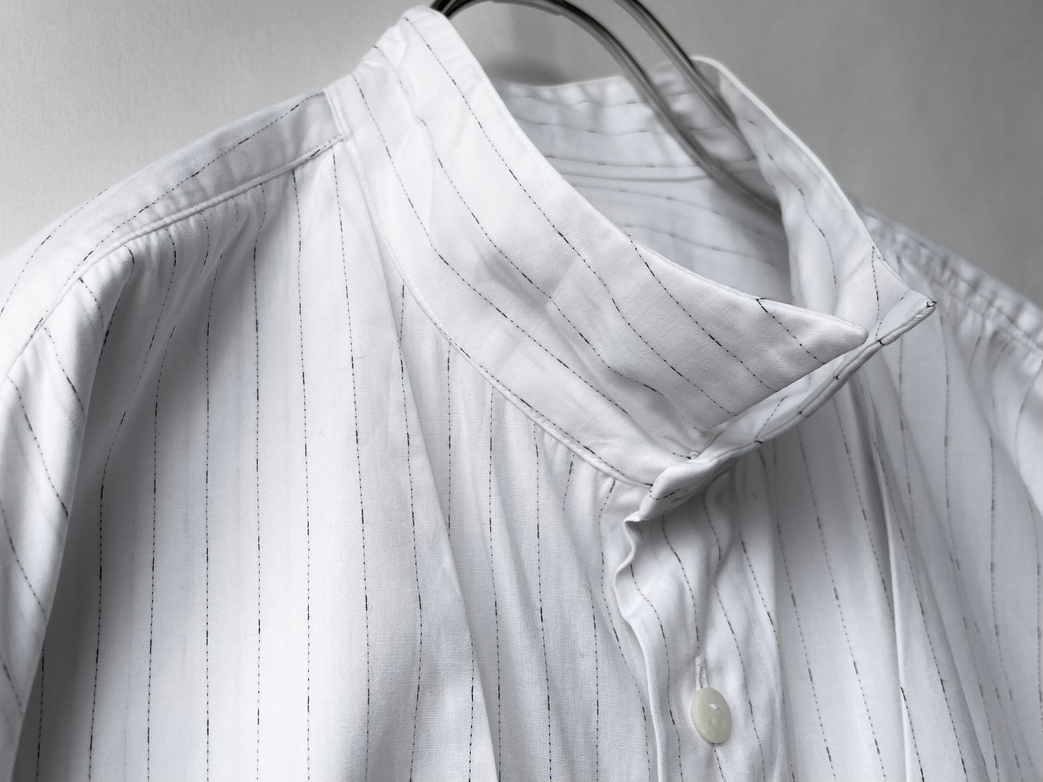 襟高のあるウイングカラーに袖先はダブルカフス。