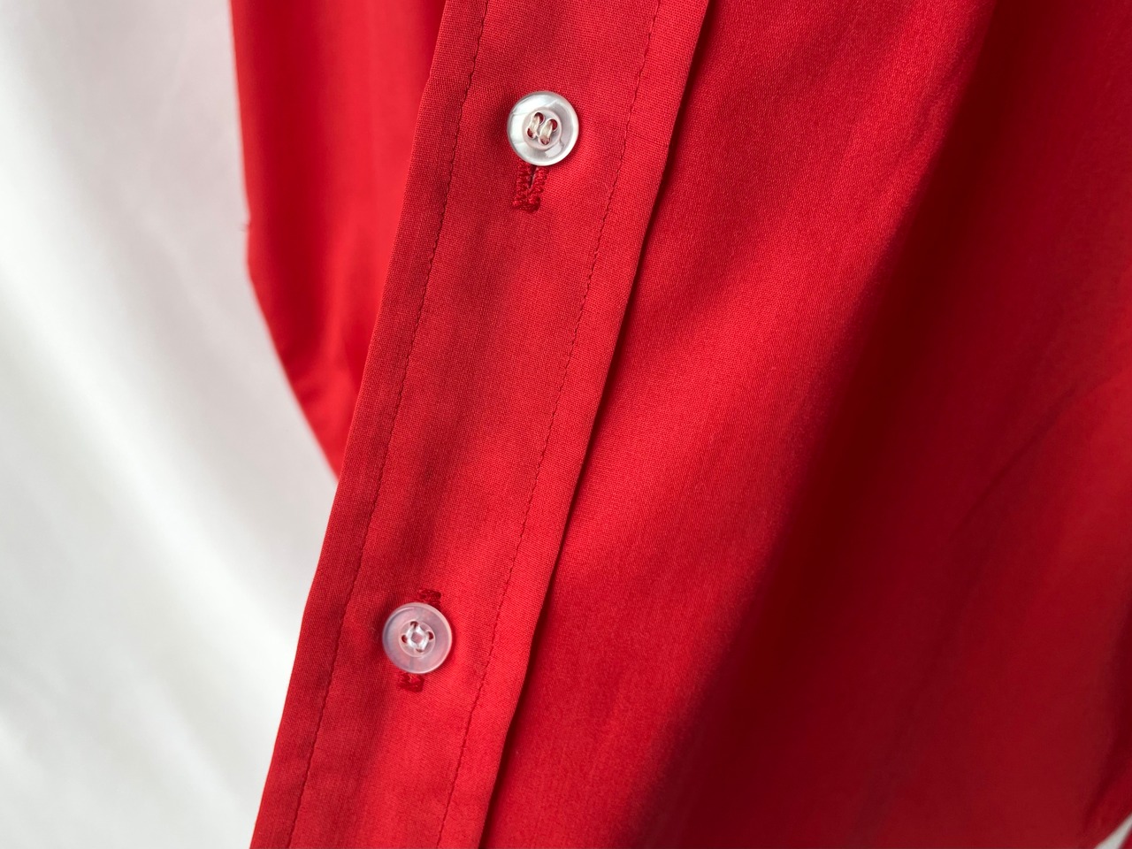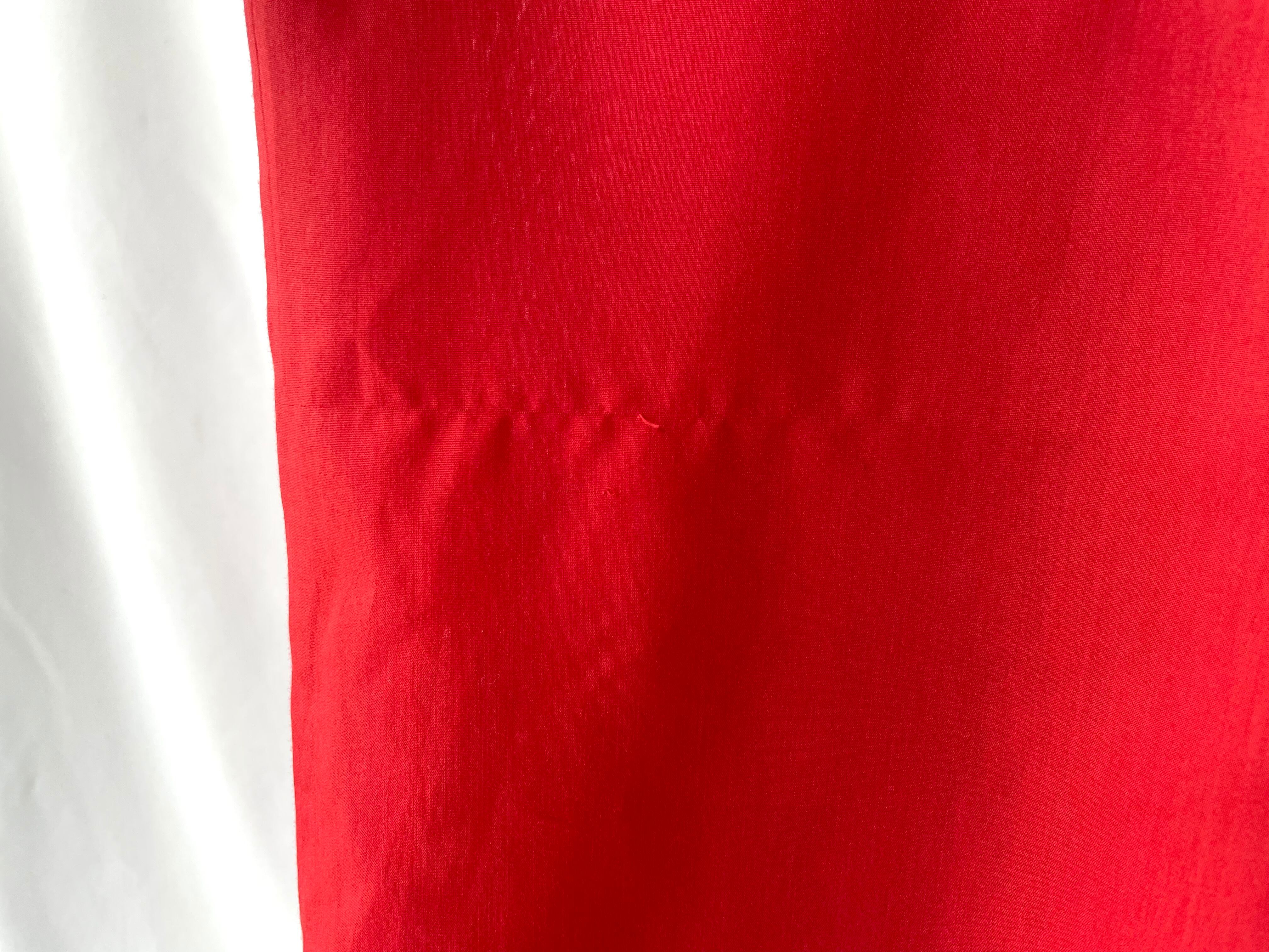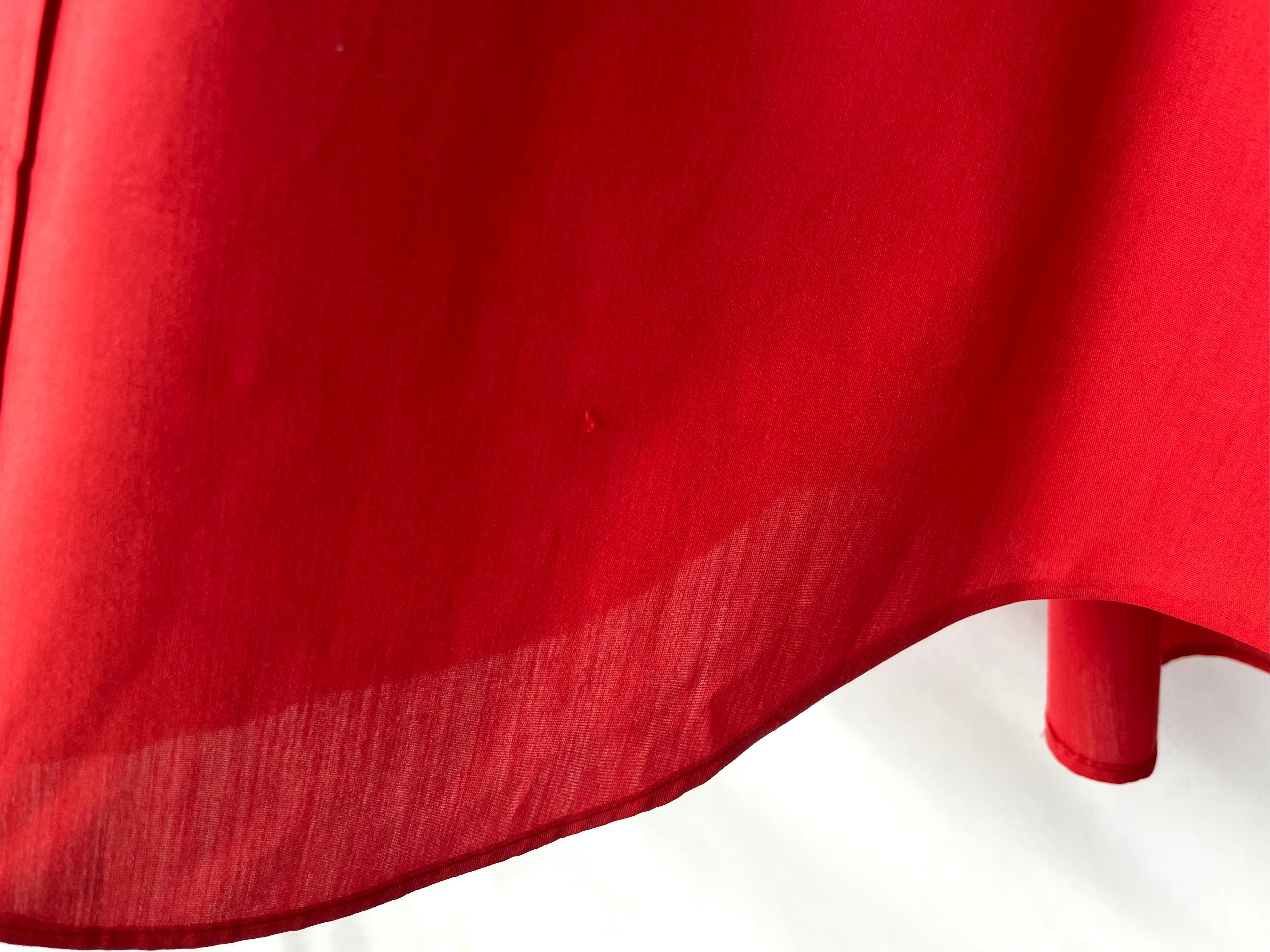 Red-orange, almost red, made of high-density poly/cotton.