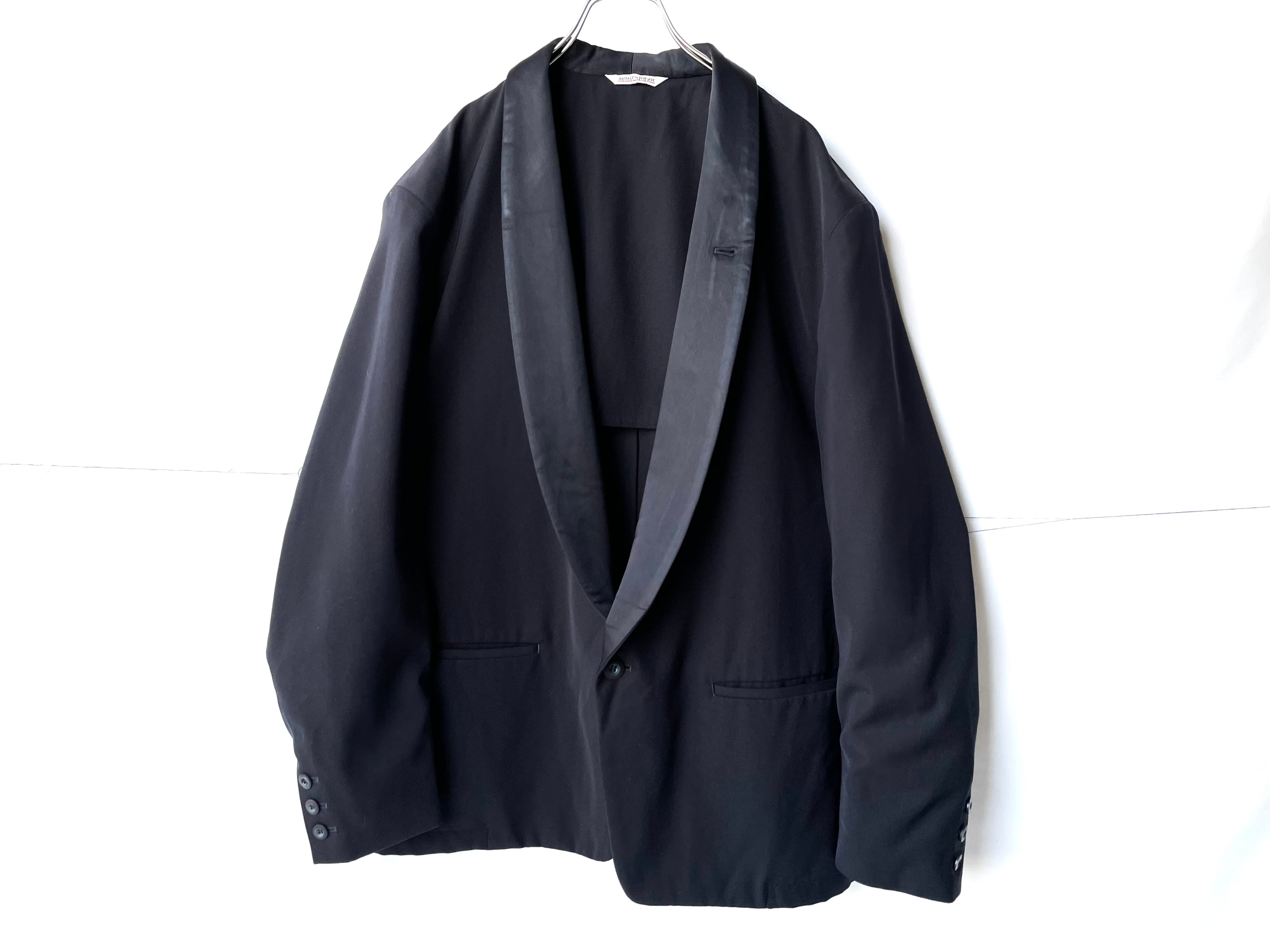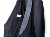 A satin shawl collar design that changes shape by opening and closing the button on the back of the lapel.