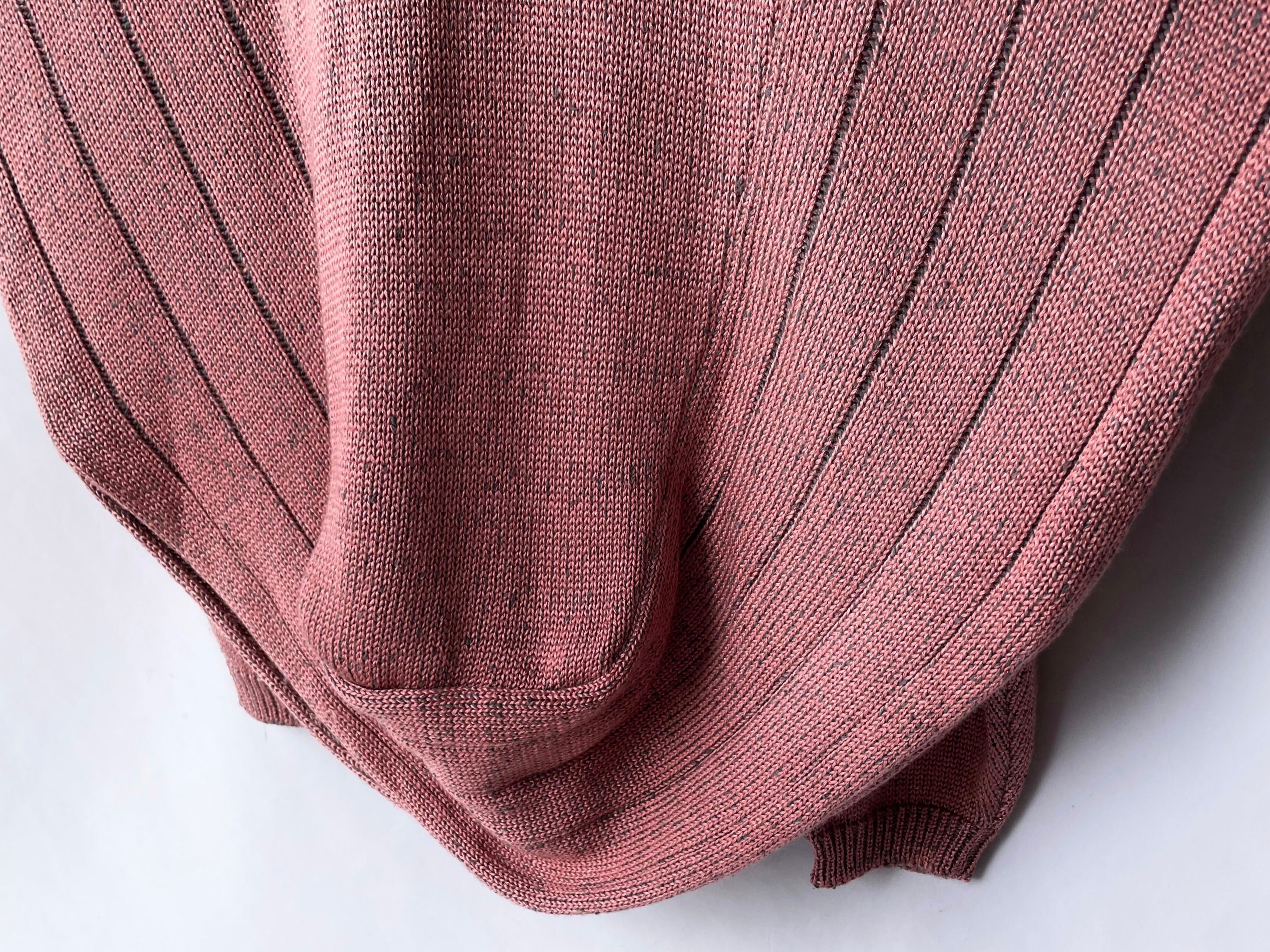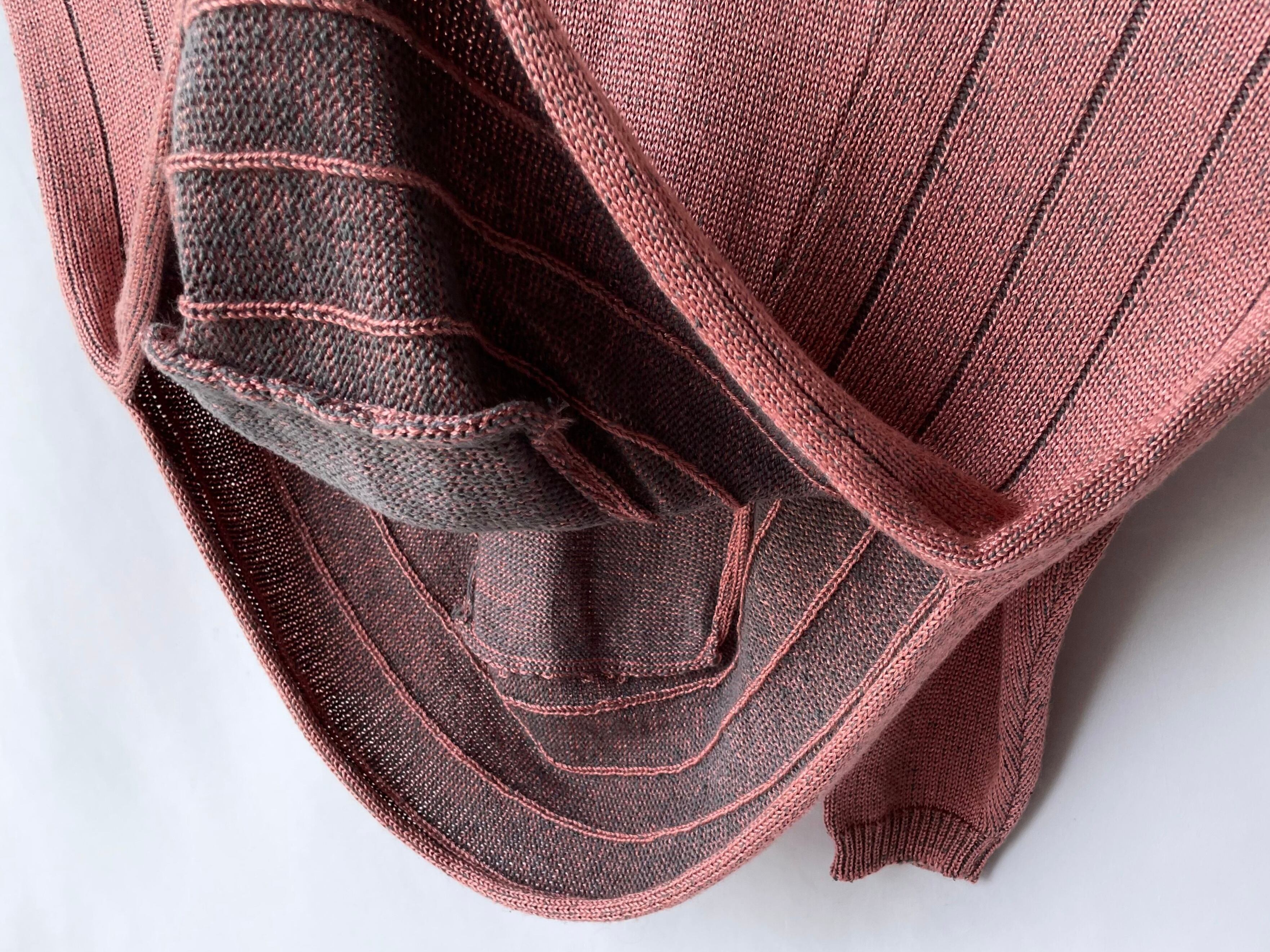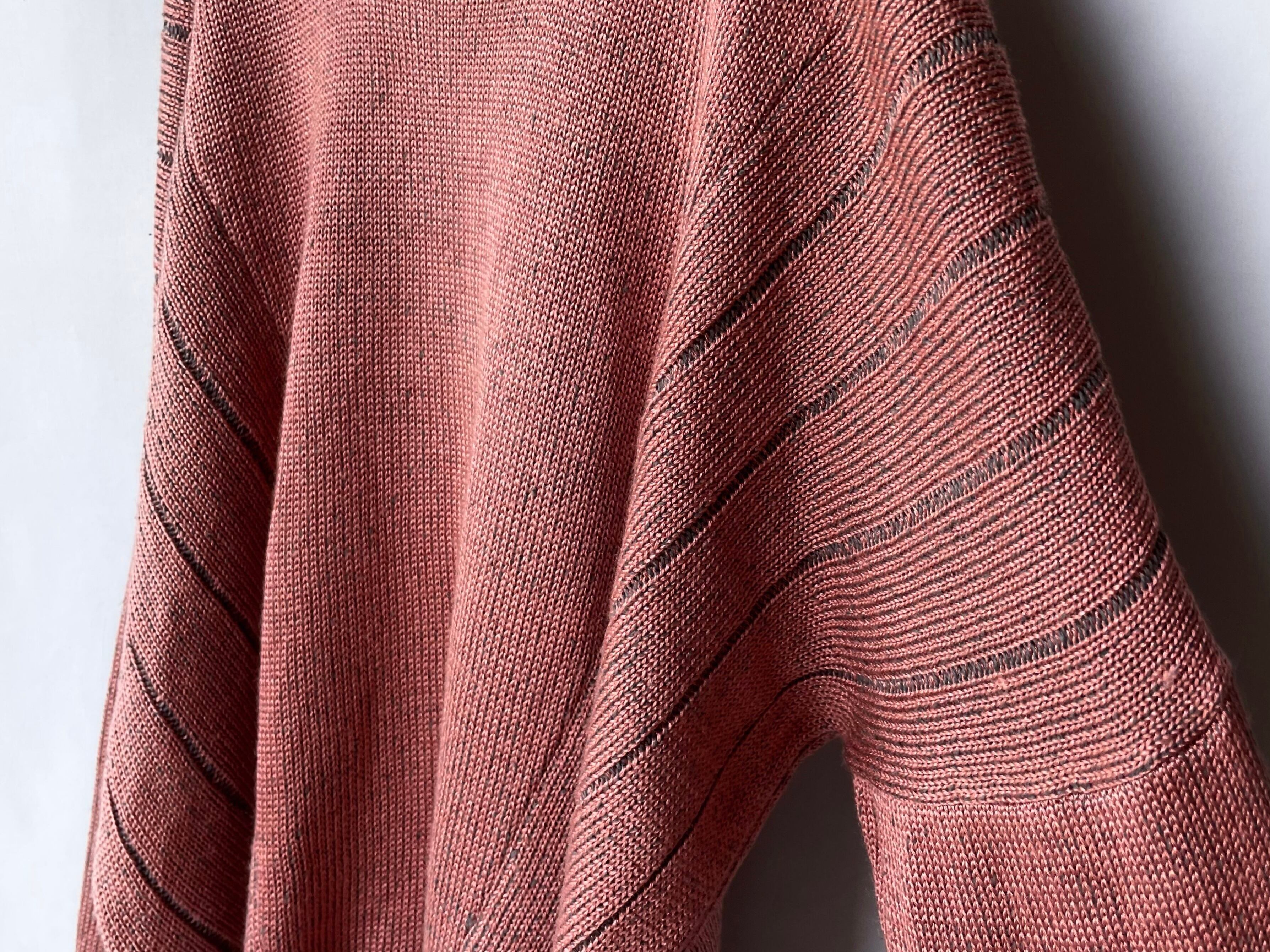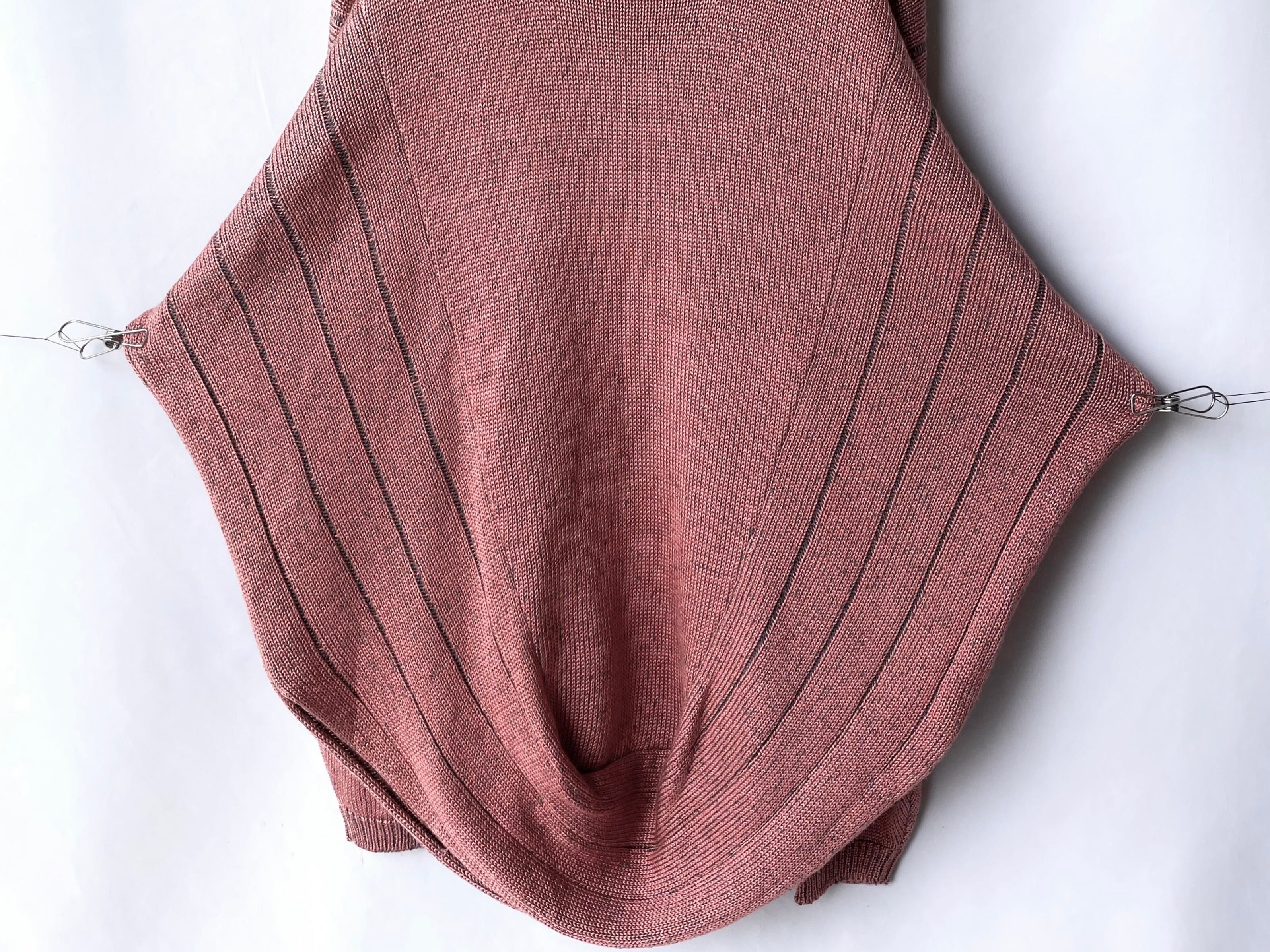 肩から裾を通り反対の肩へ、裾で立体的な弛みが生まれる特殊なラウンドヘム。