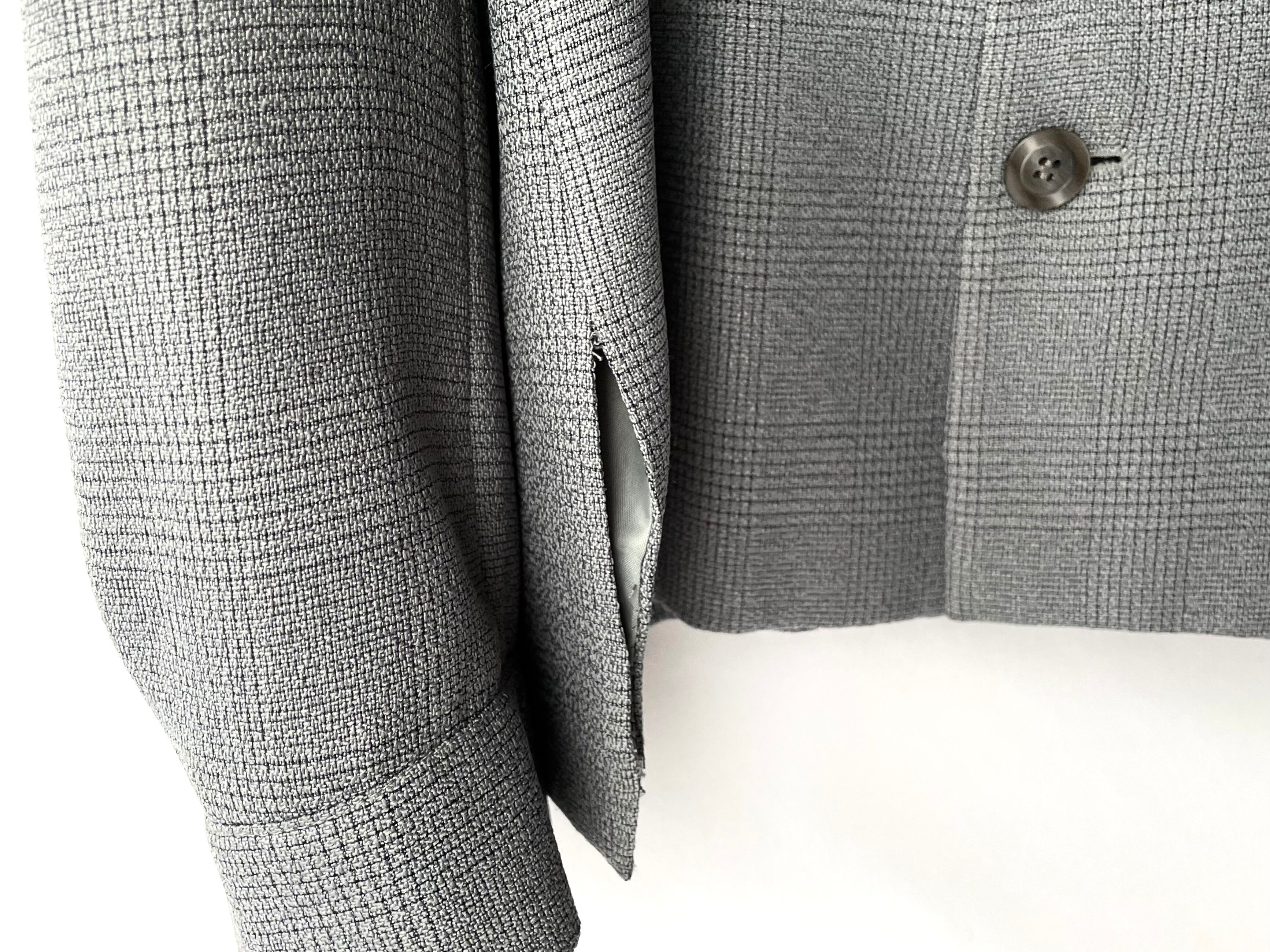 丸みを帯びた小ぶりなラペルデザイン、深いサイドスリット入りのボックスカット。