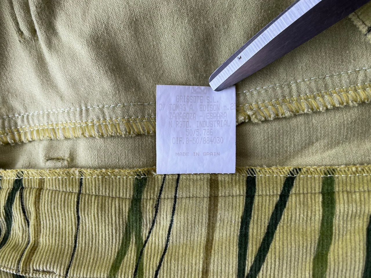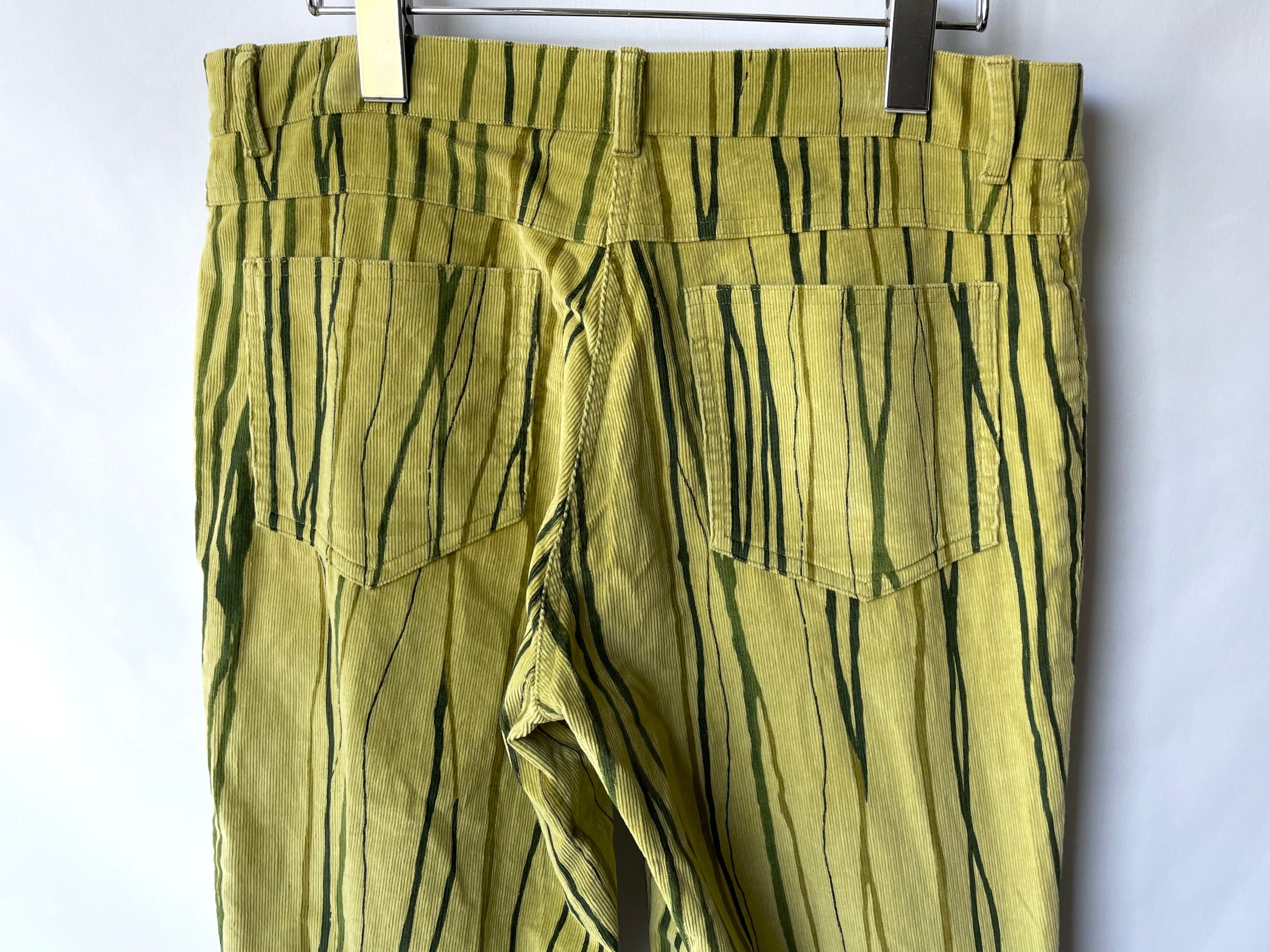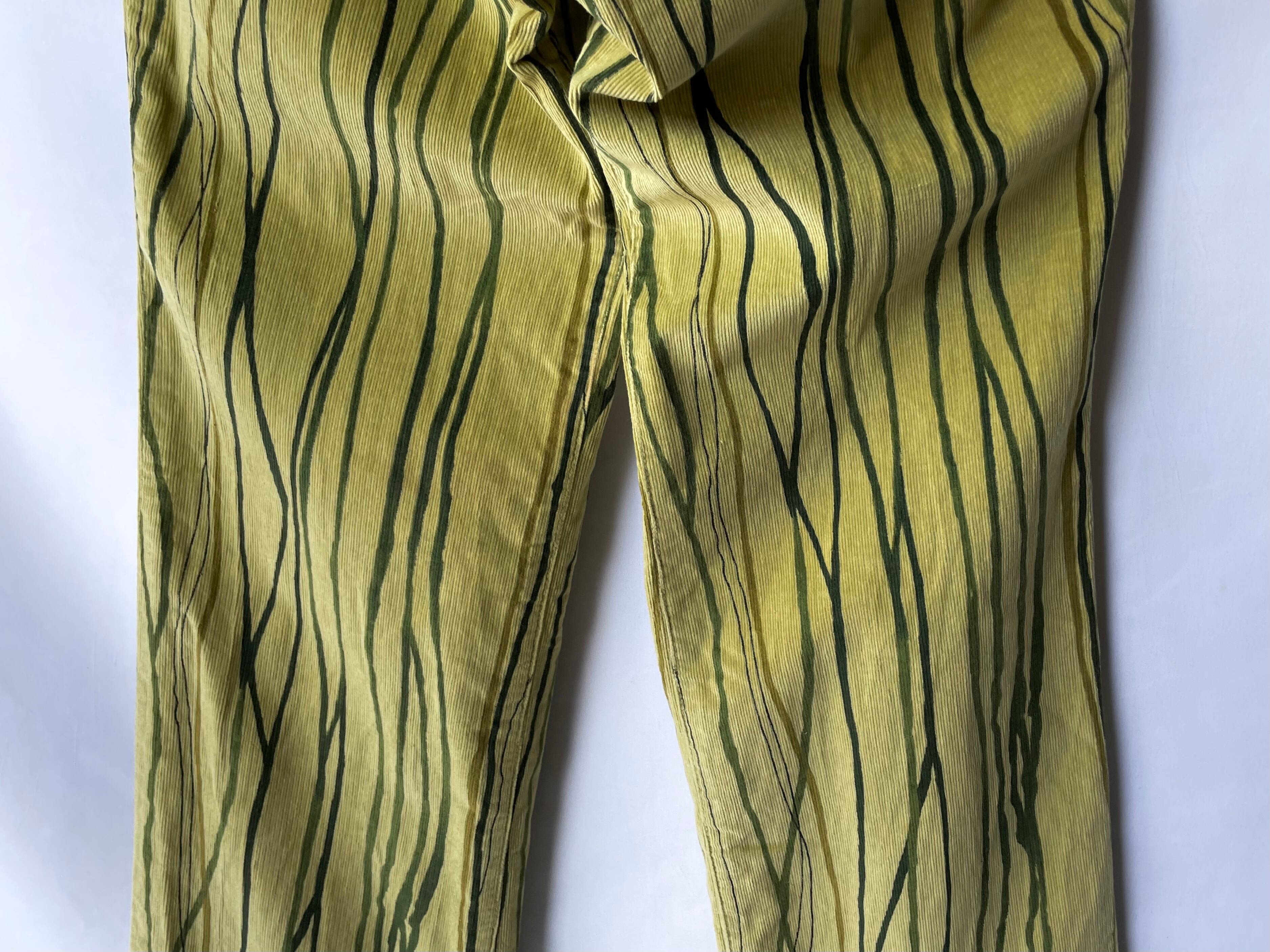 A unique all-over pattern with finely ribbed corduroy in a blurred khaki yellow color and dyed in different tones of green/khaki brown.