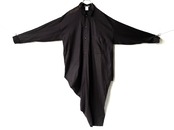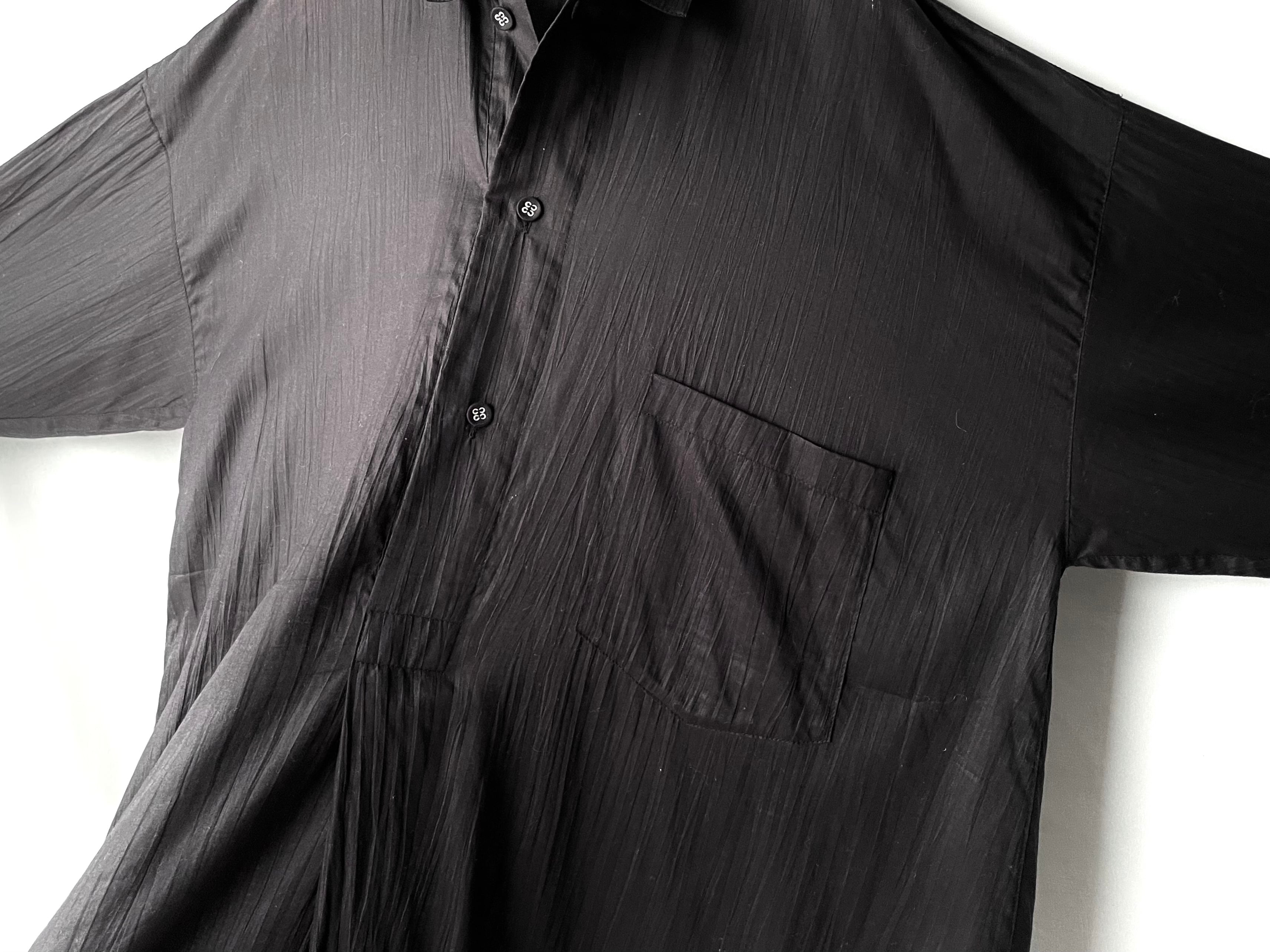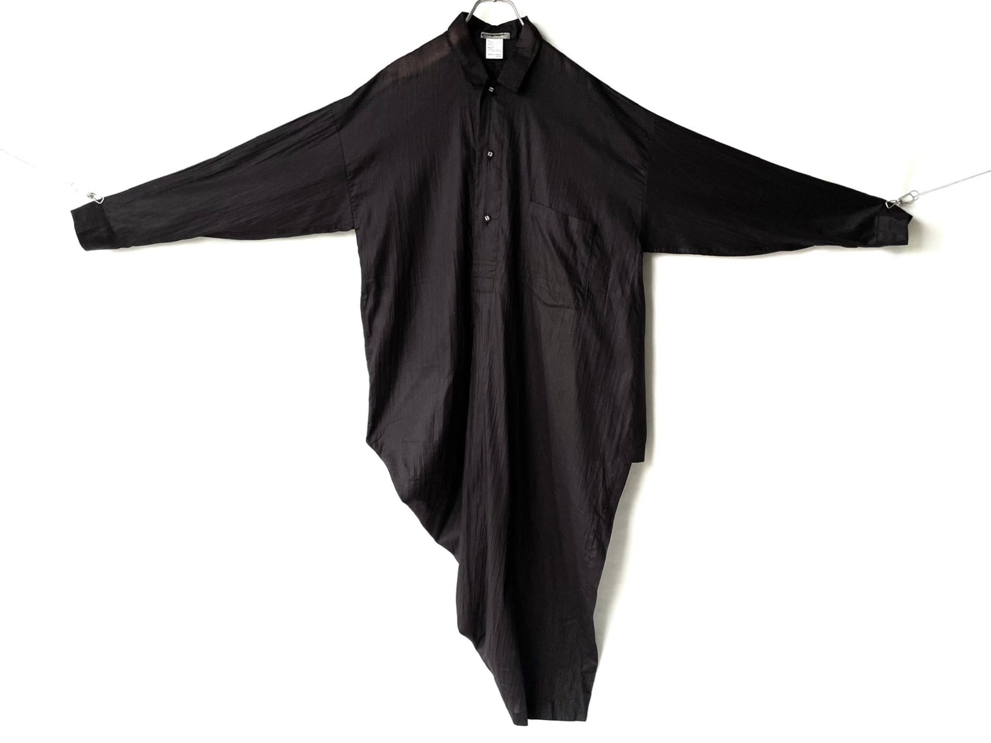身頃から連続した大判な前裾を非対称に折り、弛ませた、この一着独自の設計によるロング丈のシャツコート。