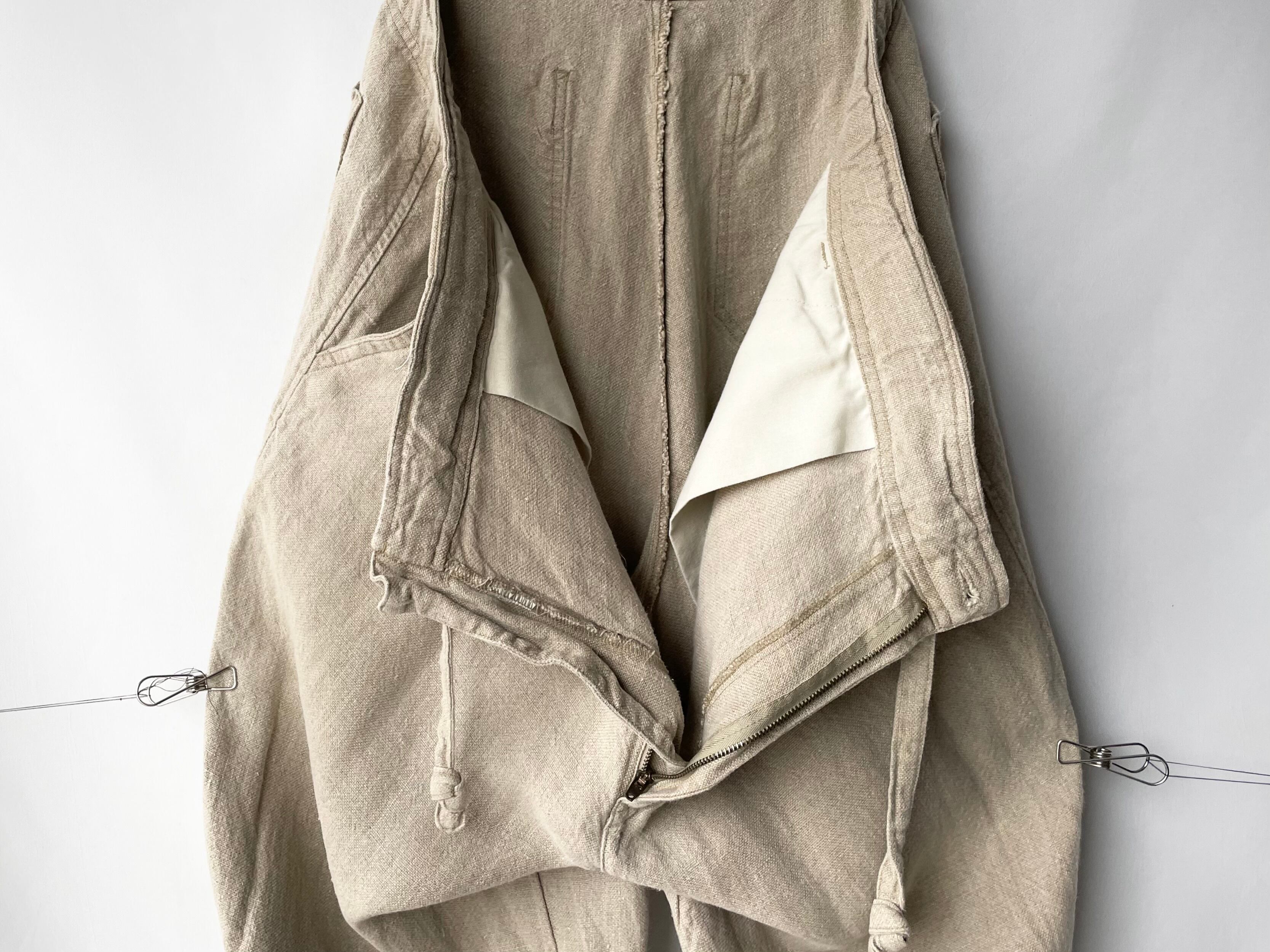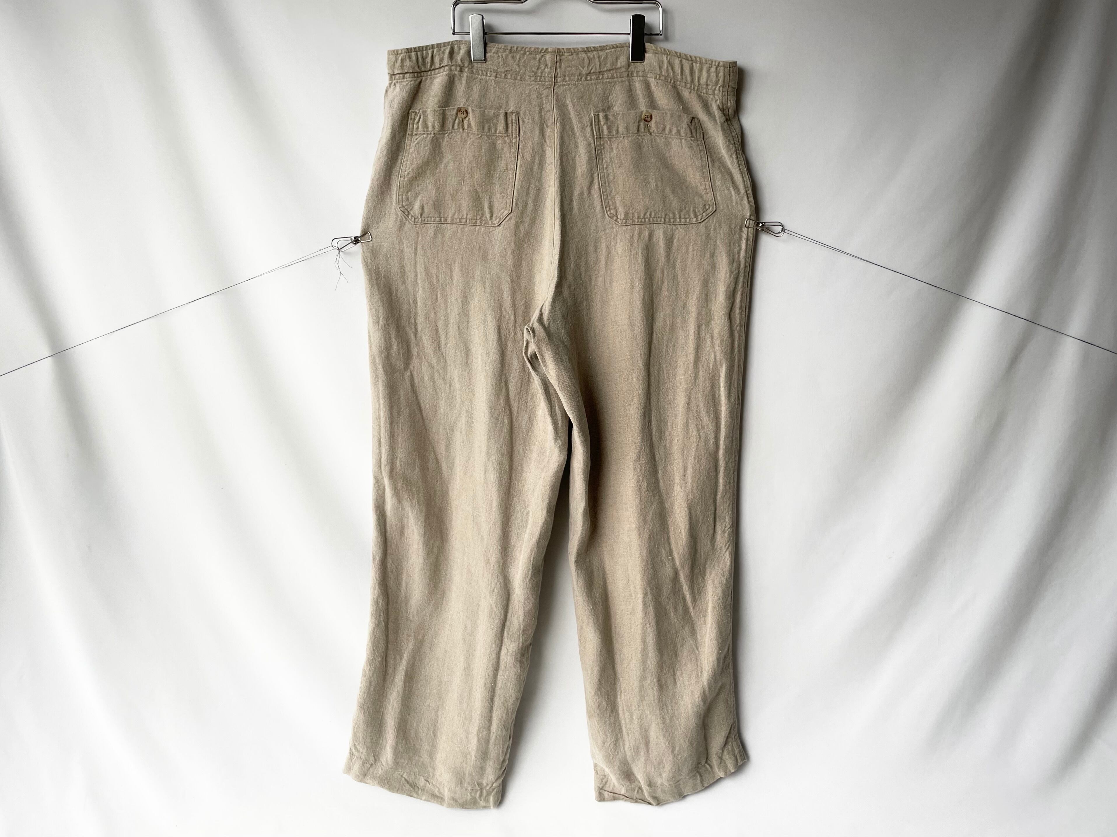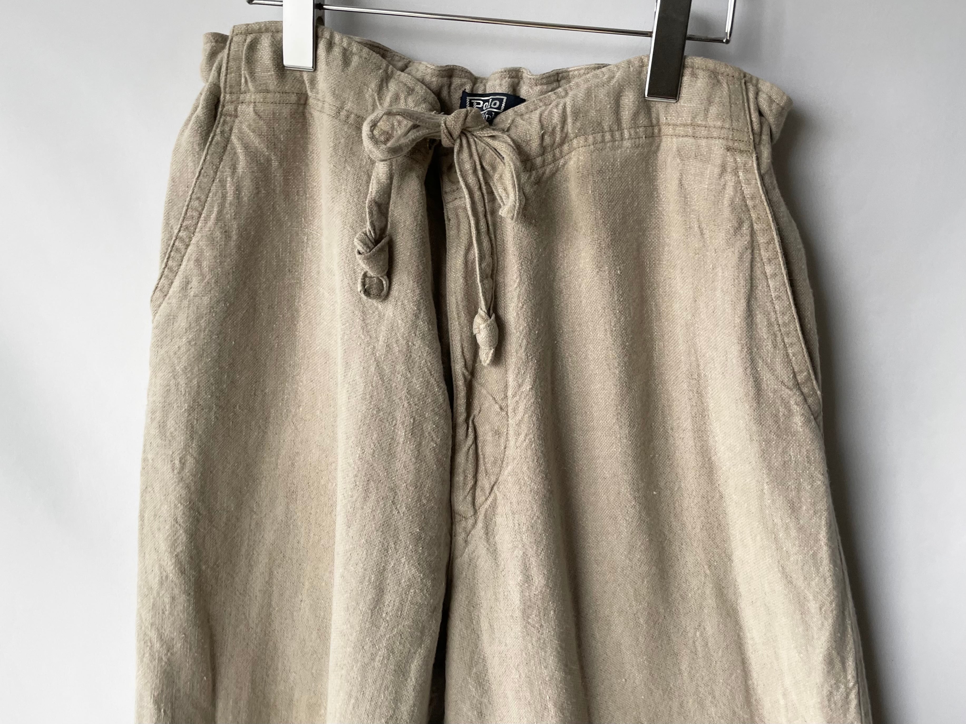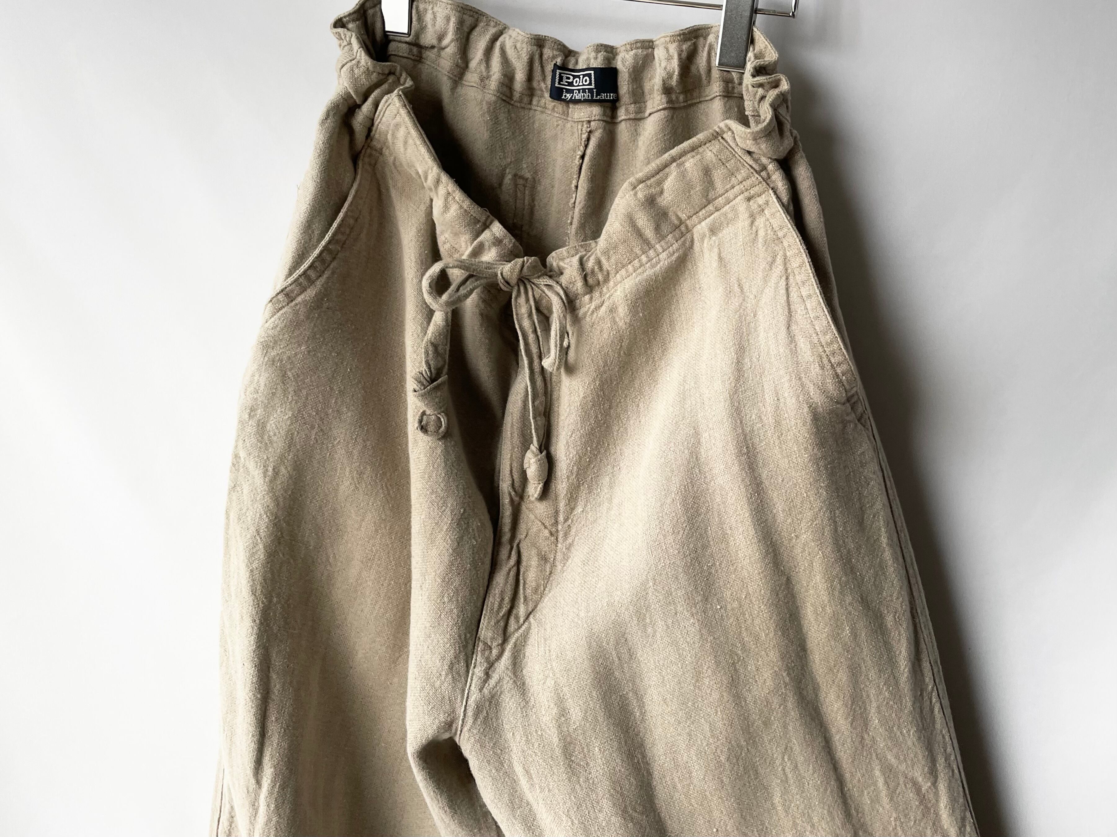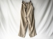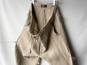 たっぷりな生地量を腰紐で絞る、ワイドイージースラックス。
