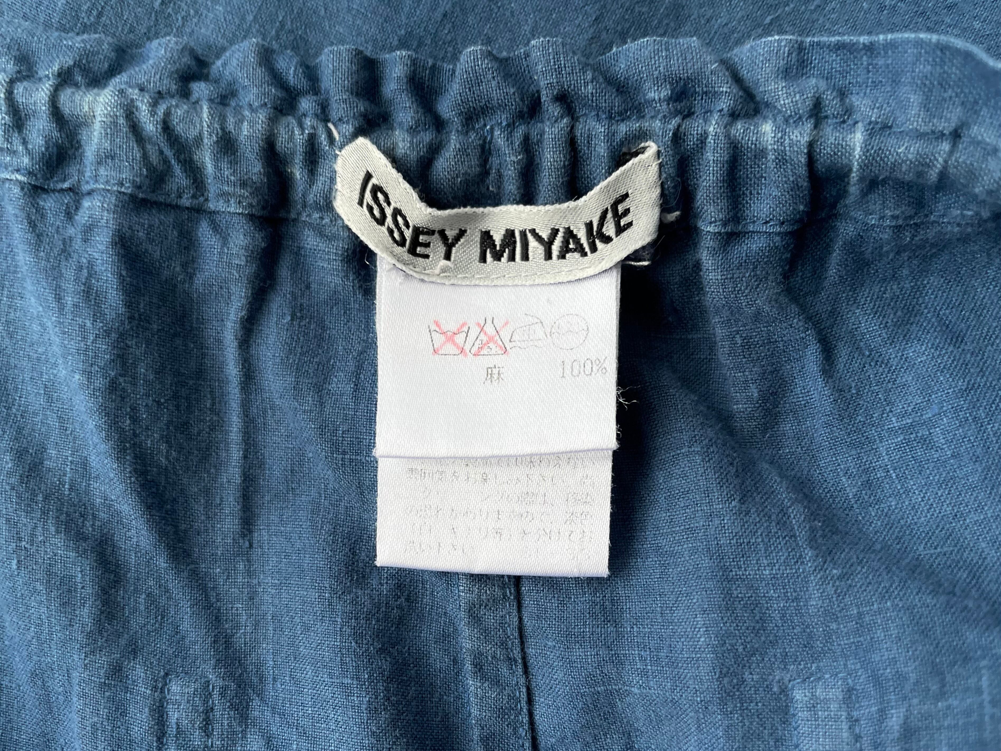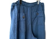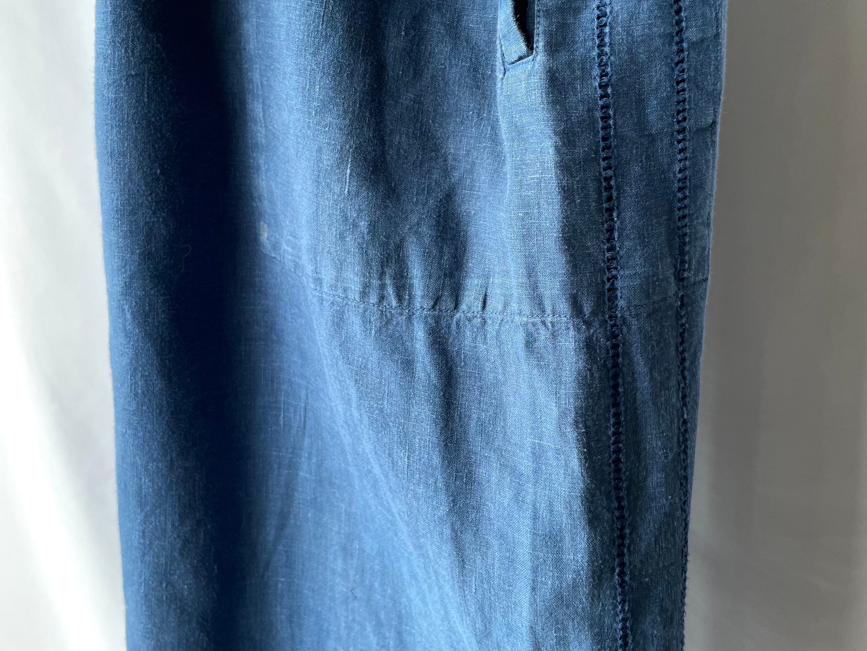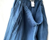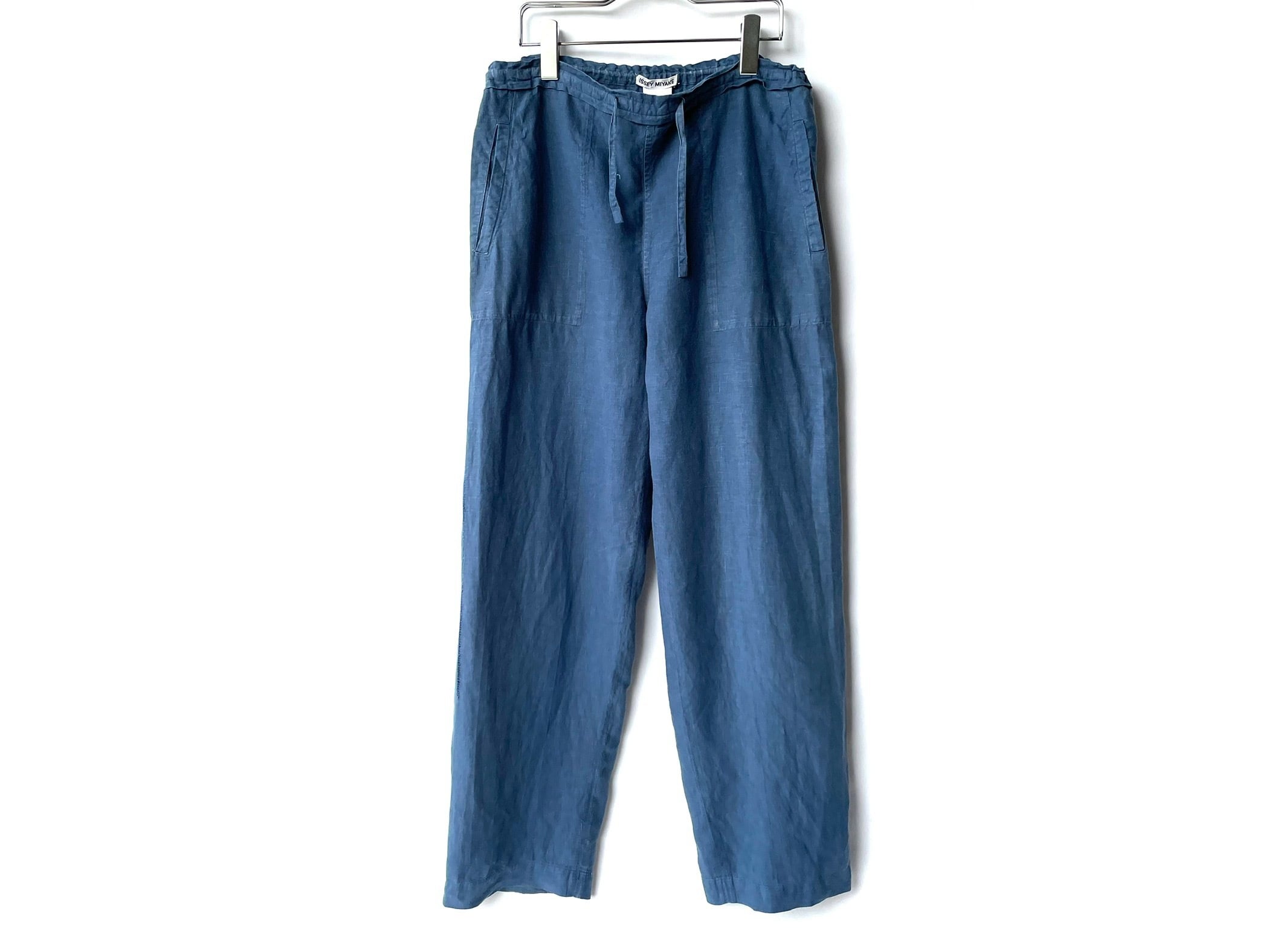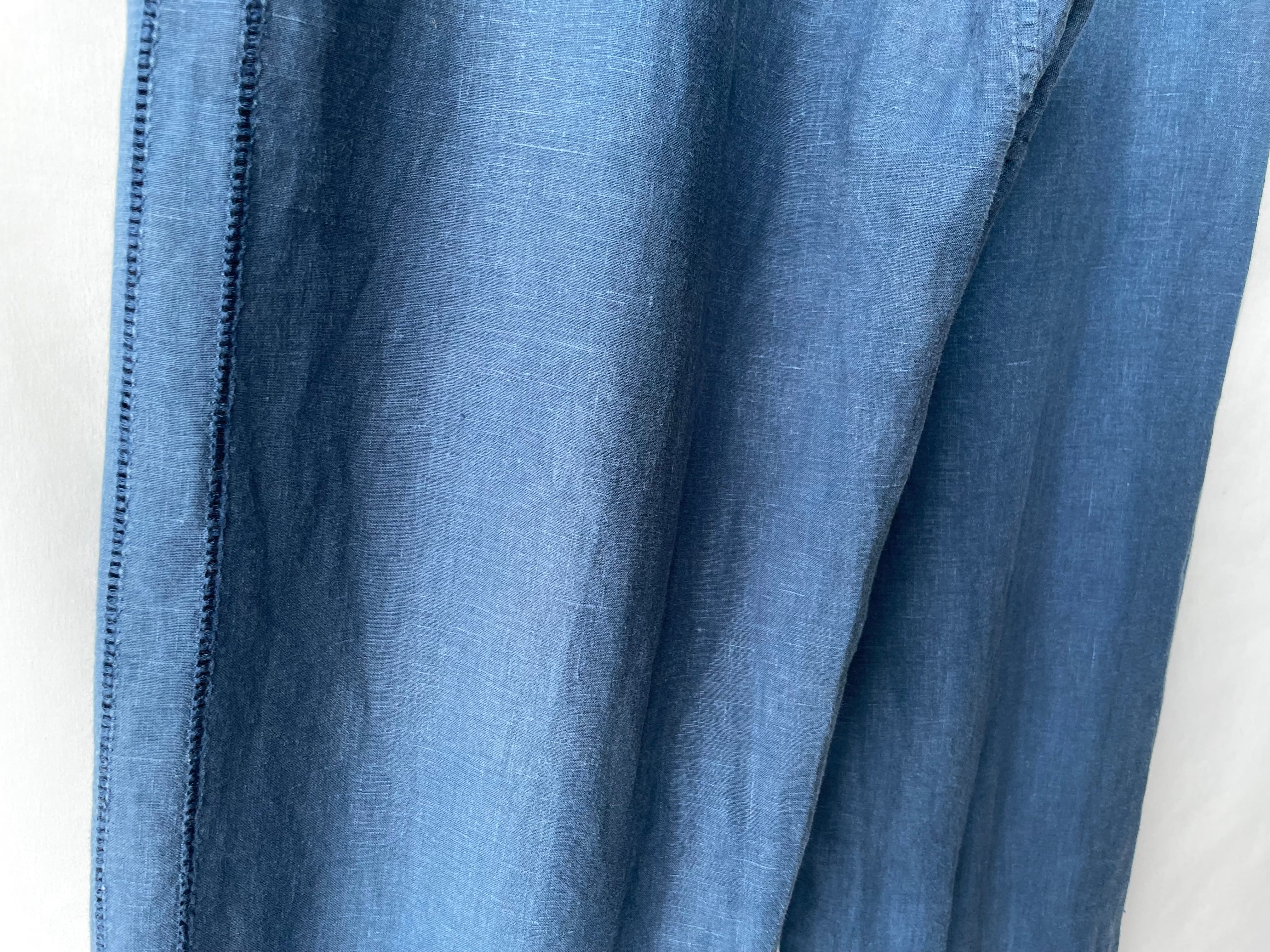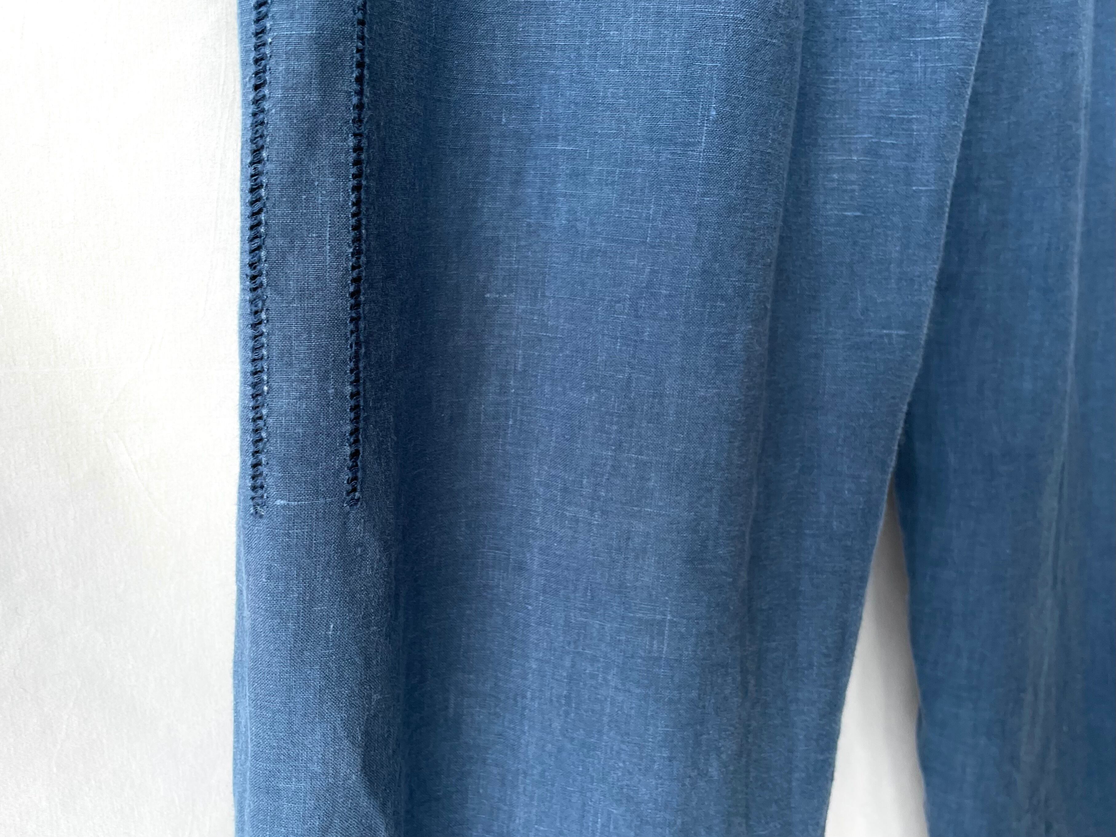 淡いブルーの上質なピュアリネンで仕立てられた、イージーウエストのベイカーパンツ。