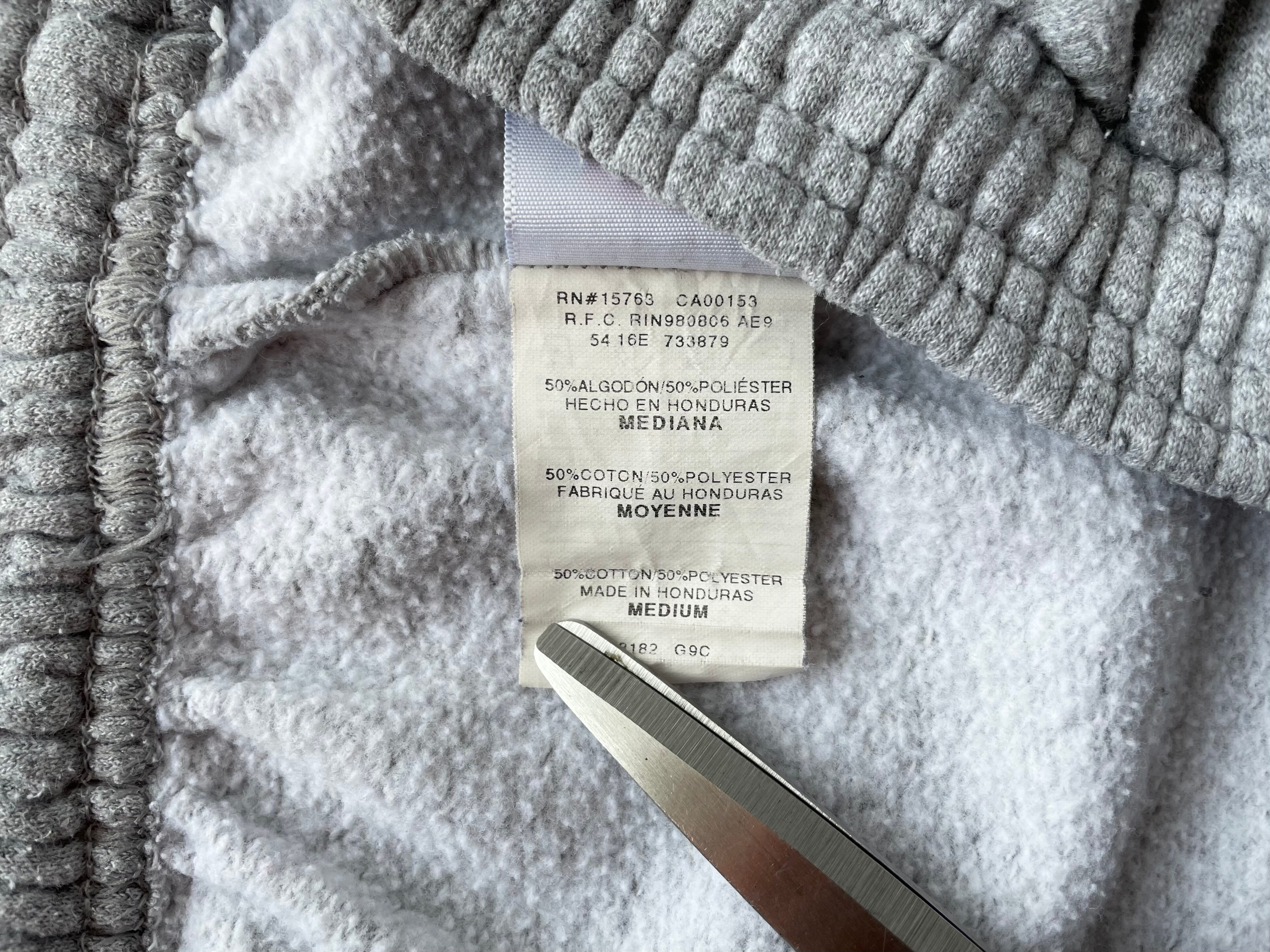 The sweatshirt gray body has a wide silhouette with an M designation.