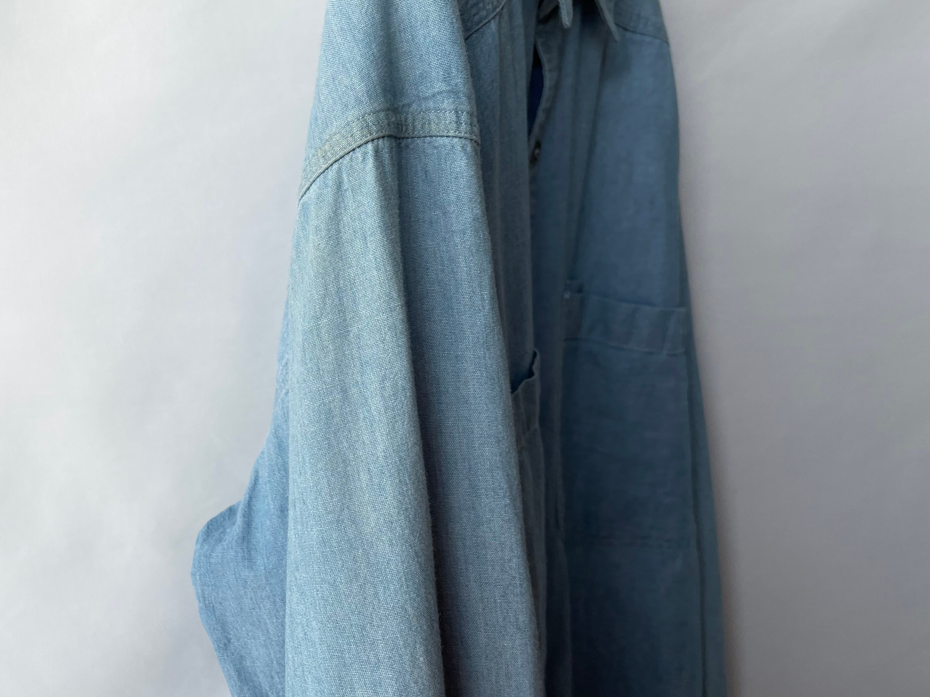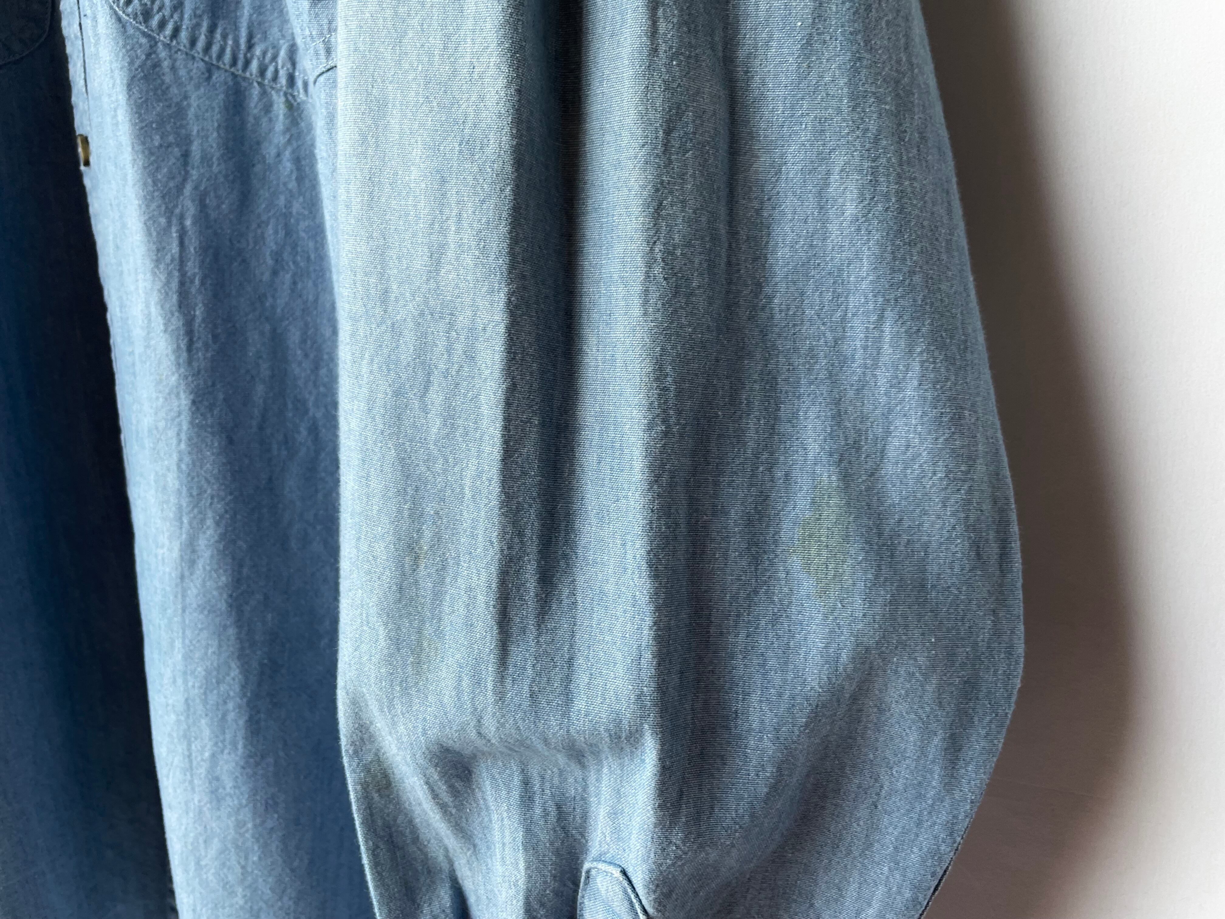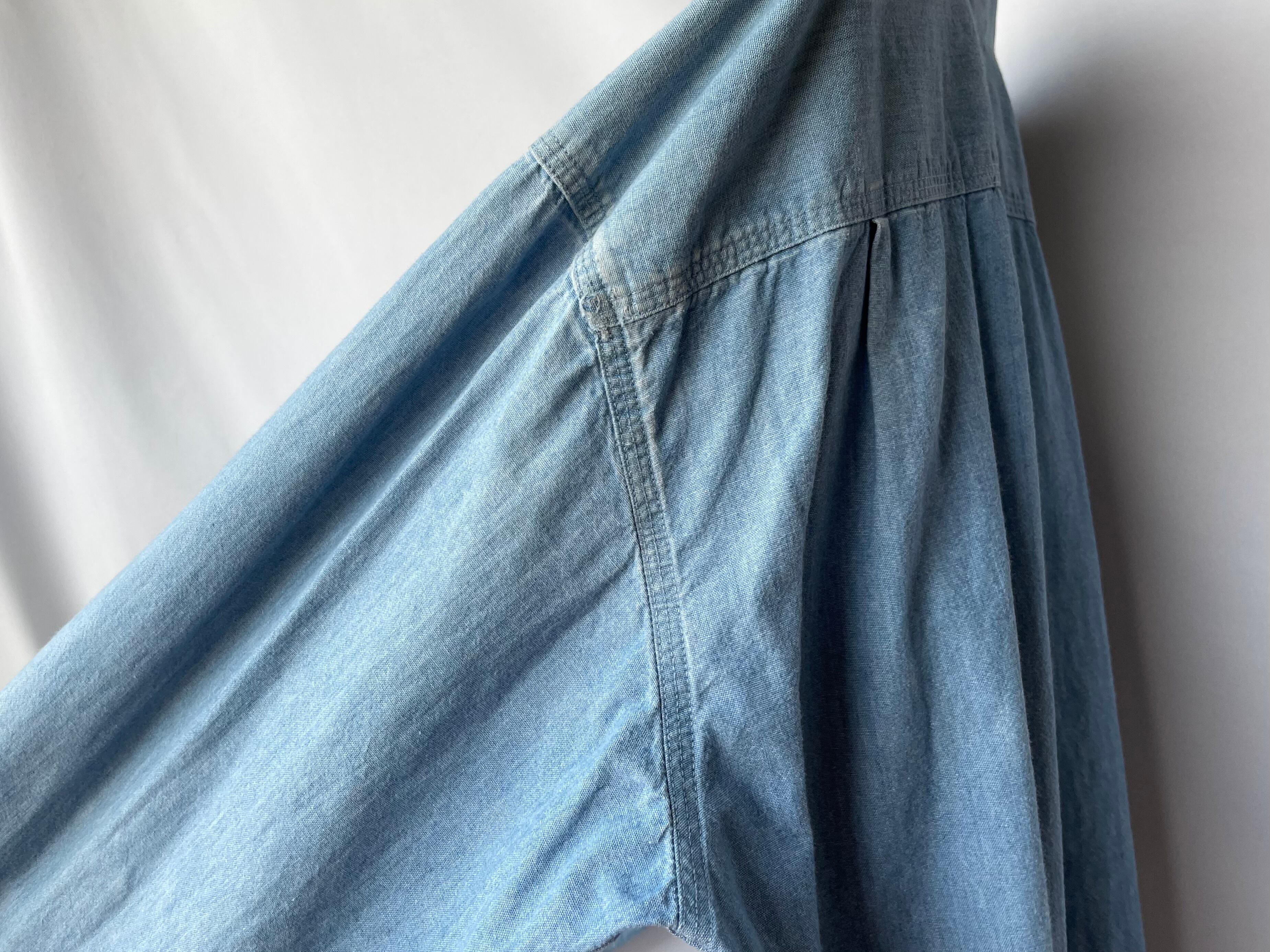 Cotton chambray body with a light blue color and a nice texture.