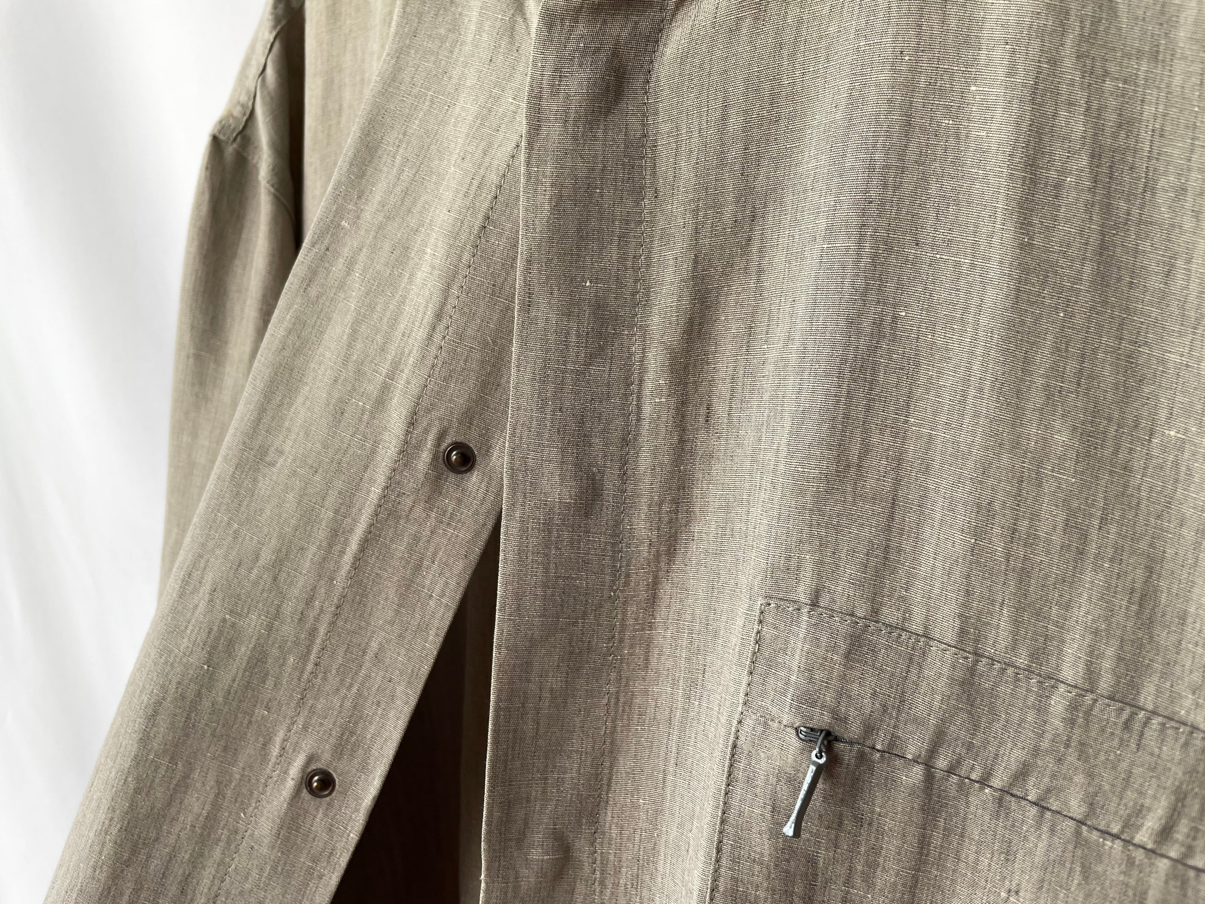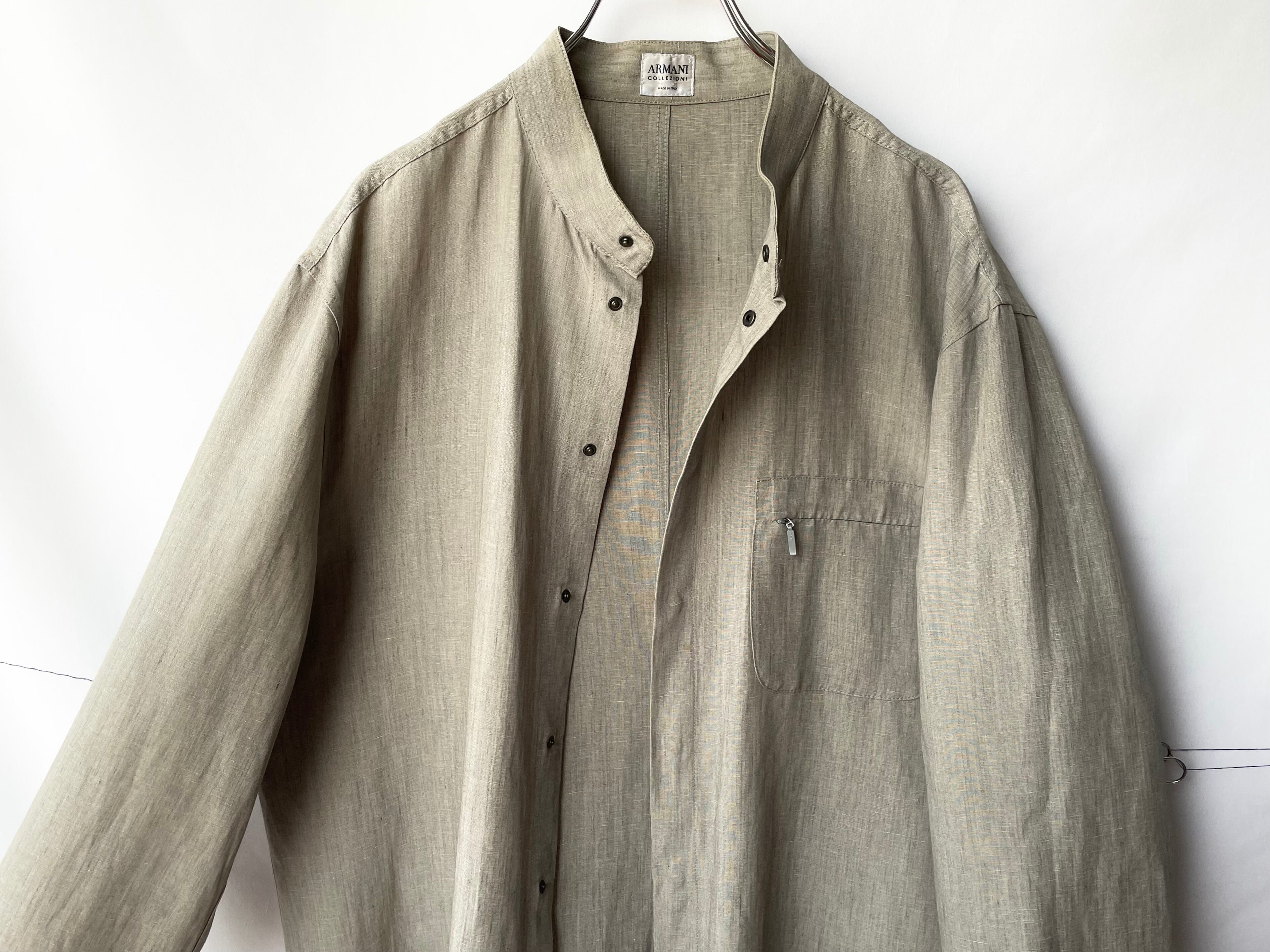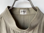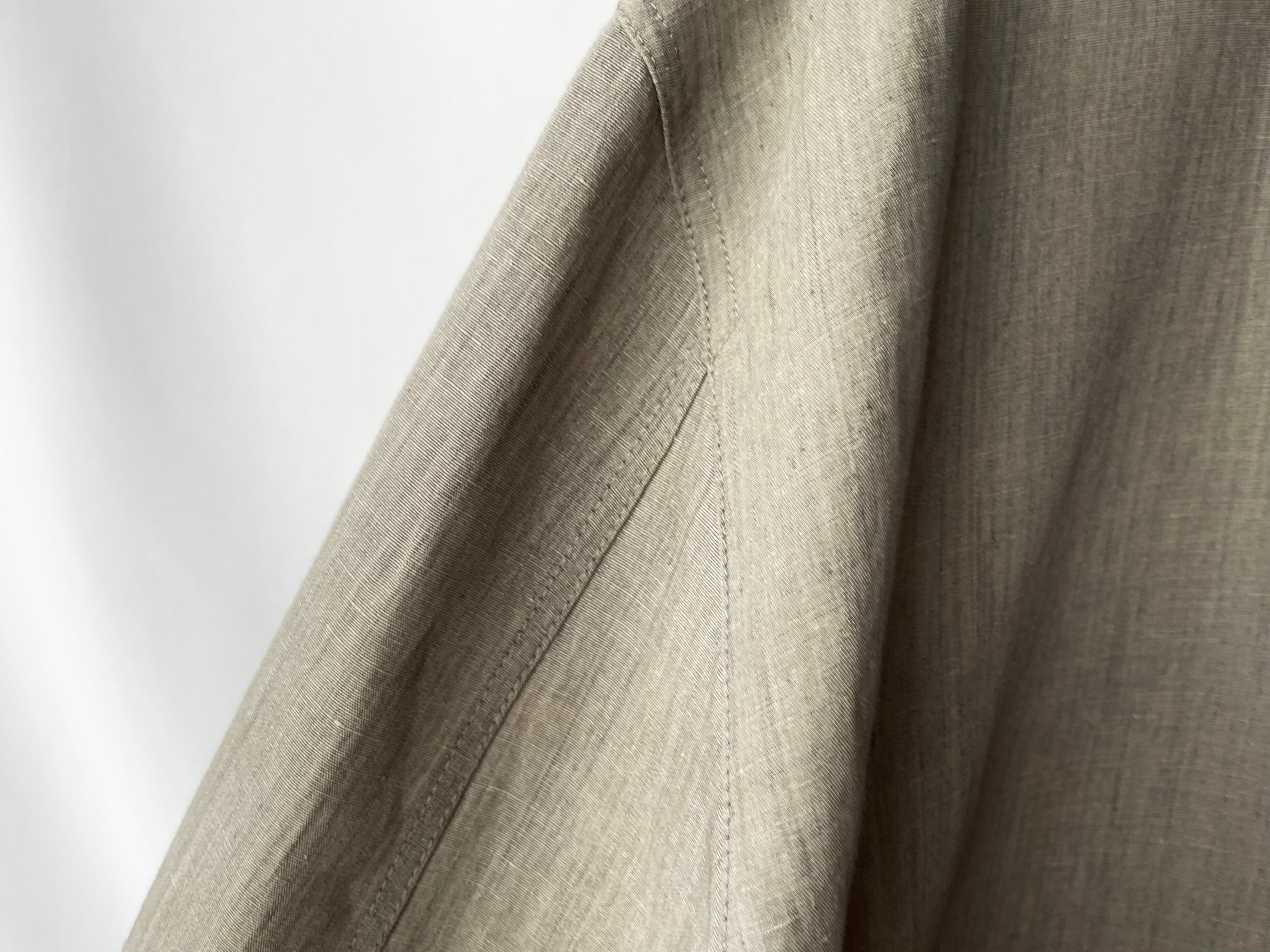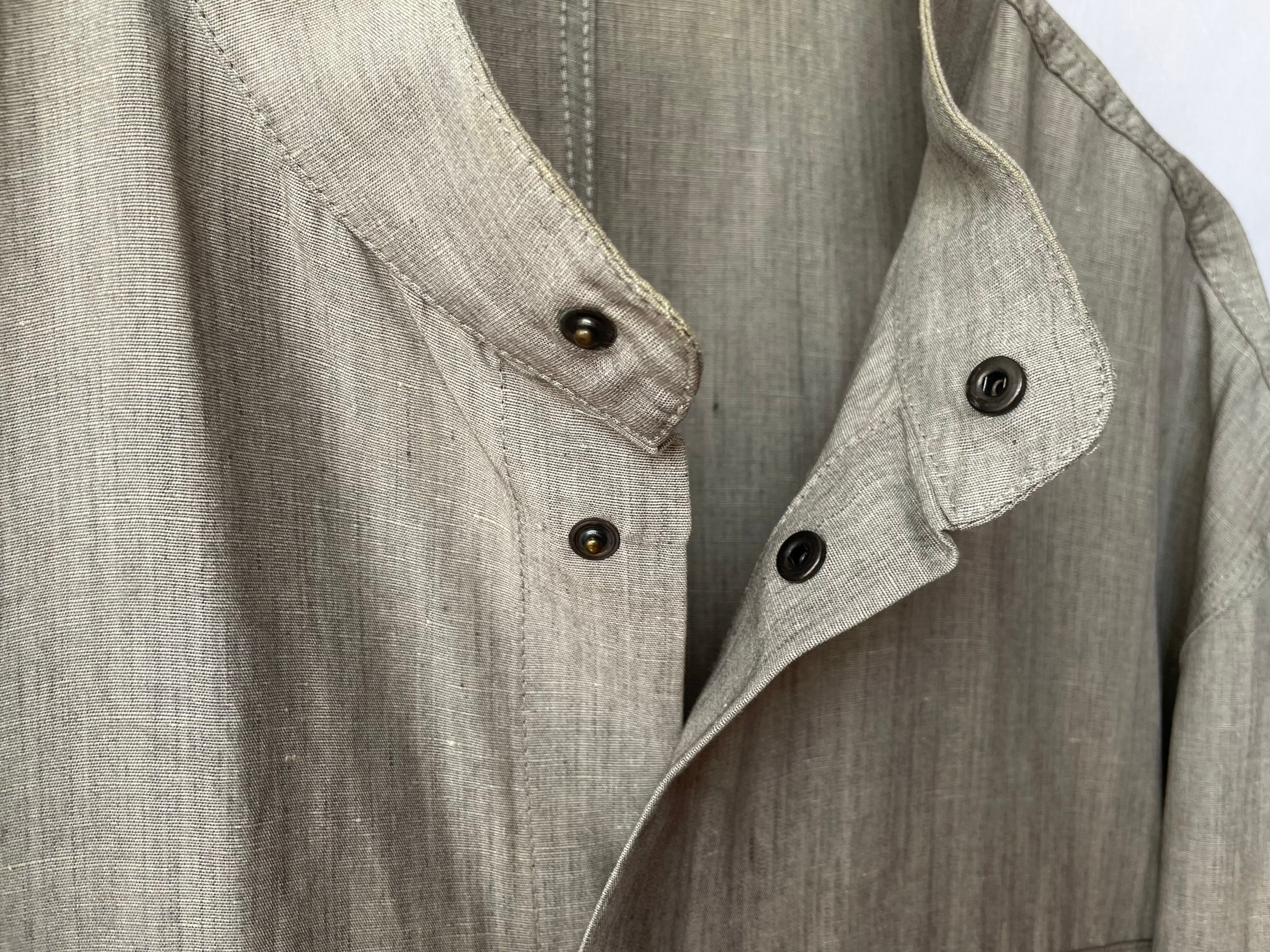 襟高の低いバンドカラーに、カフスレスのワイドスリーブ。