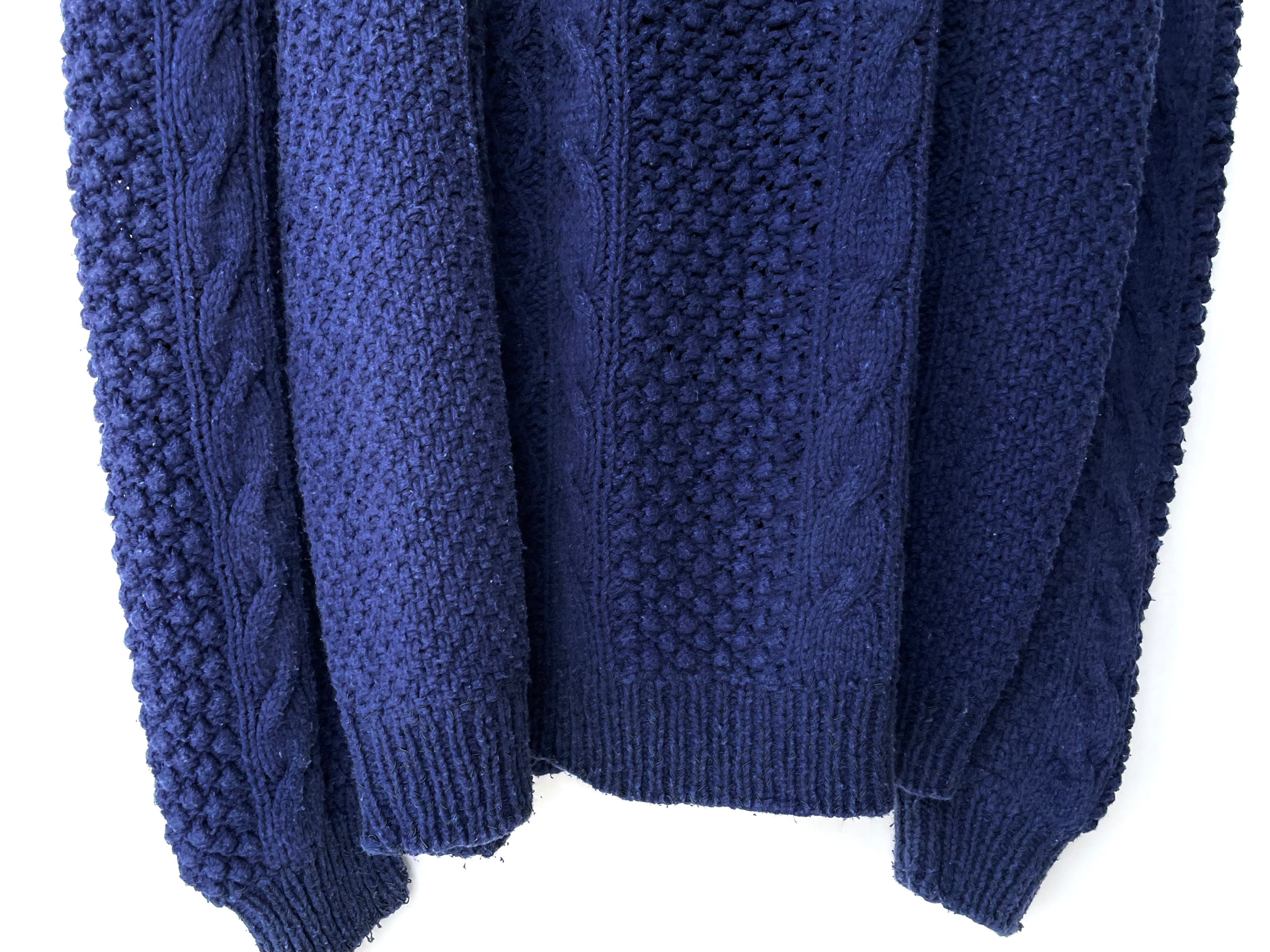 数種の編みで切り替わる伝統的なフィッシャーマンニットの形ですが、
