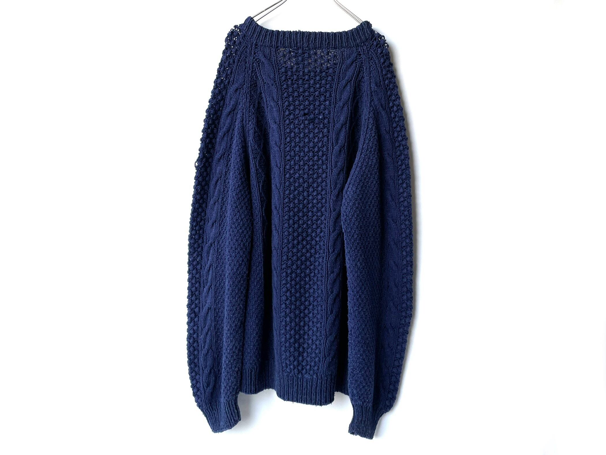 It is a traditional fisherman's knit shape that changes between several types of knitting, but this one is made of high-quality 75% silk/25% cotton S/S fabric and has a modern dark navy coloring.