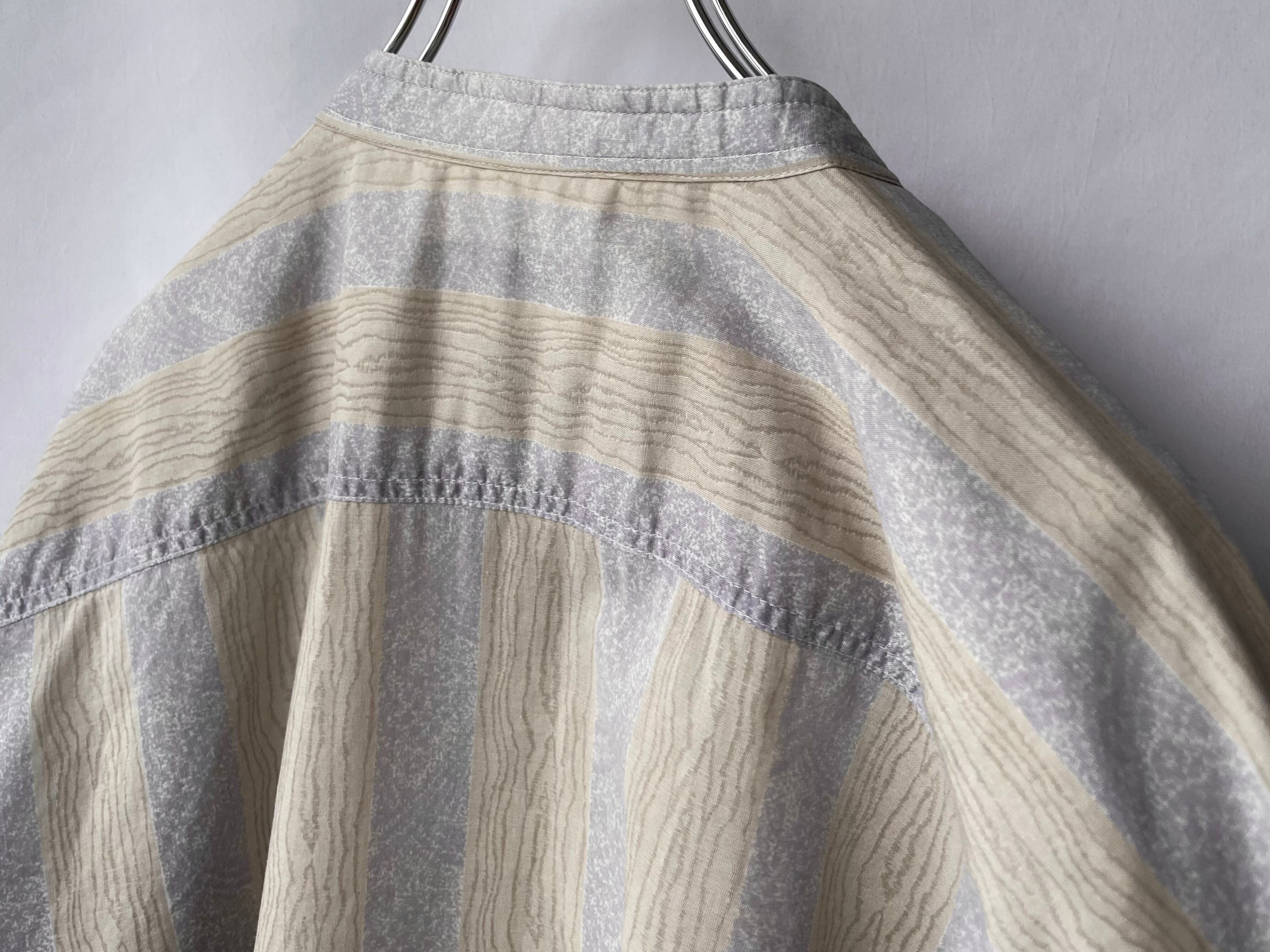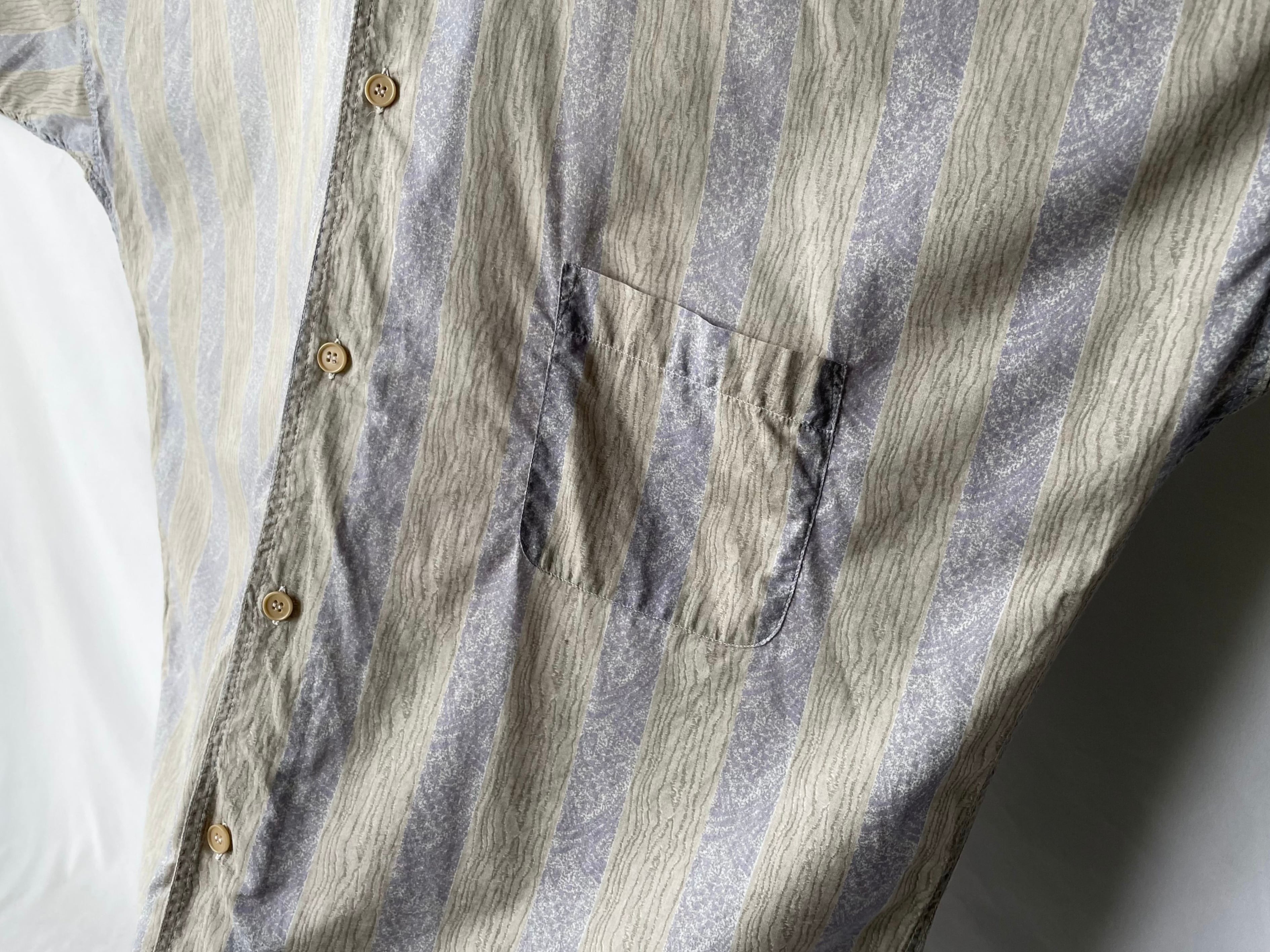 ぼんやりとしたモザイクパターン×木目調のファットストライプ。