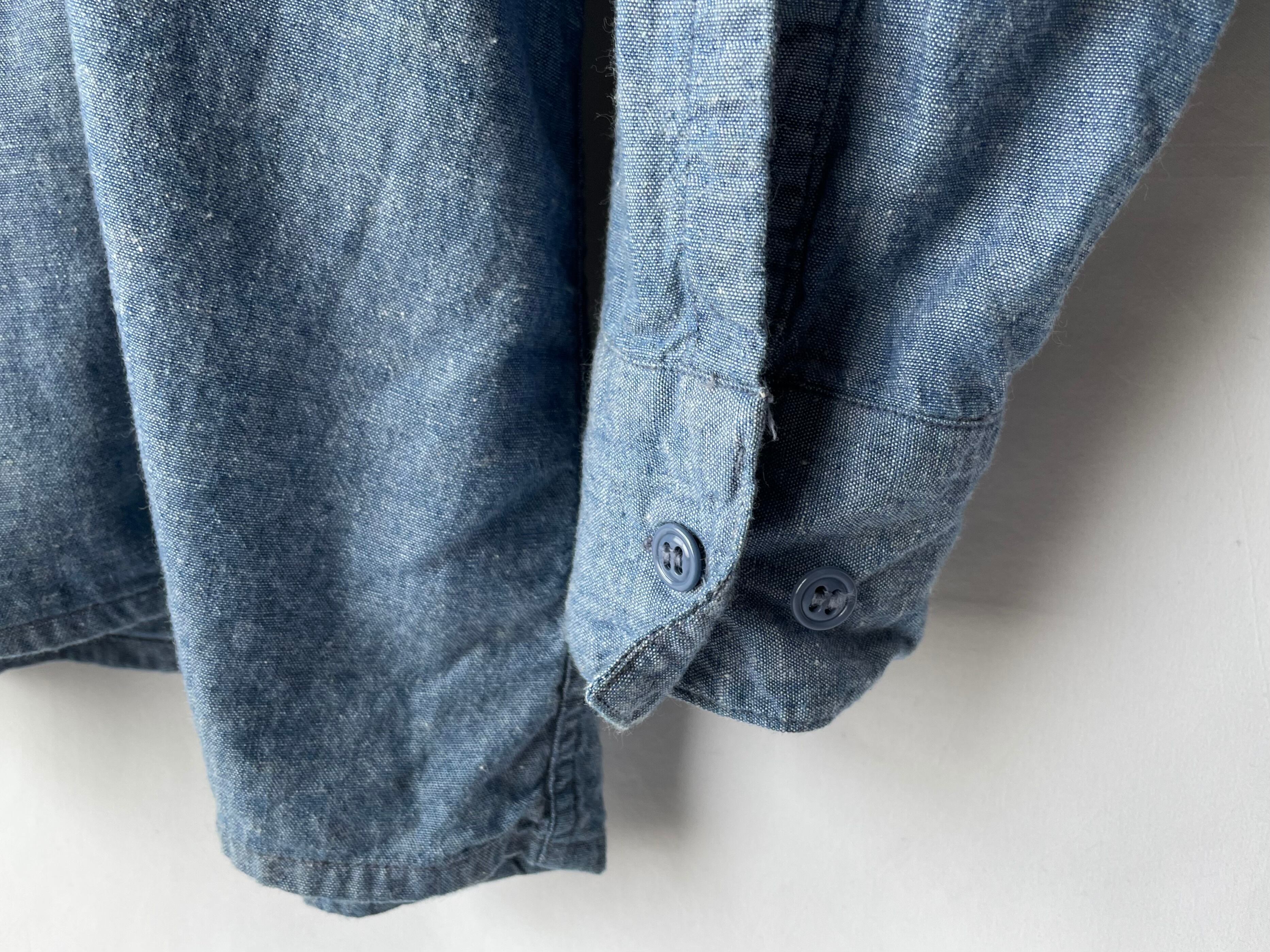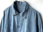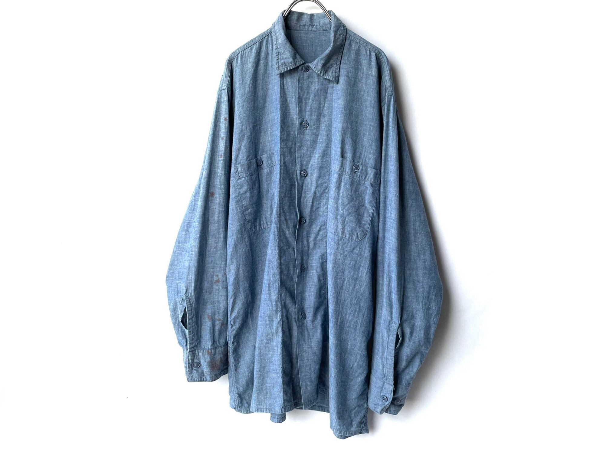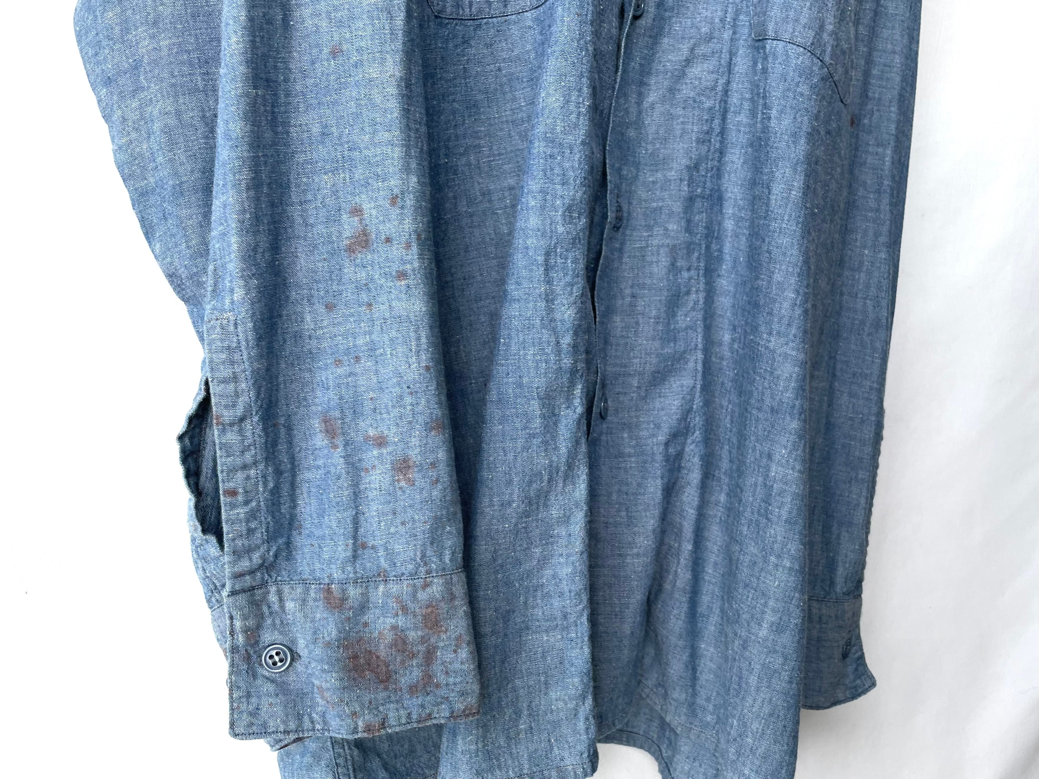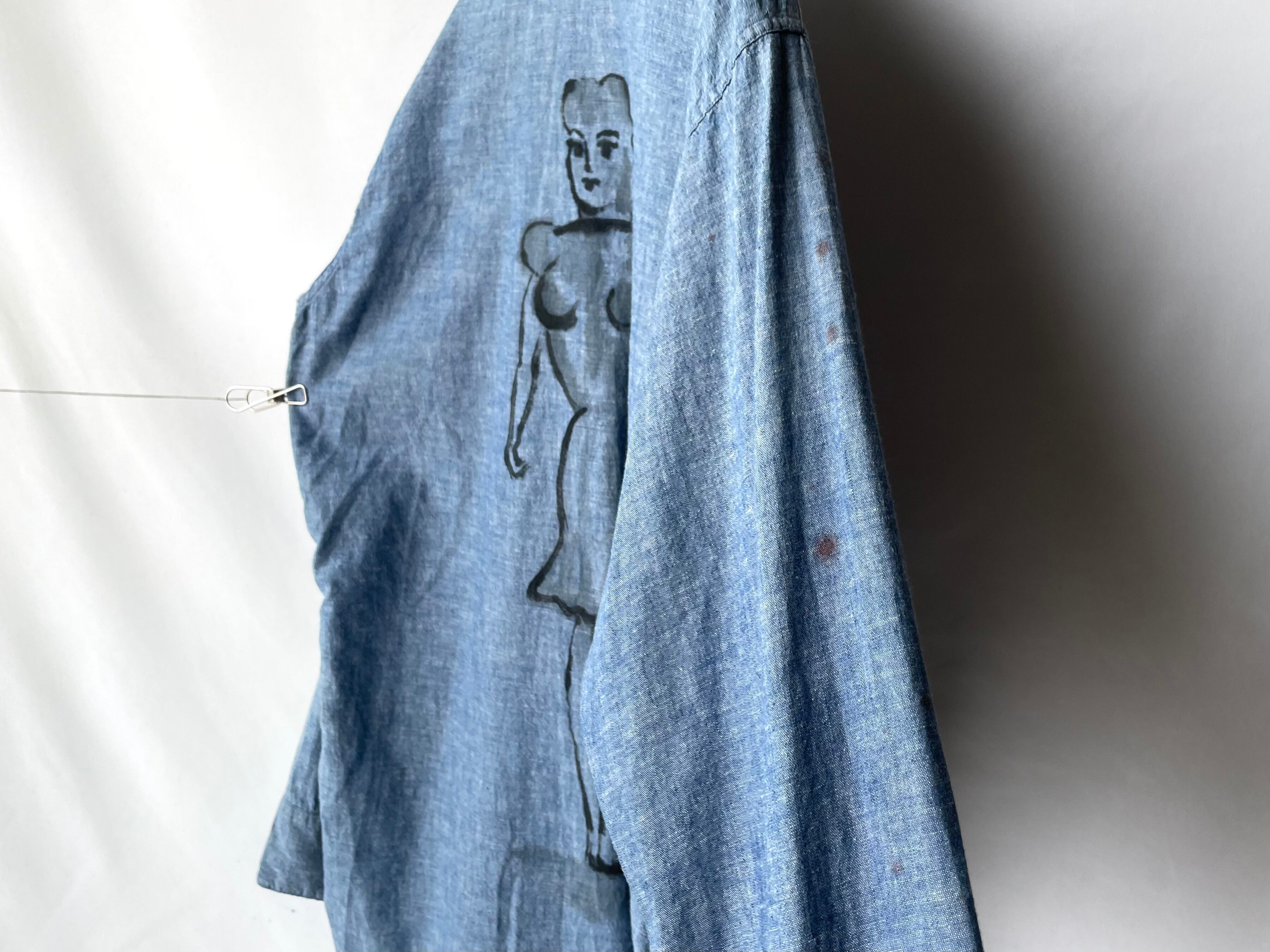 1960年代のU.S.NAVYシャンブレーシャツをキャンバスに、背面に古風な女性が描かれたアートペイント。