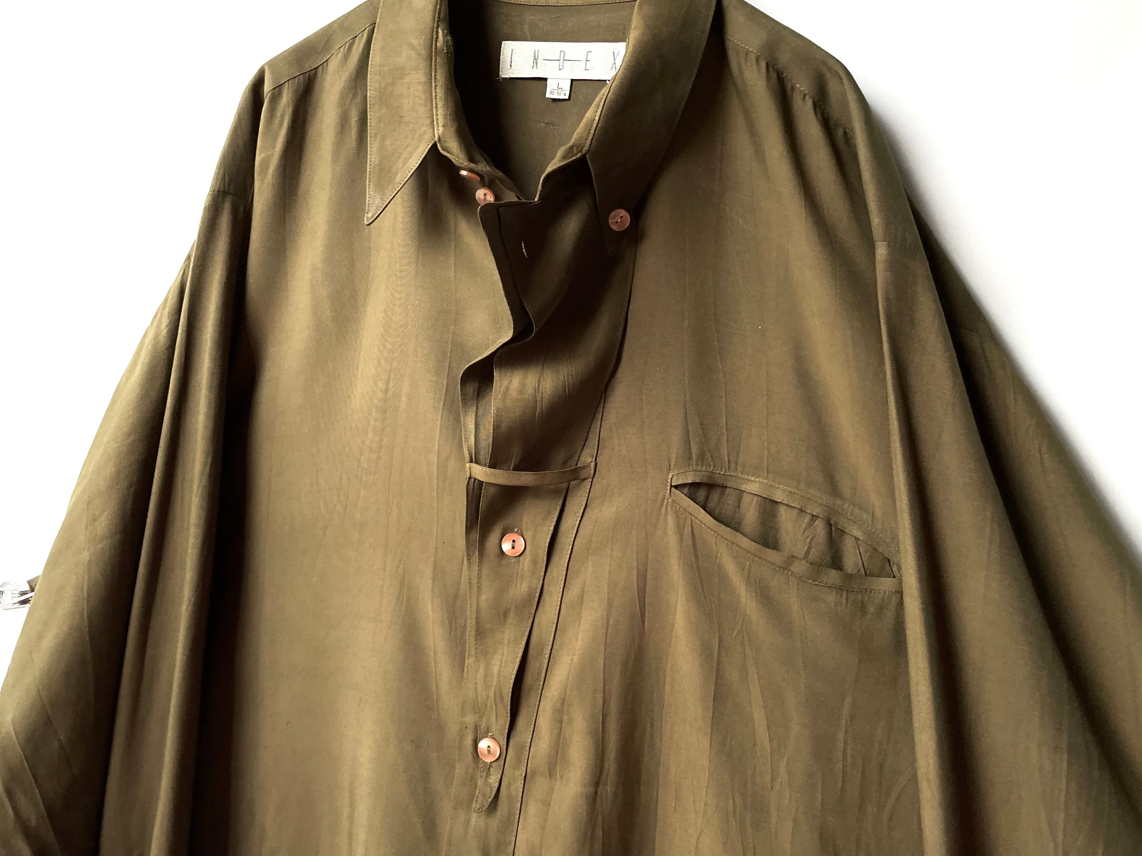Double placket part with overlapping triangular fabric that overlaps deeply at the neck.