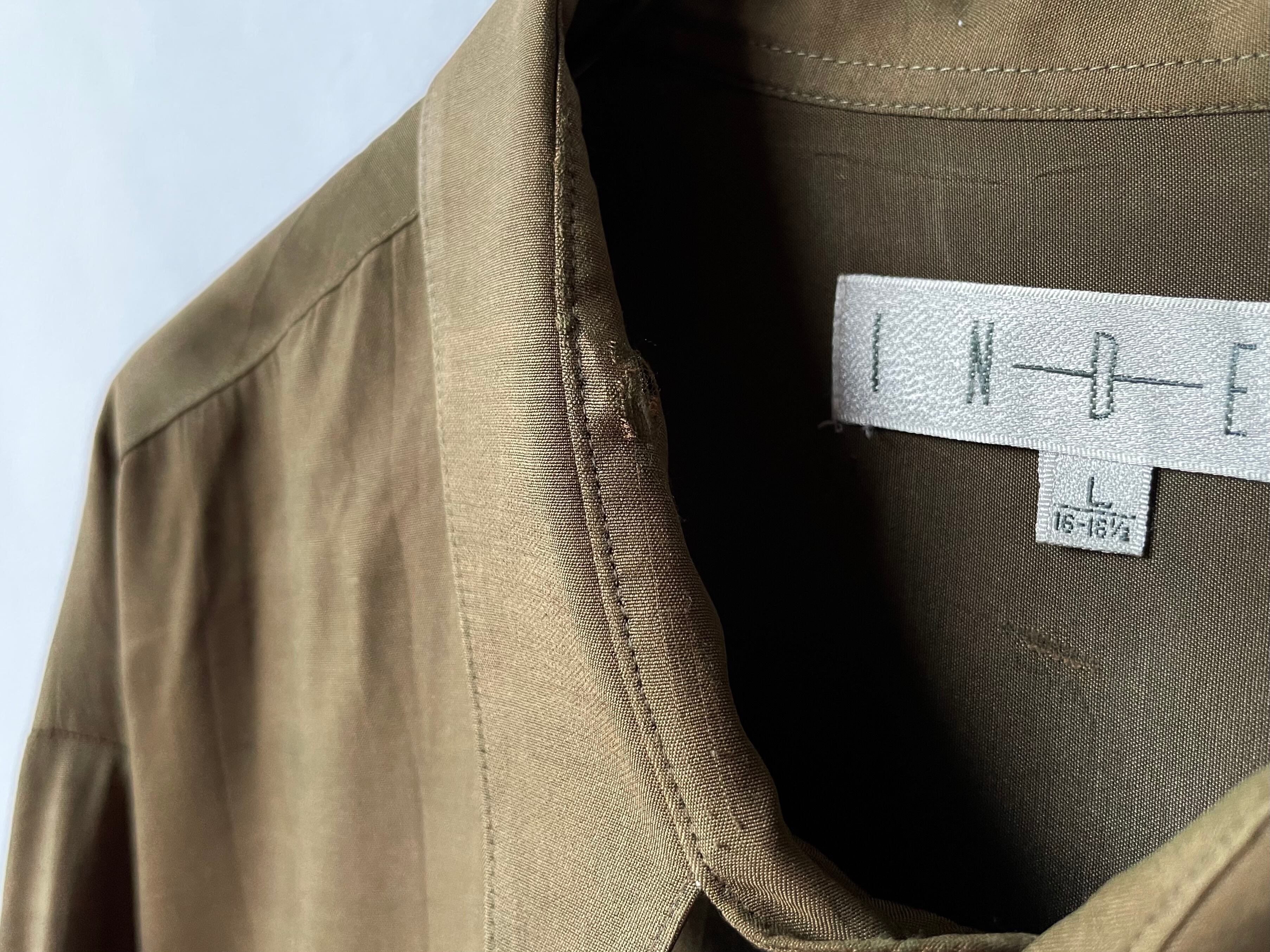 The small, sharp-angled collar is button-down only on the left side.