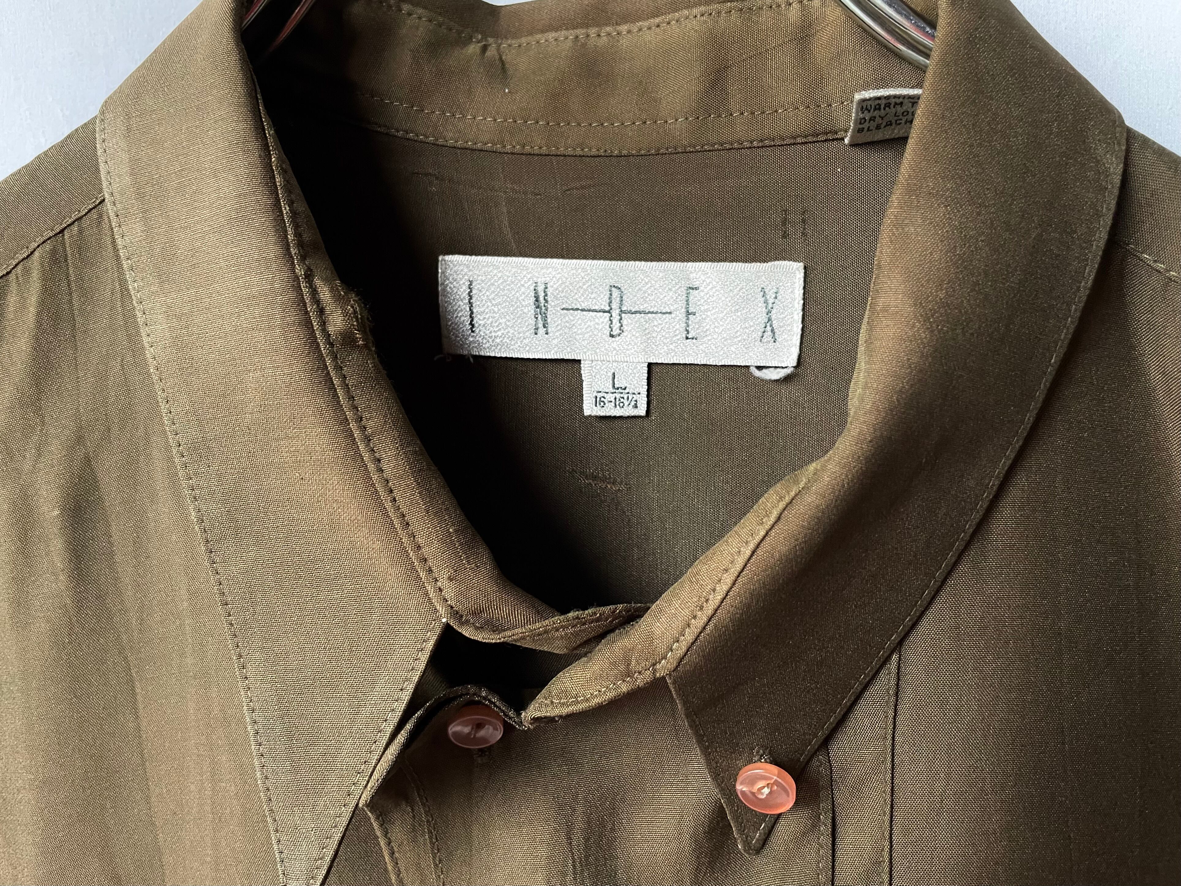 小ぶりで鋭角な襟は左側のみがボタンダウンの仕様。