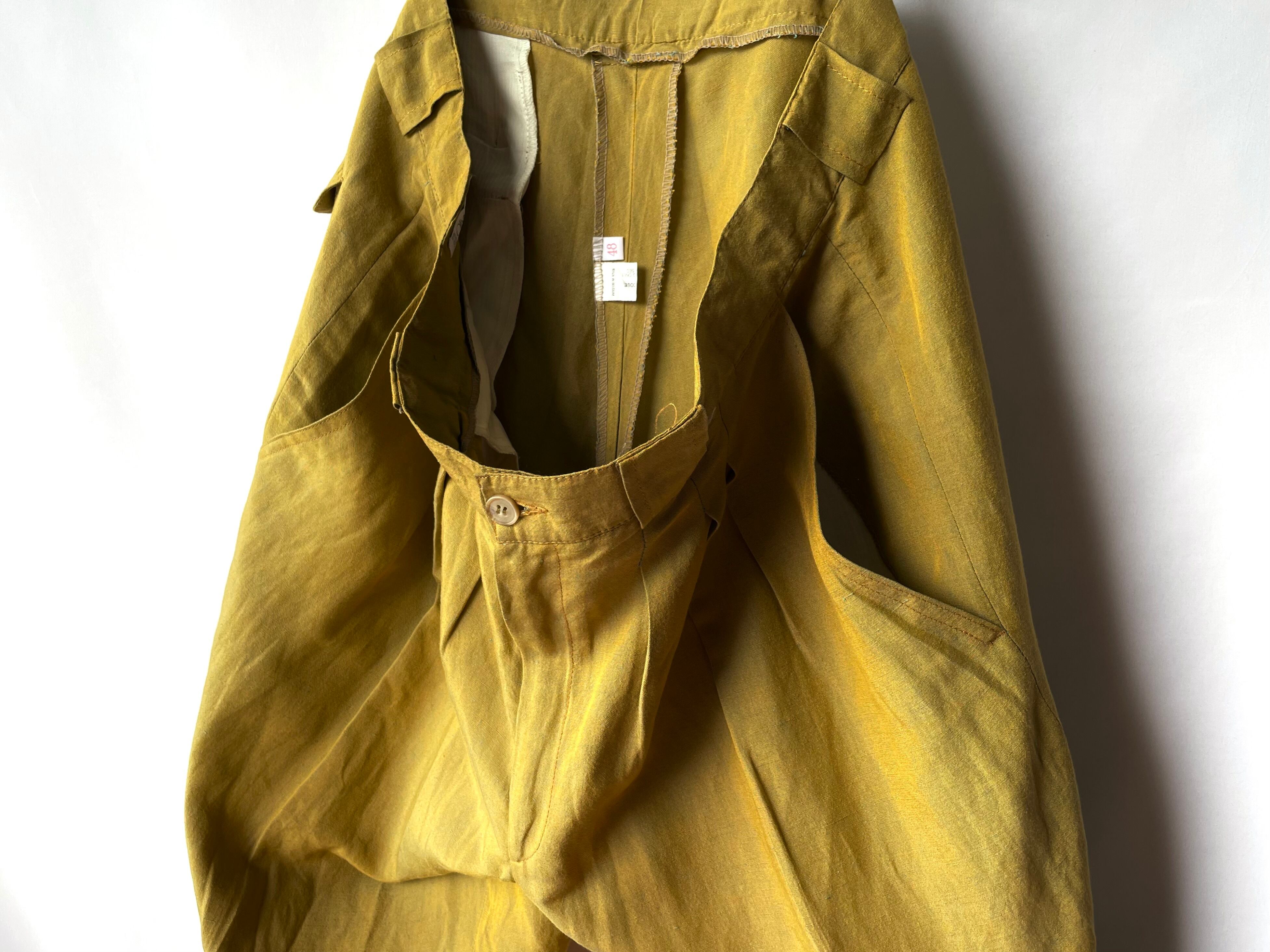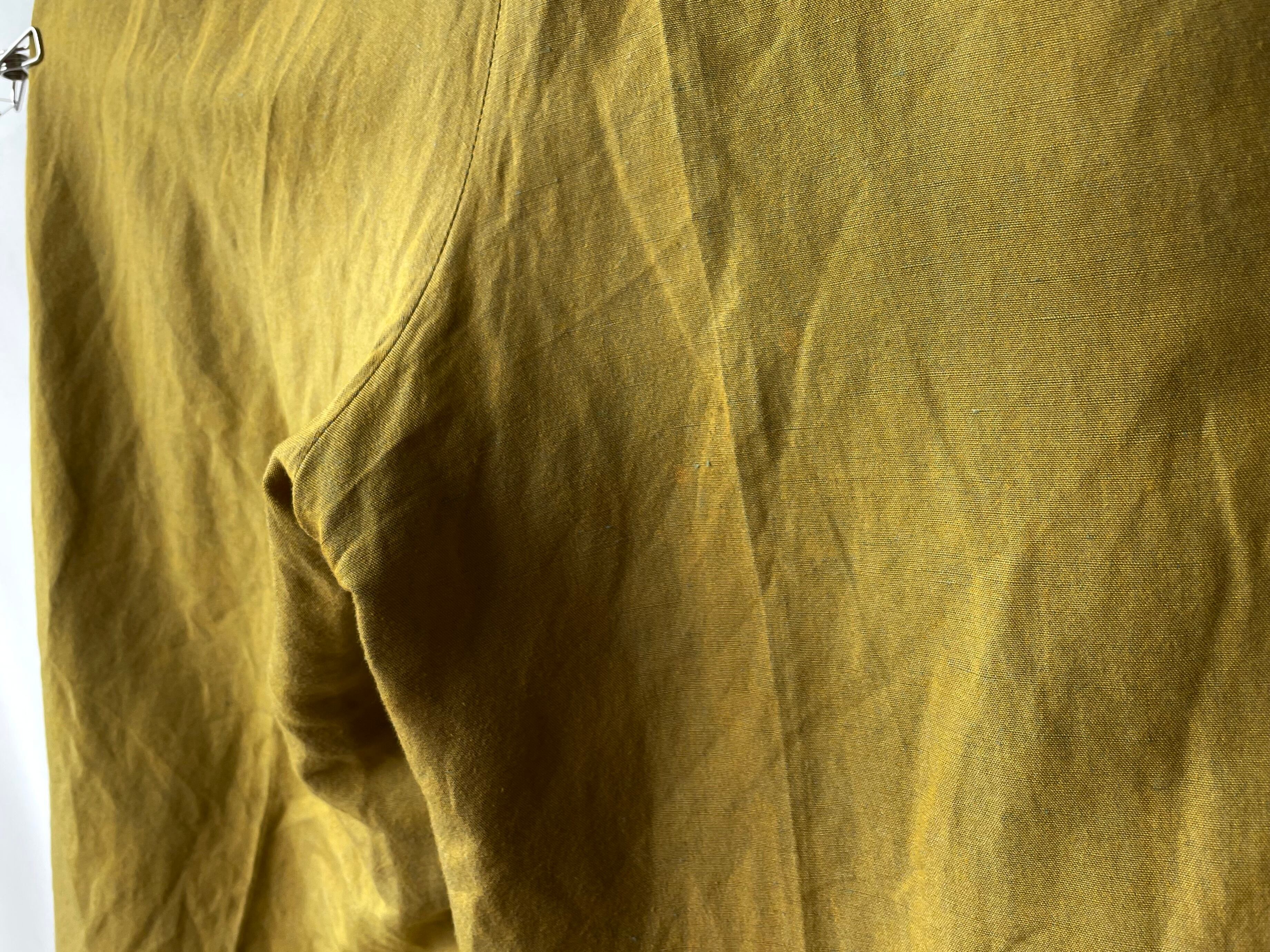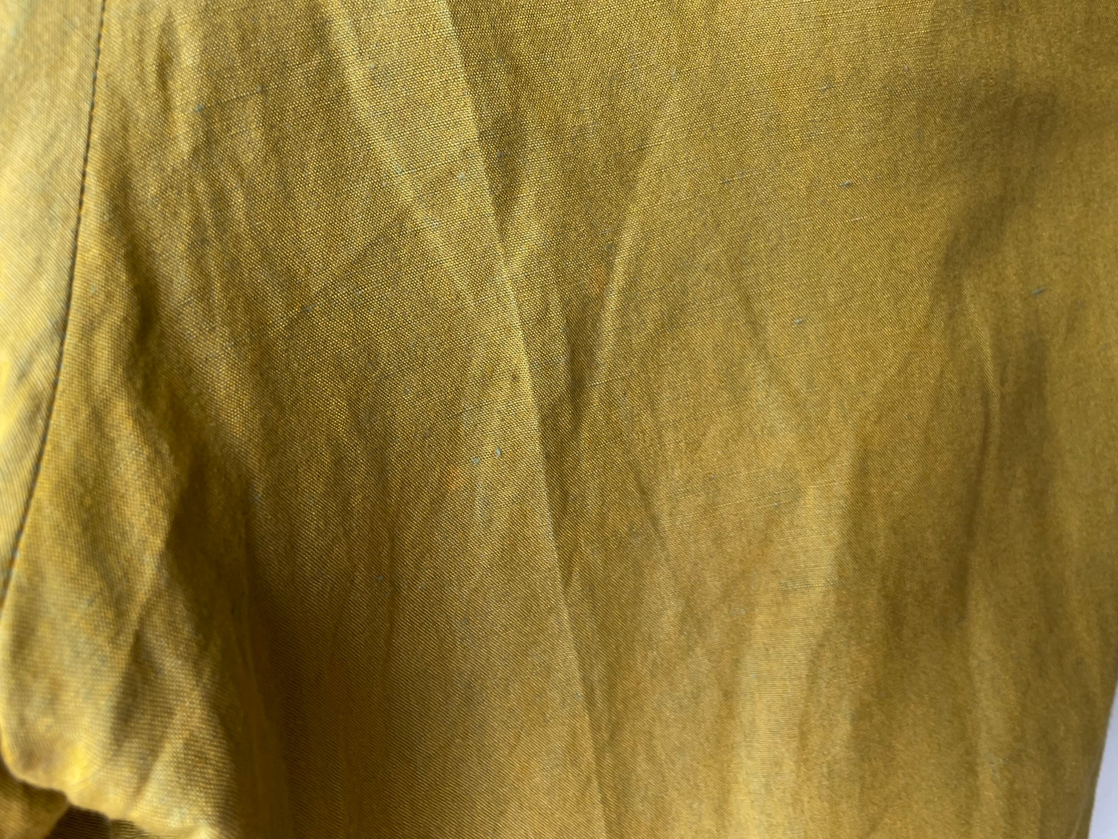A woven fabric with a finely woven mustard yellow and blue green thread that gives it a wonderful look typical of this label.