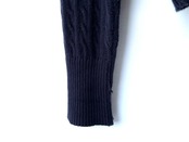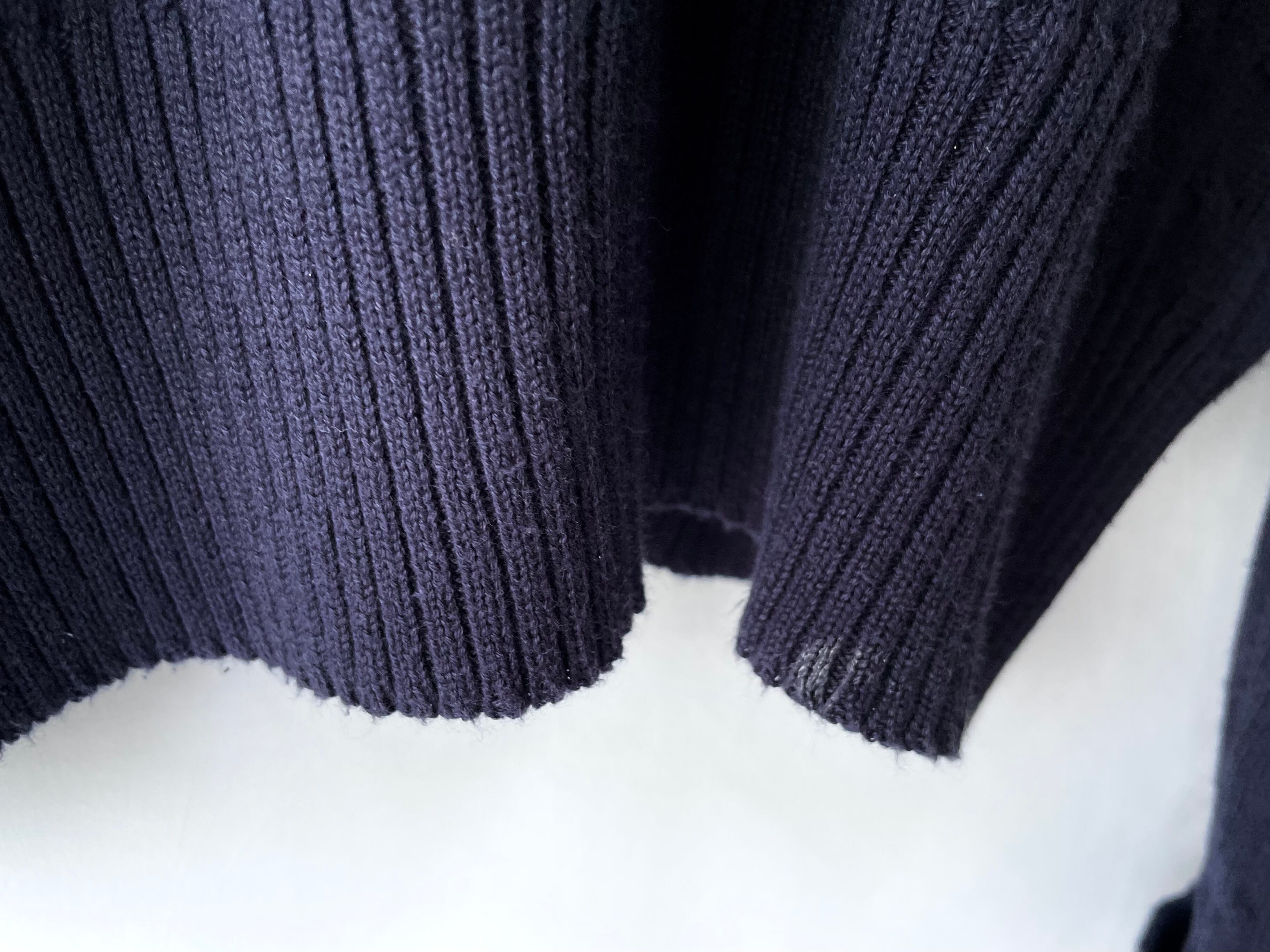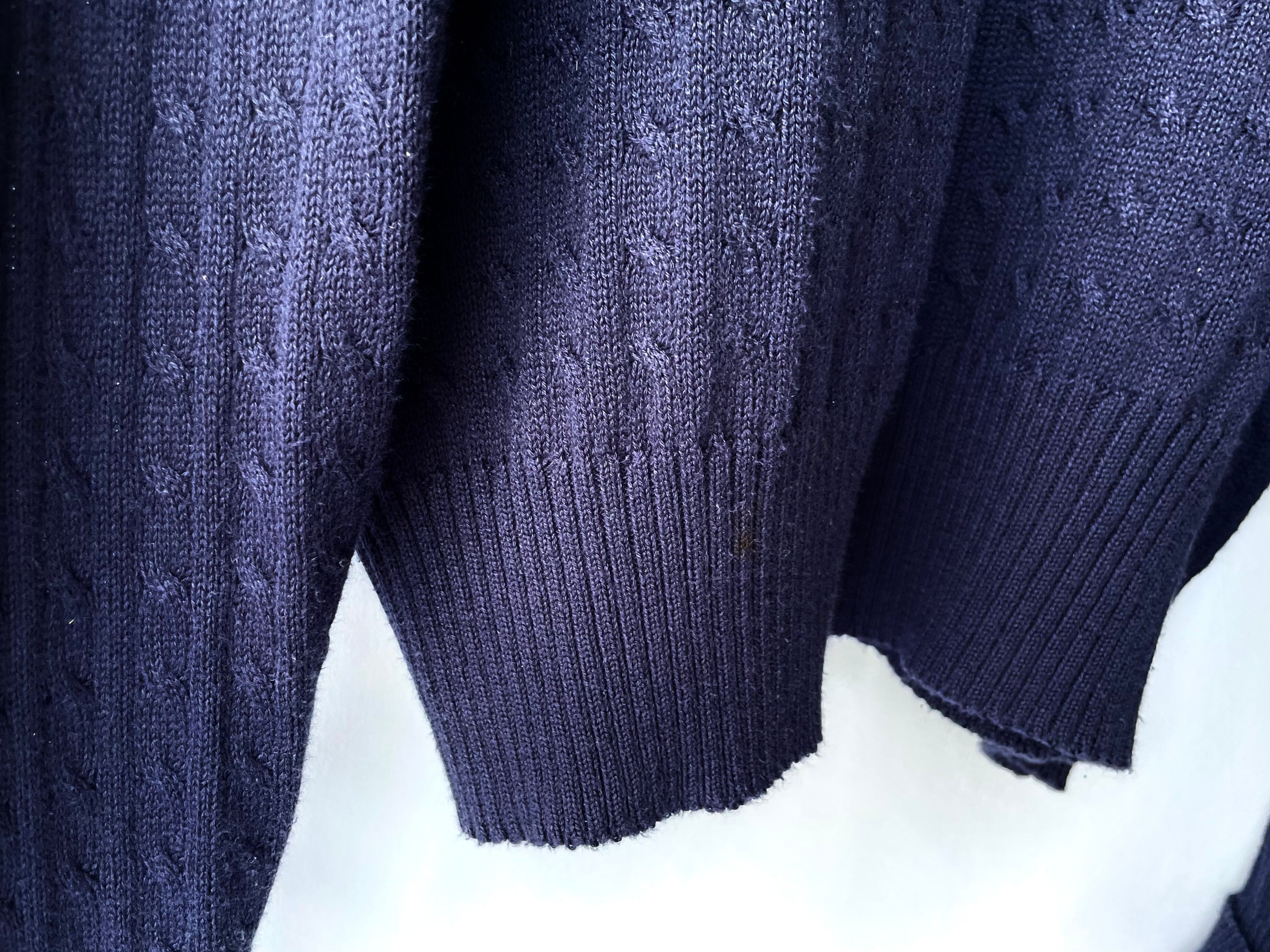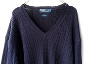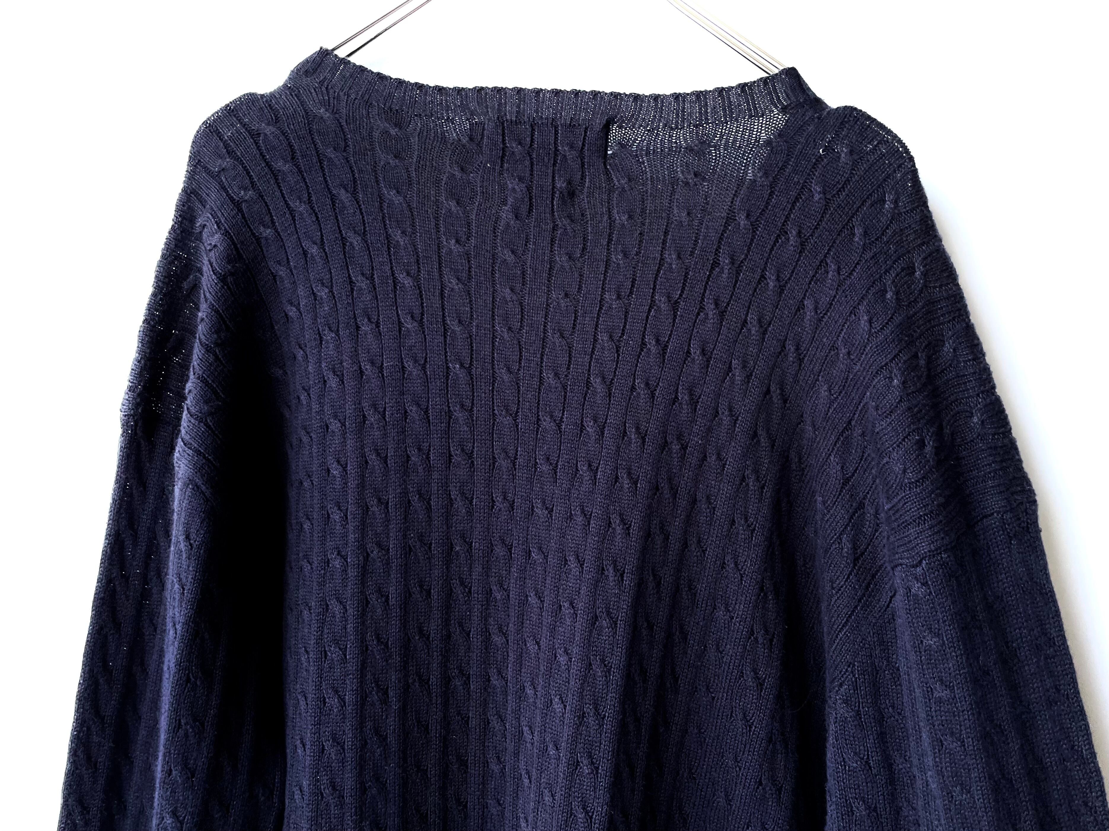 ゆとりのあるVネックで深い濃紺のケーブル編み。