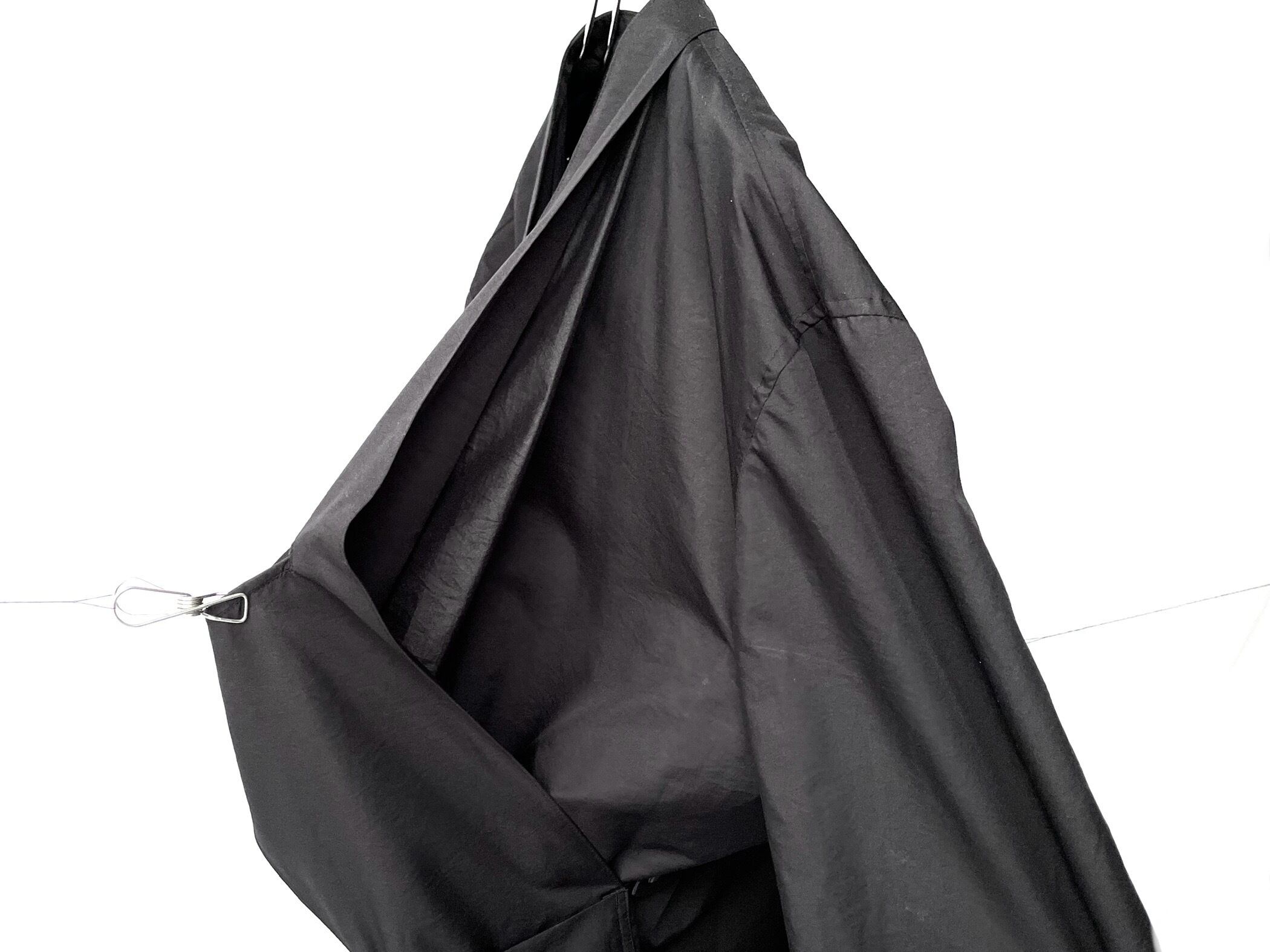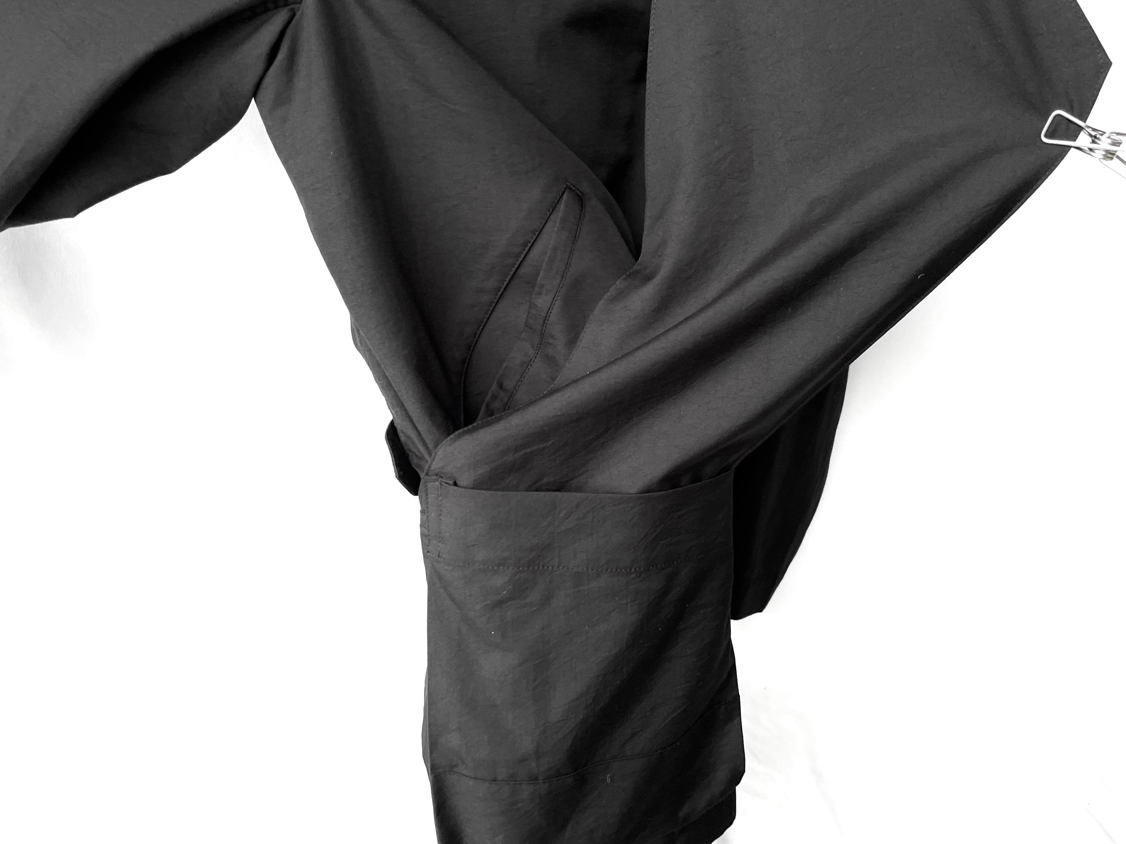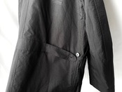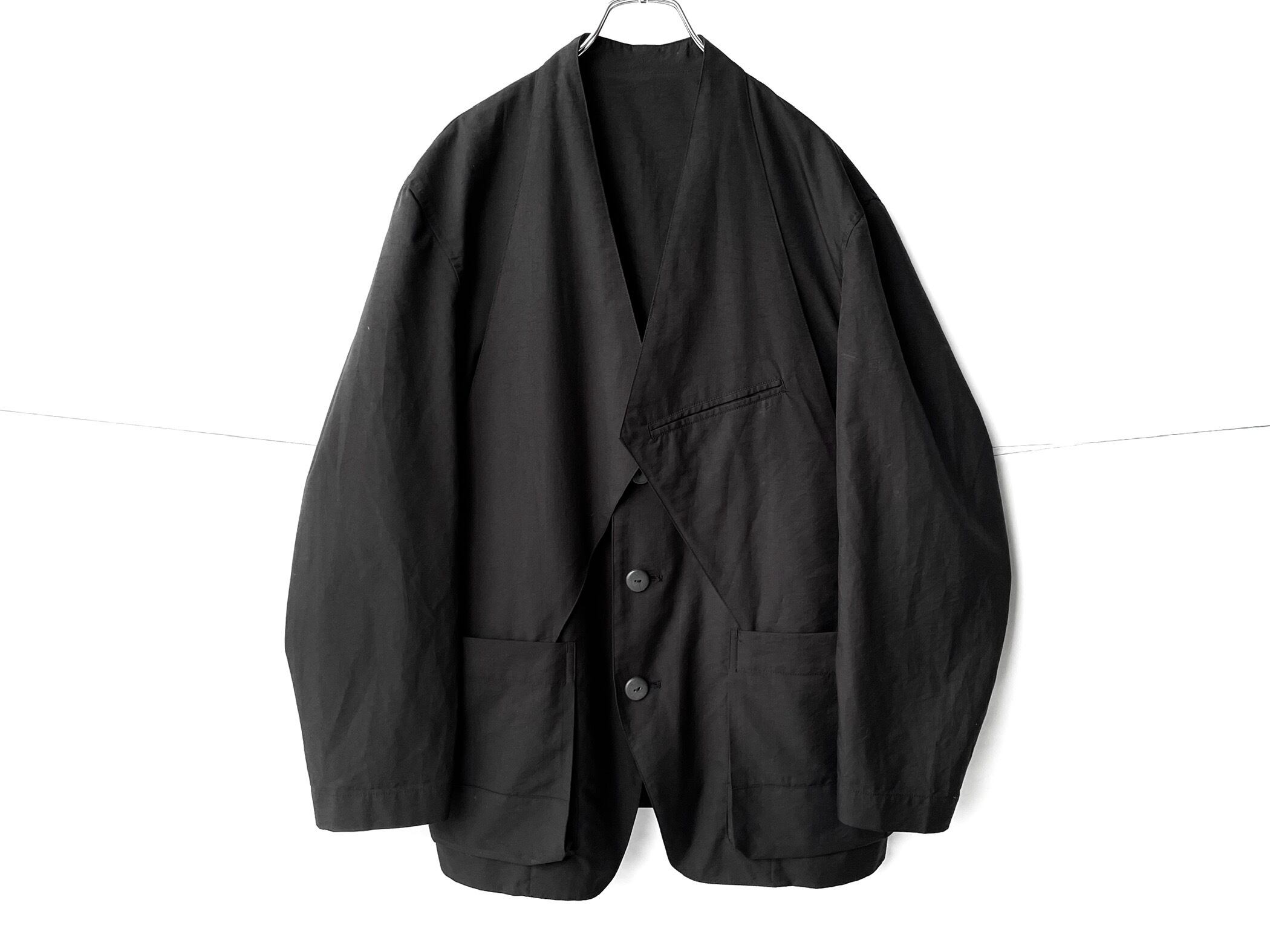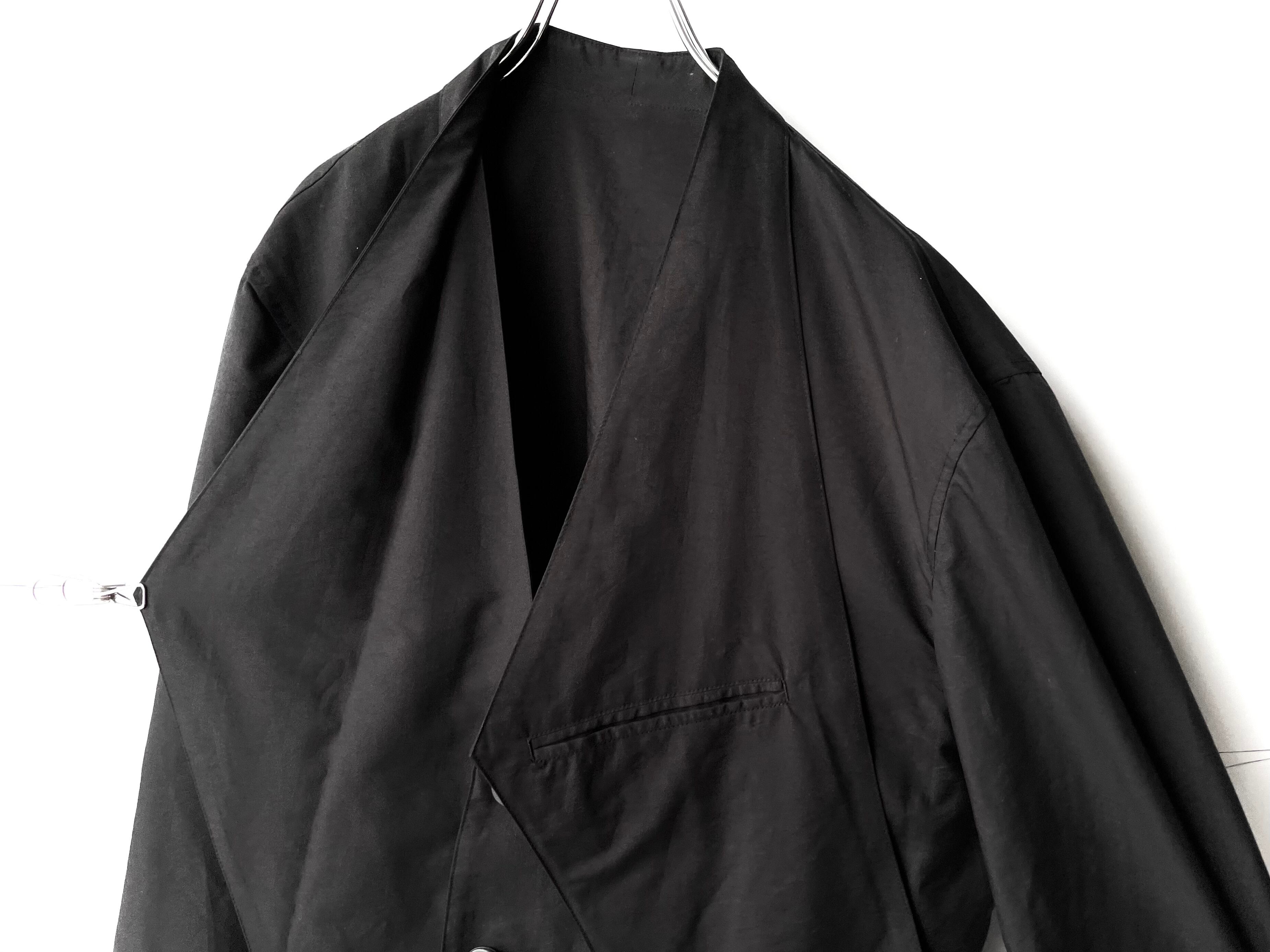 首裏からポケット内へと伸びる肥大化した変形ラペルを折り紙の袋折りの様に畳み、形作られたこの一着独自のディテール。