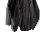 カラーレスのテーラードカバーオールに、変形のベストをレイヤードした様な特別なルックス。