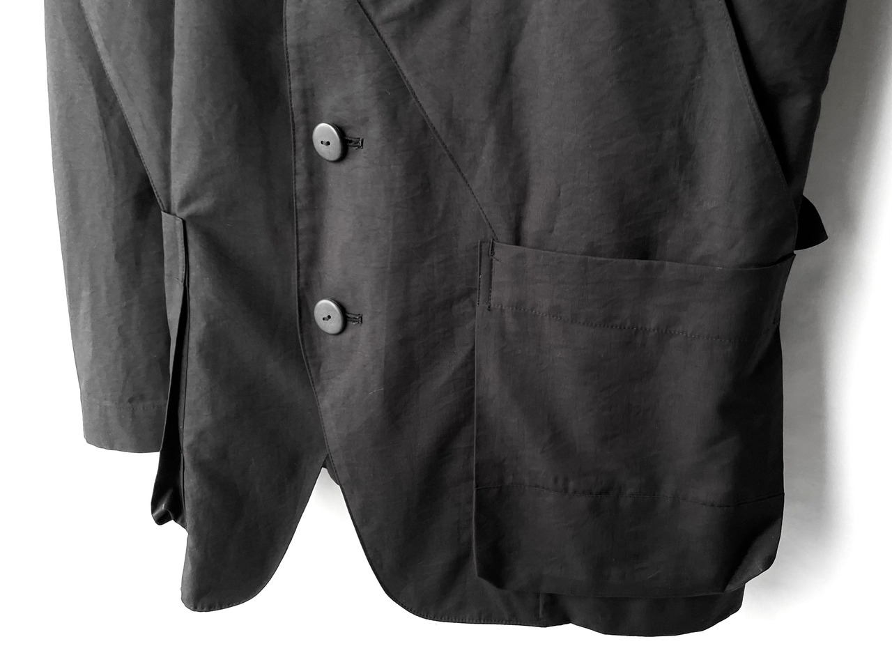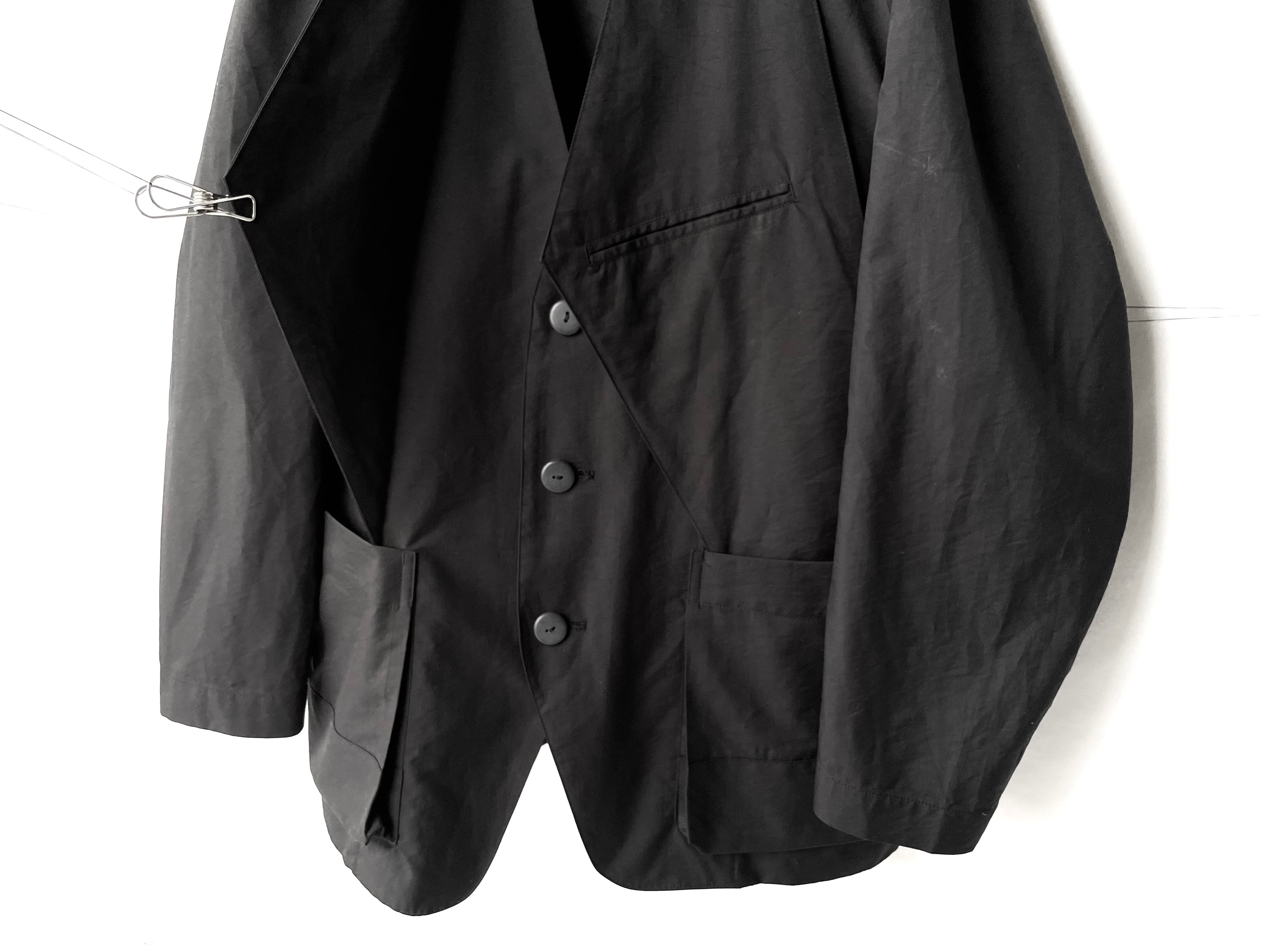 The unique detail of this piece is the enlarged deformed lapel that extends from the back of the neck into the pocket, folded like an origami bag.