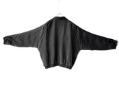A wide silhouette with plenty of excess fabric, and unique dolman sleeves with fabric continuing under the armpits.