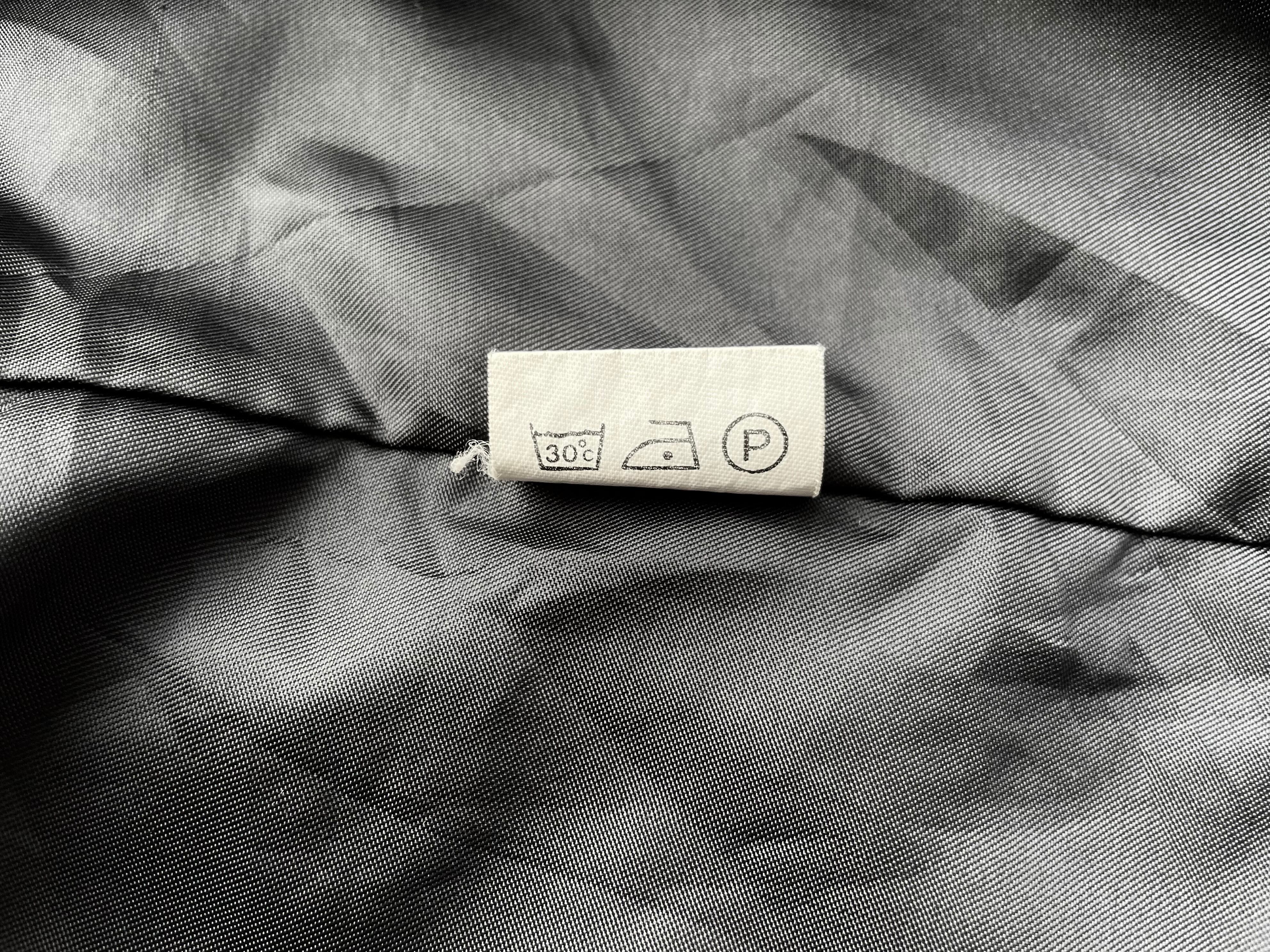 前裾で緩やかな弧を描く墨黒のサーマル生地の裾リブ。