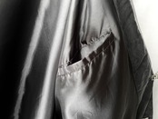 スナップ着脱式のフロントポケット、小ぶりな内生地が付く特殊な構成の2枚襟。