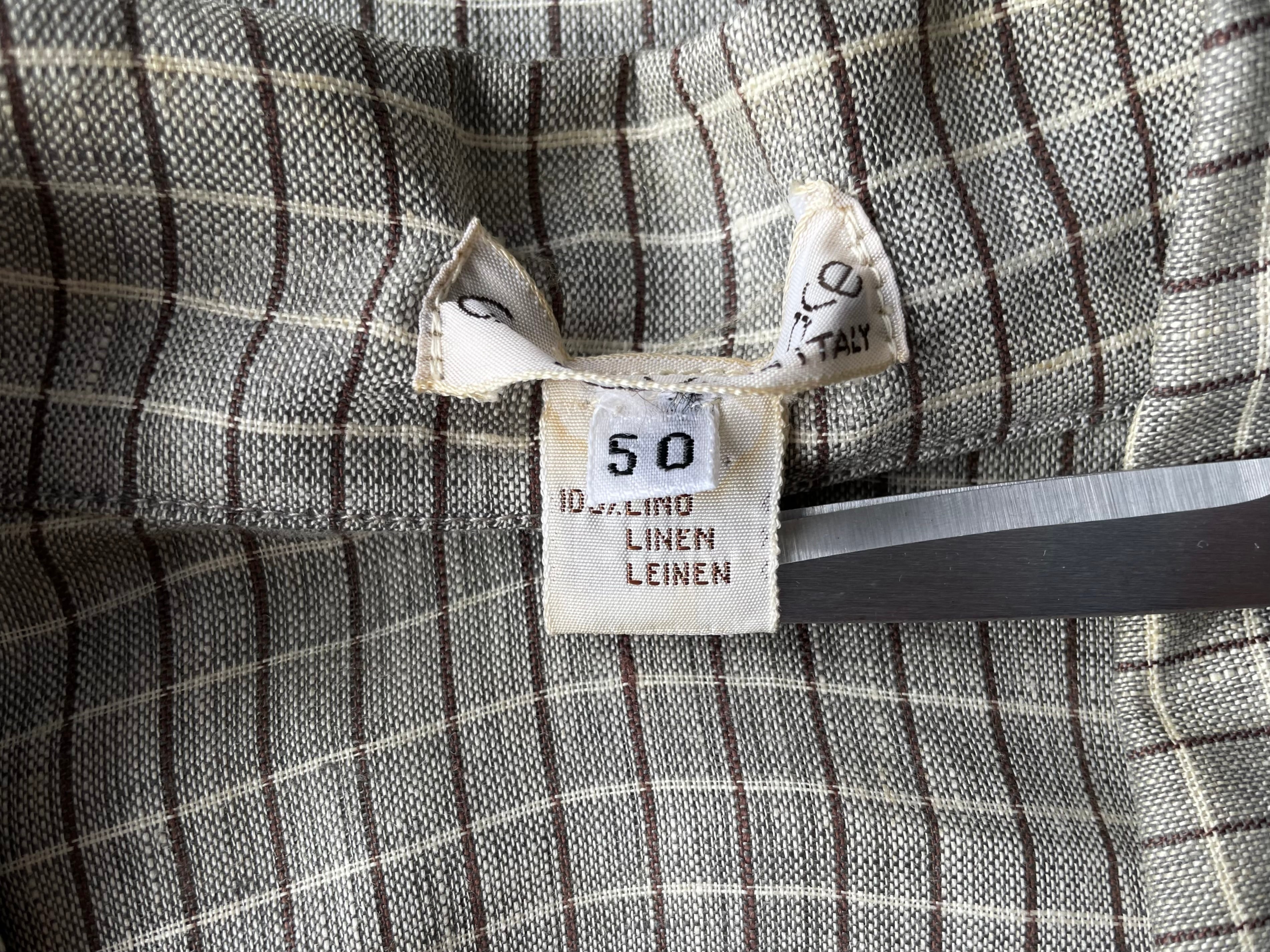 A fine woven patterned fabric with dark brown/ivory threads on a light gray base.