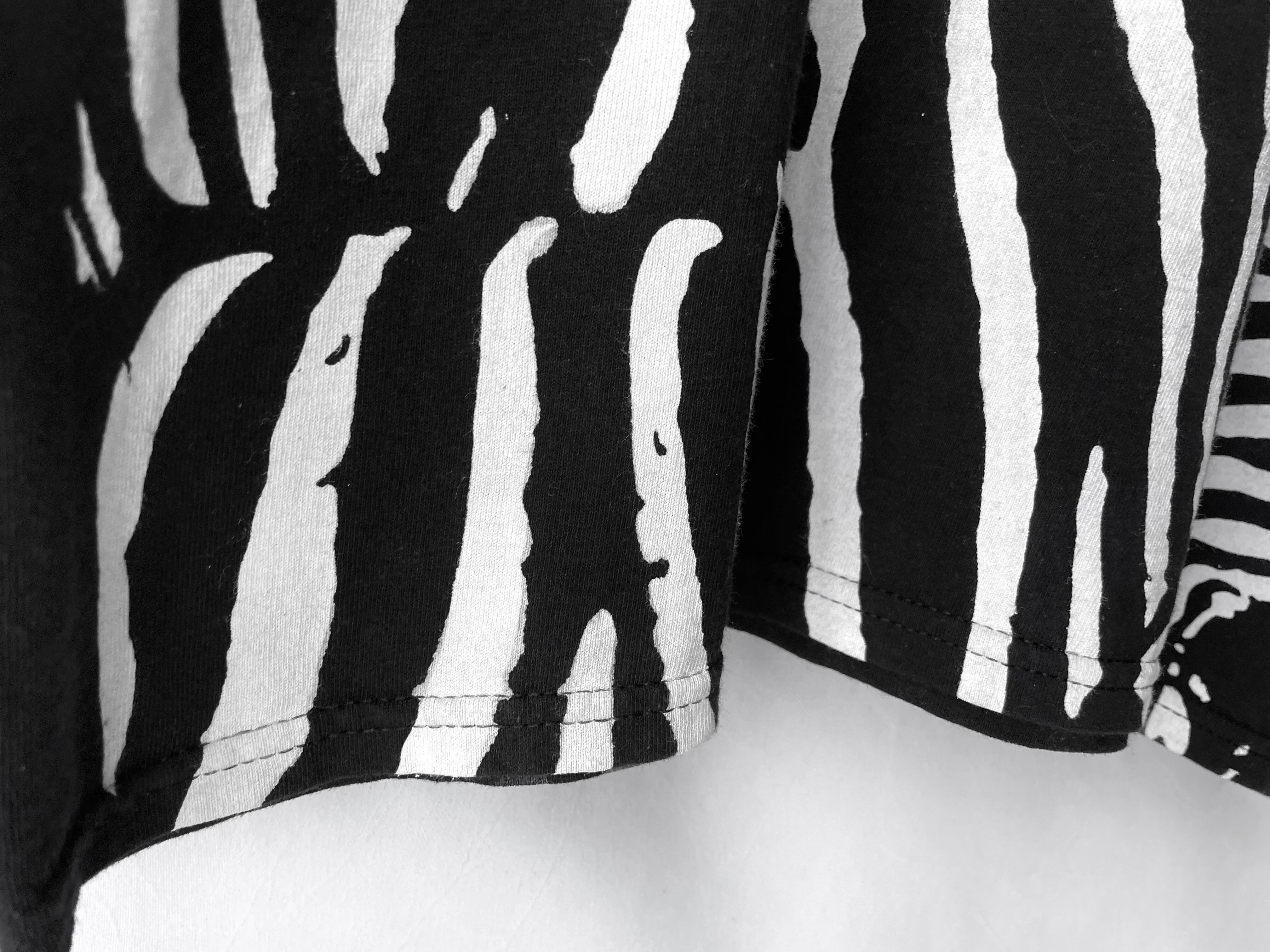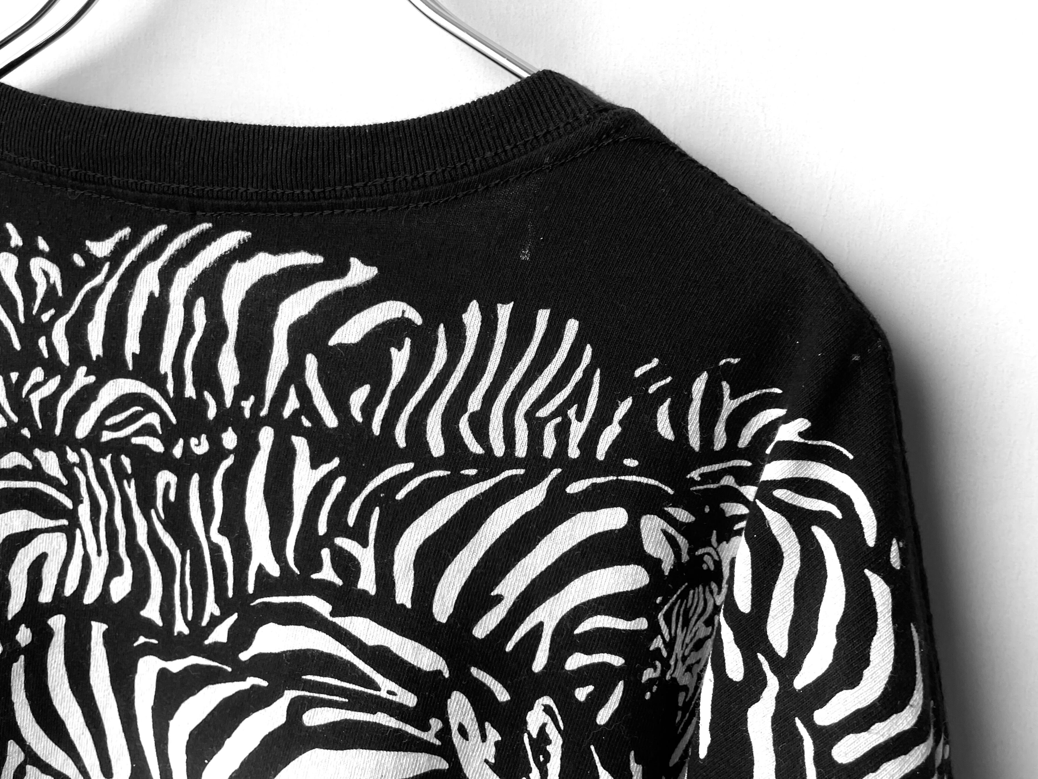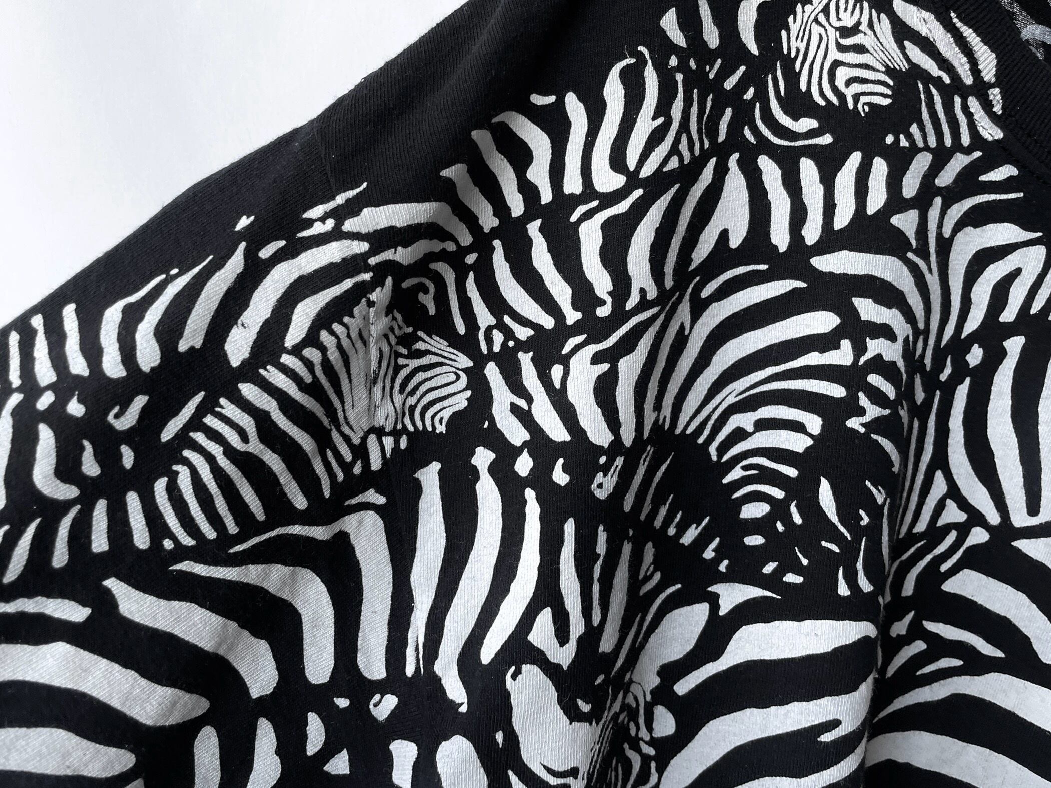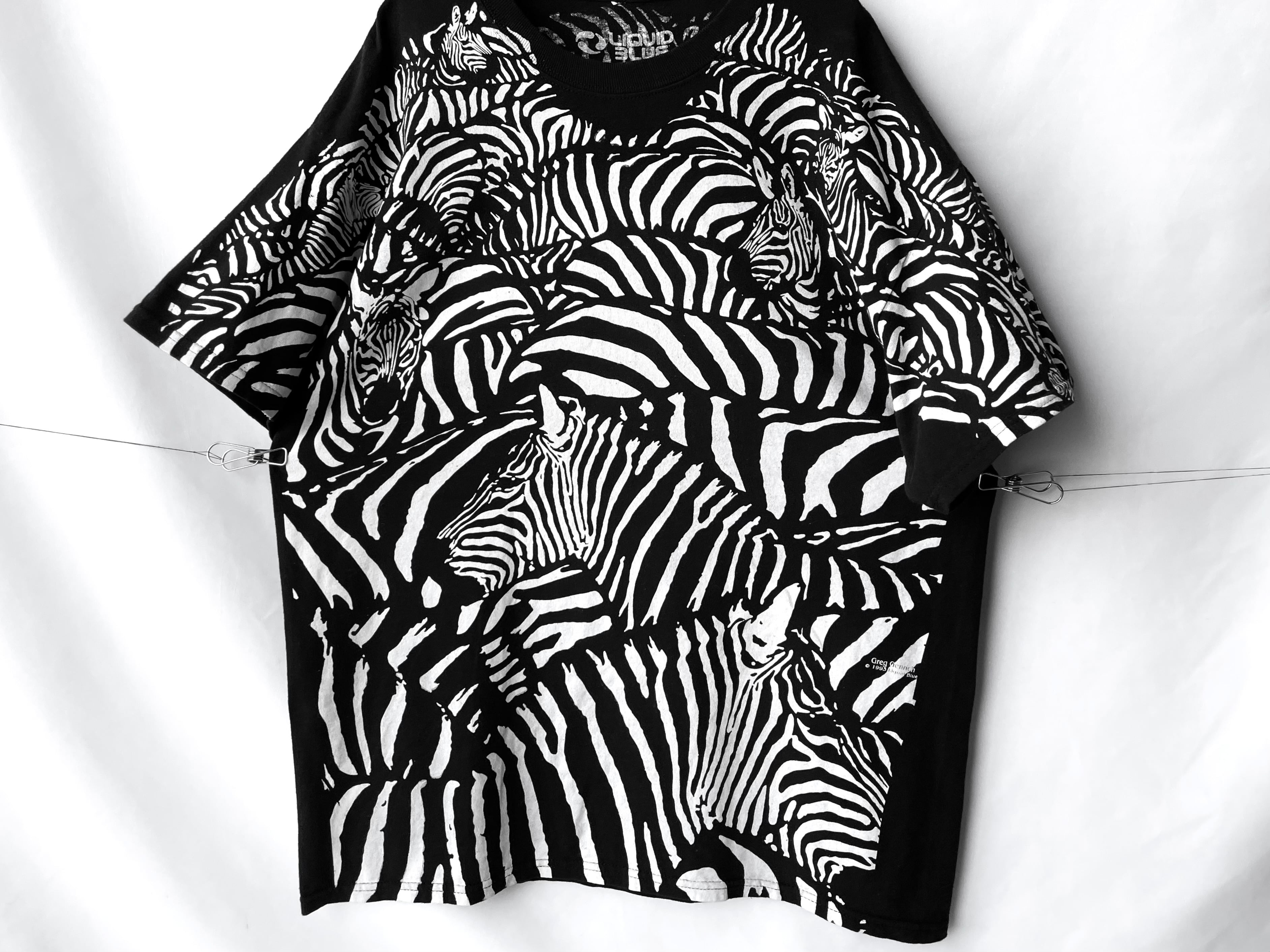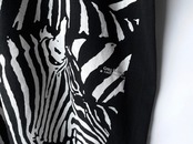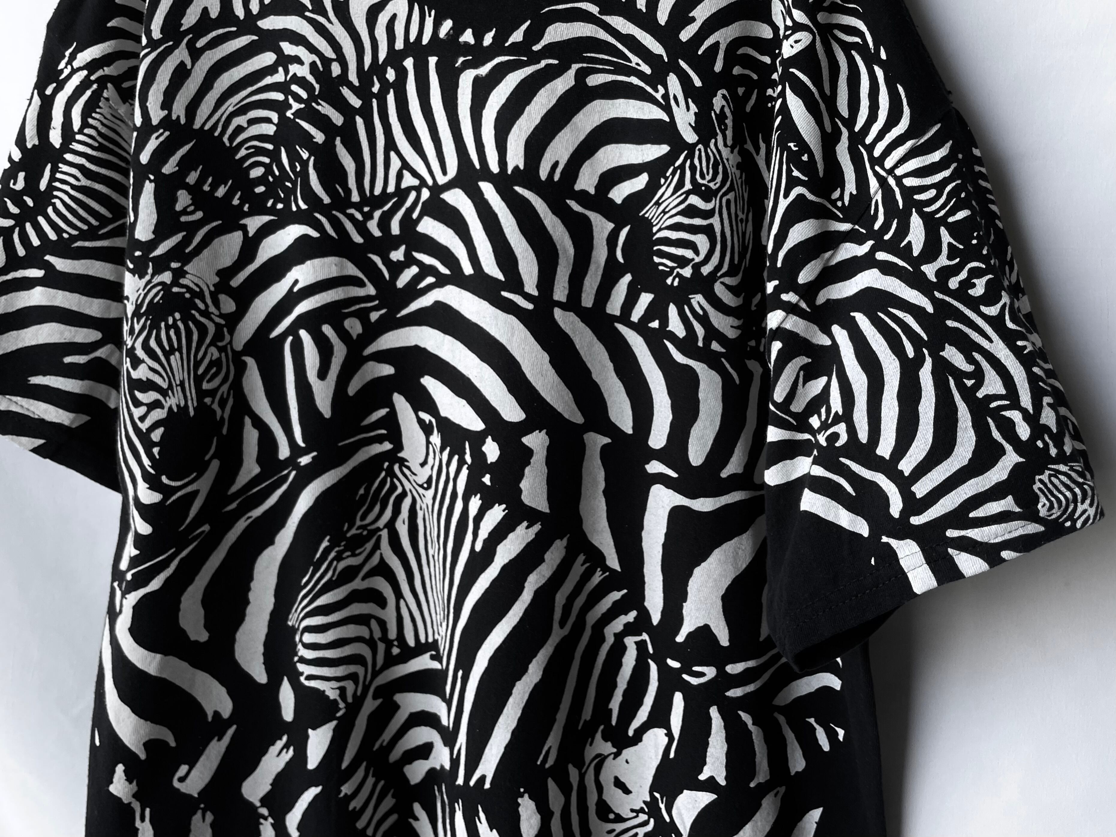 A unique all-over pattern with white print on a black body and zebras intertwined all over the body.