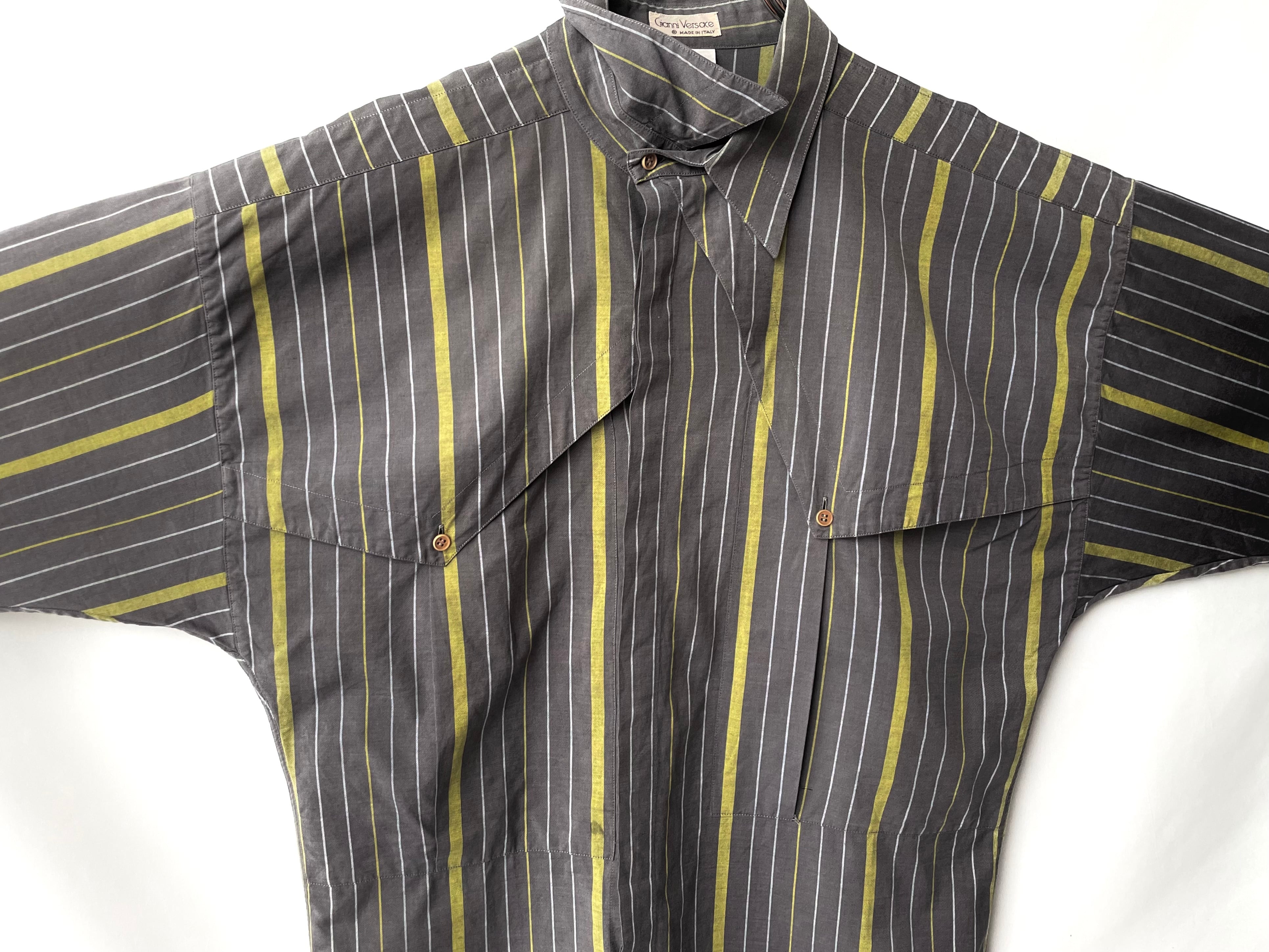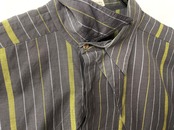 A small collar with stitching, and a fly placket that overlaps deeply at the front.