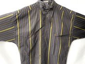 ステッチが乗った小ぶりな襟、フロント深く重なり合う比翼の前立て。