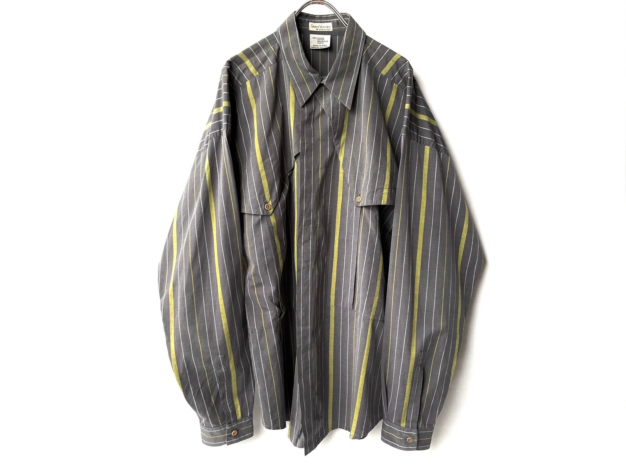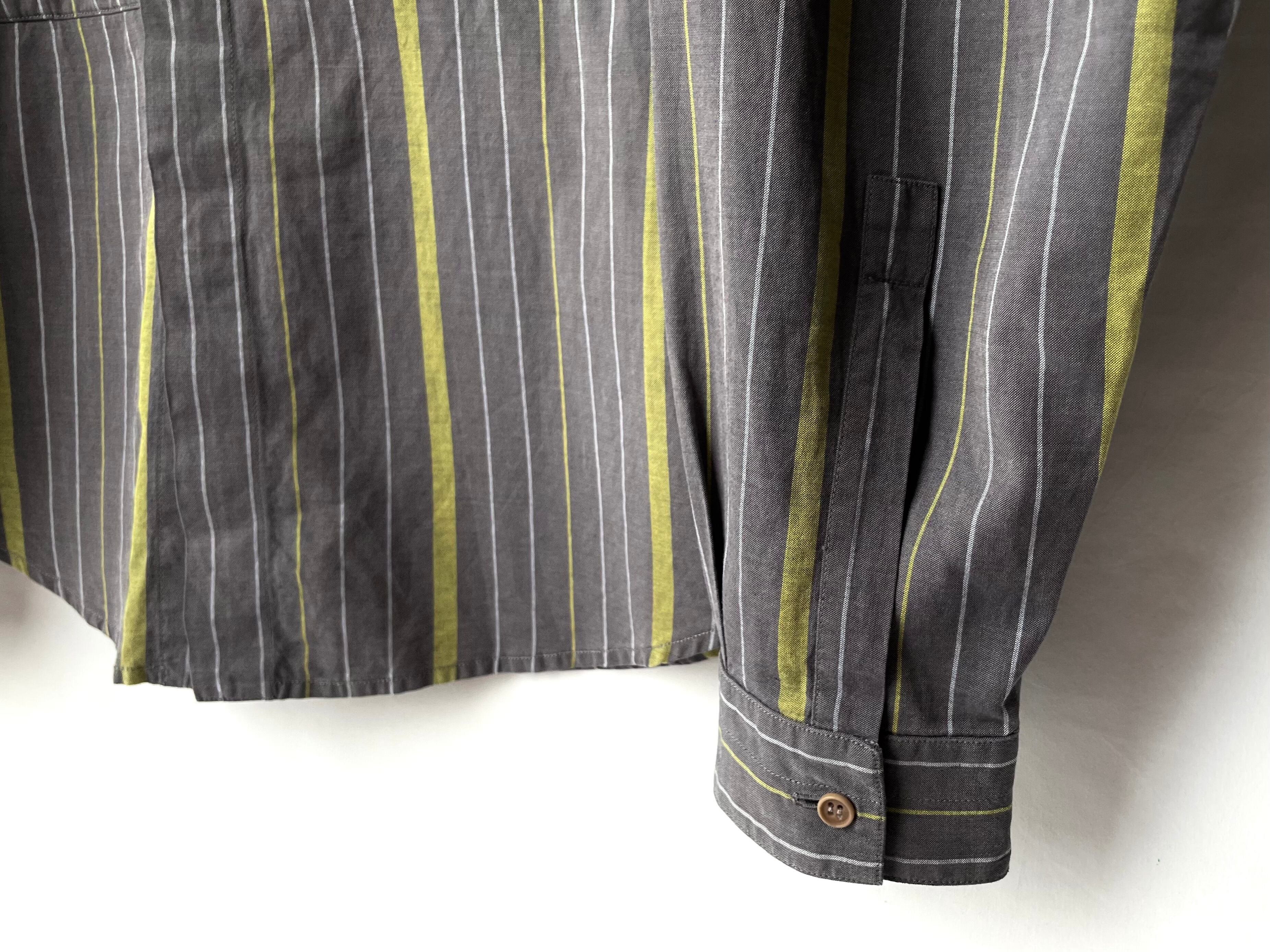 ぼやけたグレー/アイボリー/カーキイエローの変則的なストライプパターン。