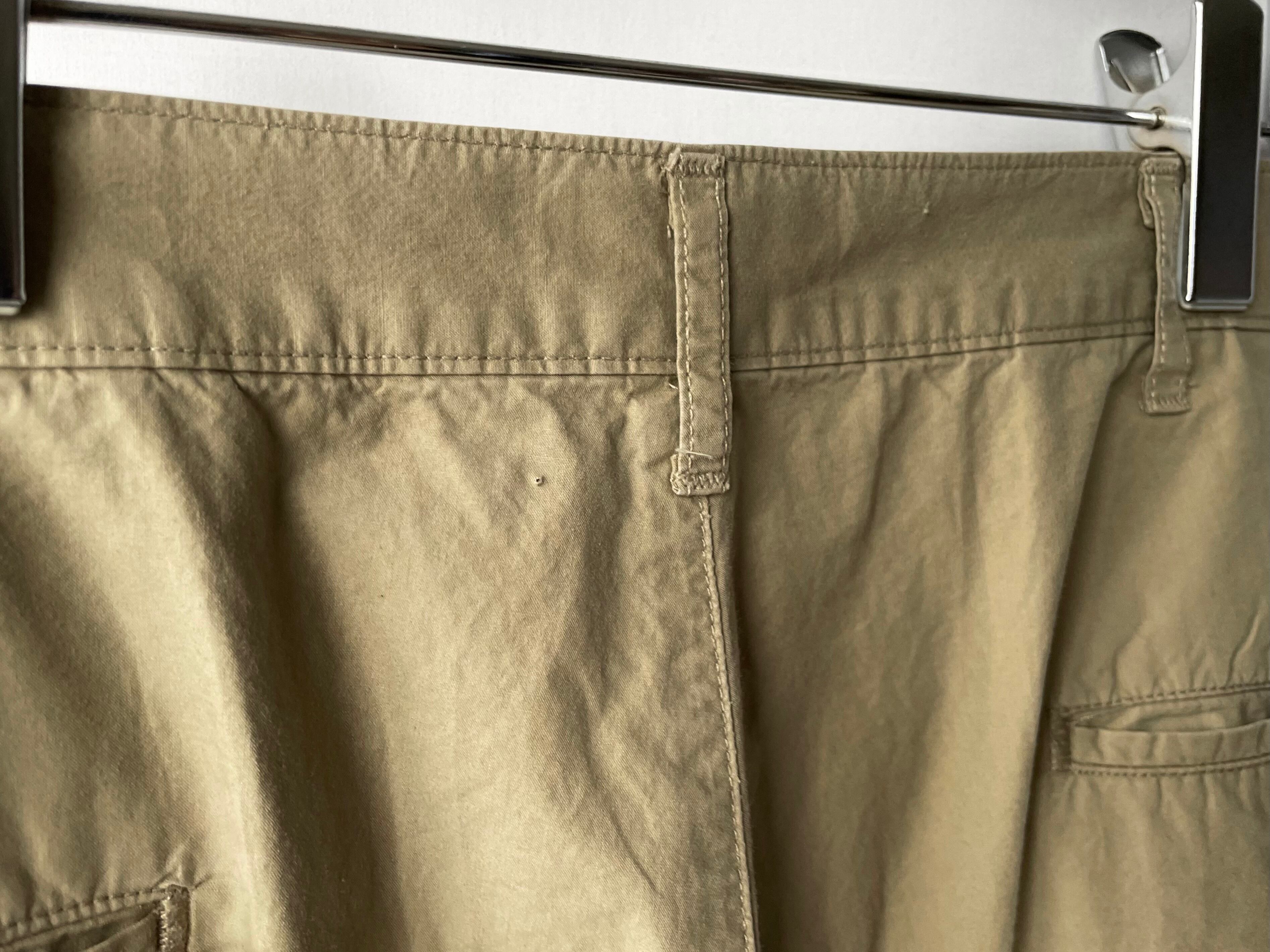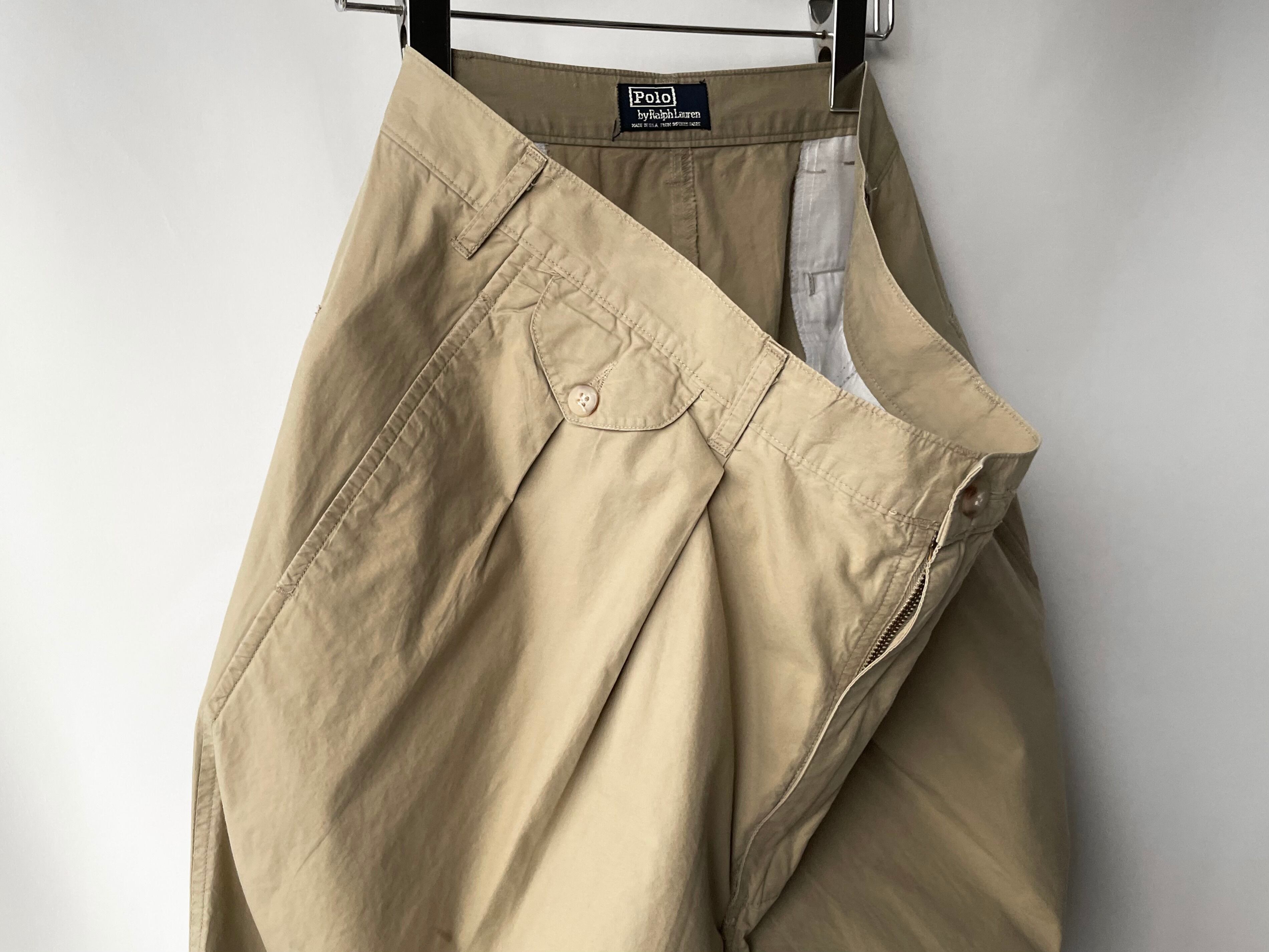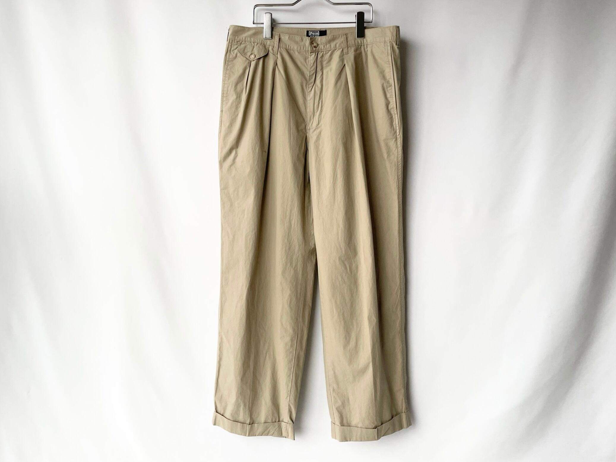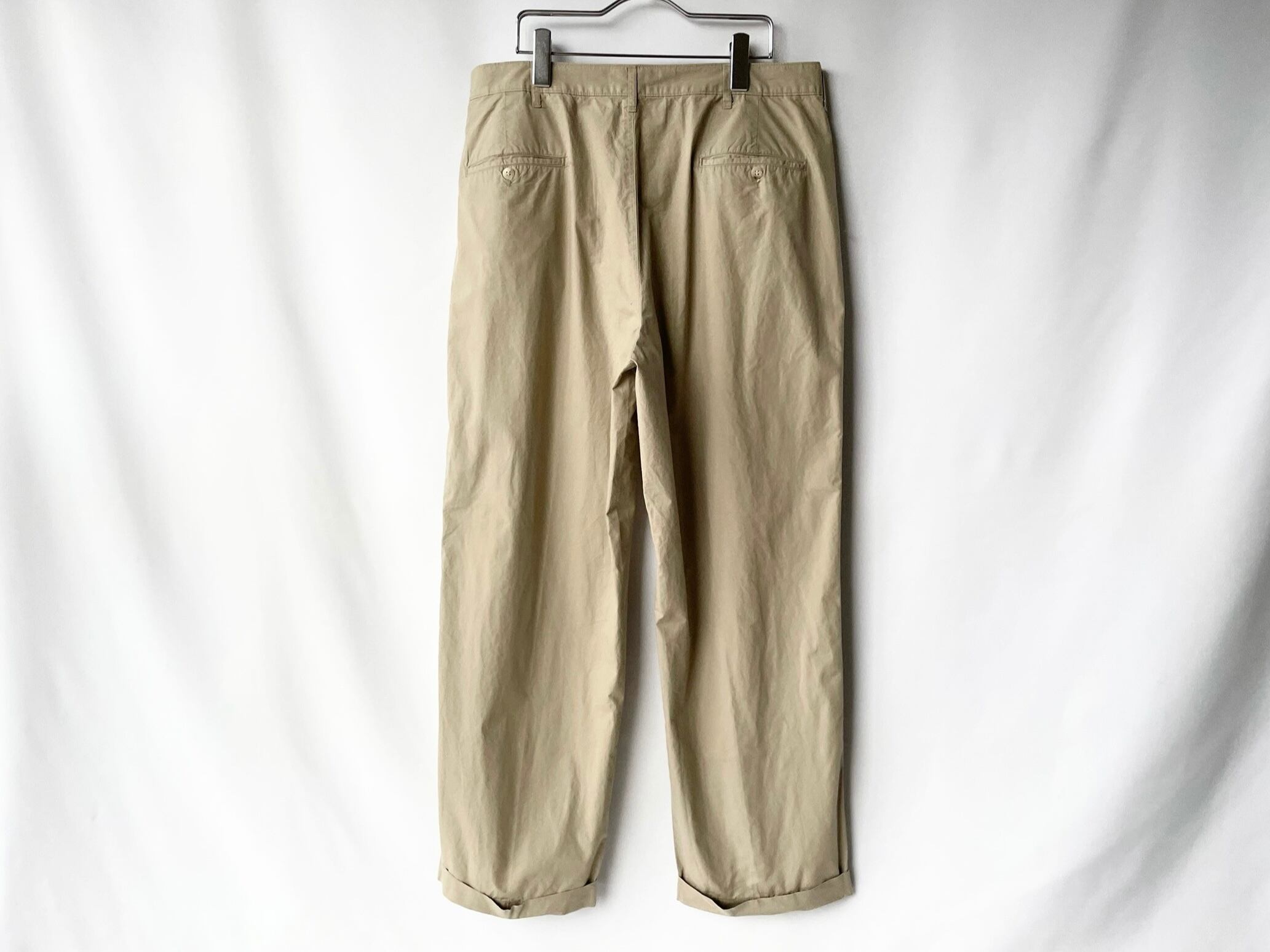淡いベージュのコットンポプリンで仕立てられたワイドスラックス。